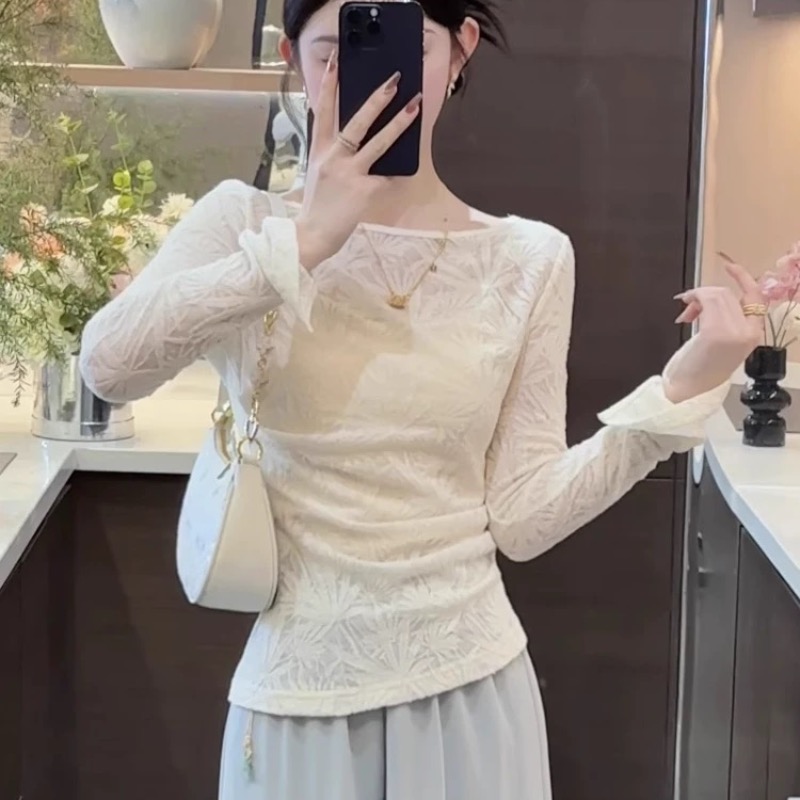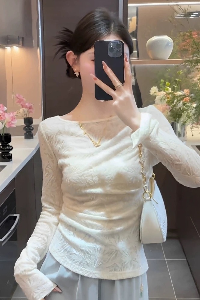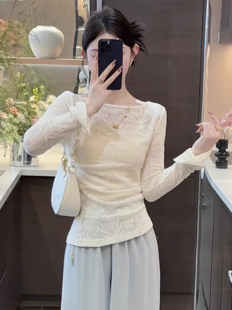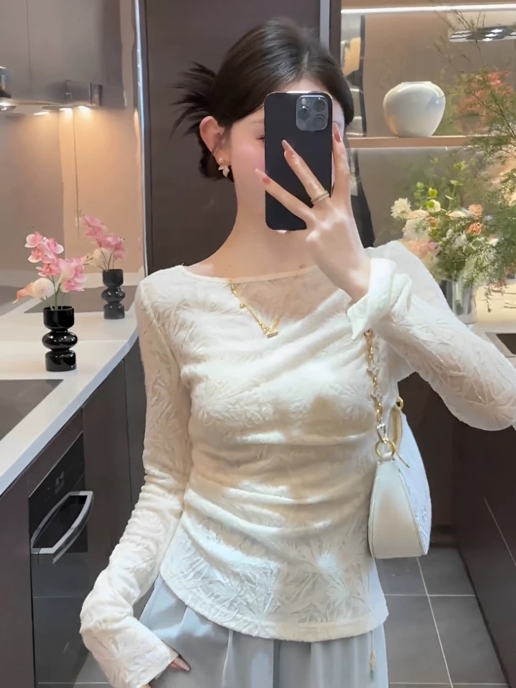 MY14703# 法式高级感钩花喇叭袖上衣新款米白色小衫设计感小众女裝貨源服裝批發