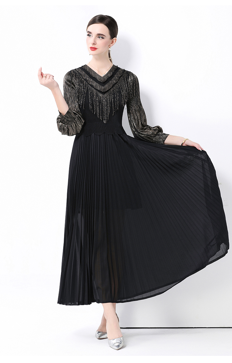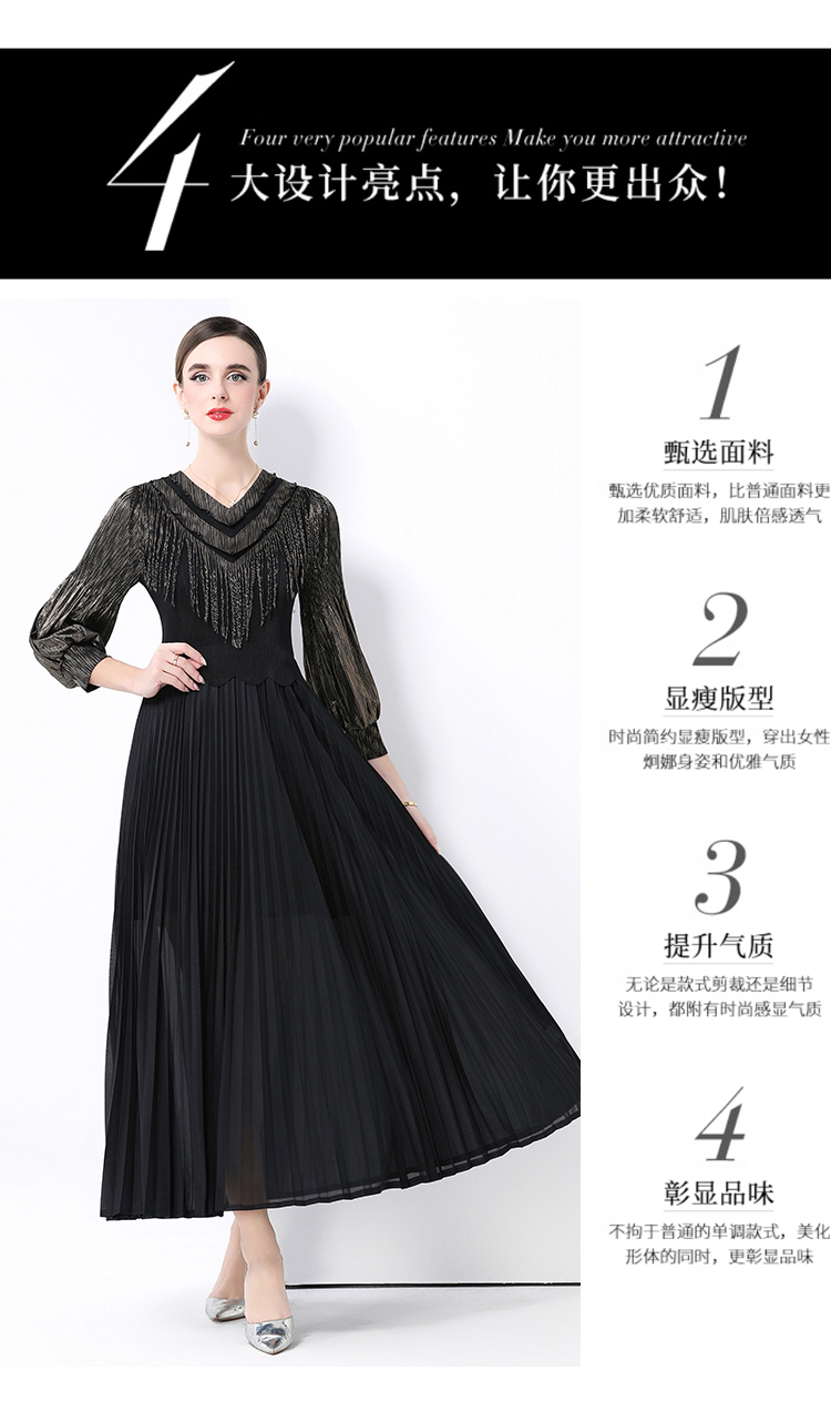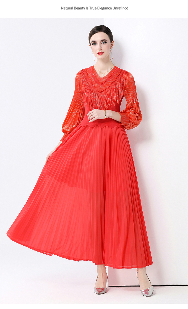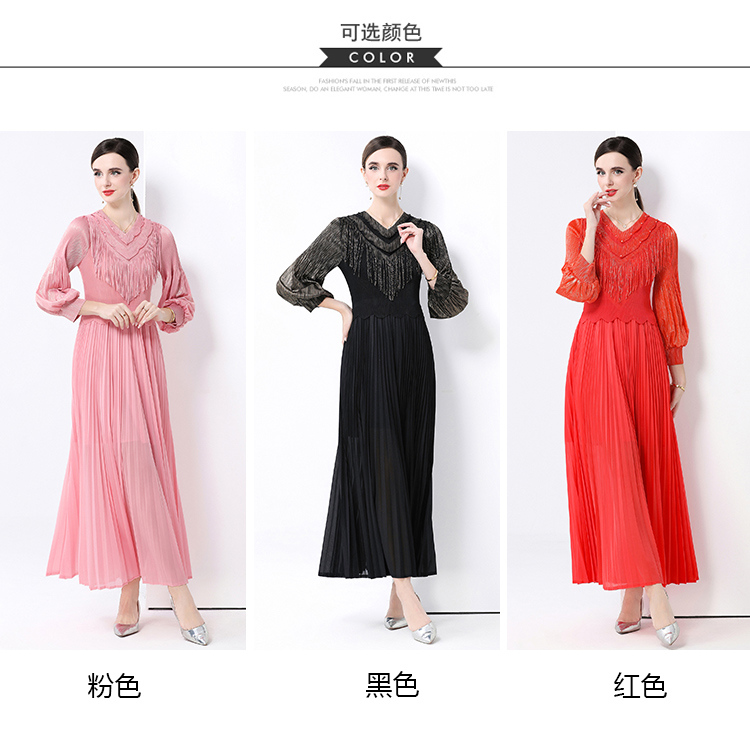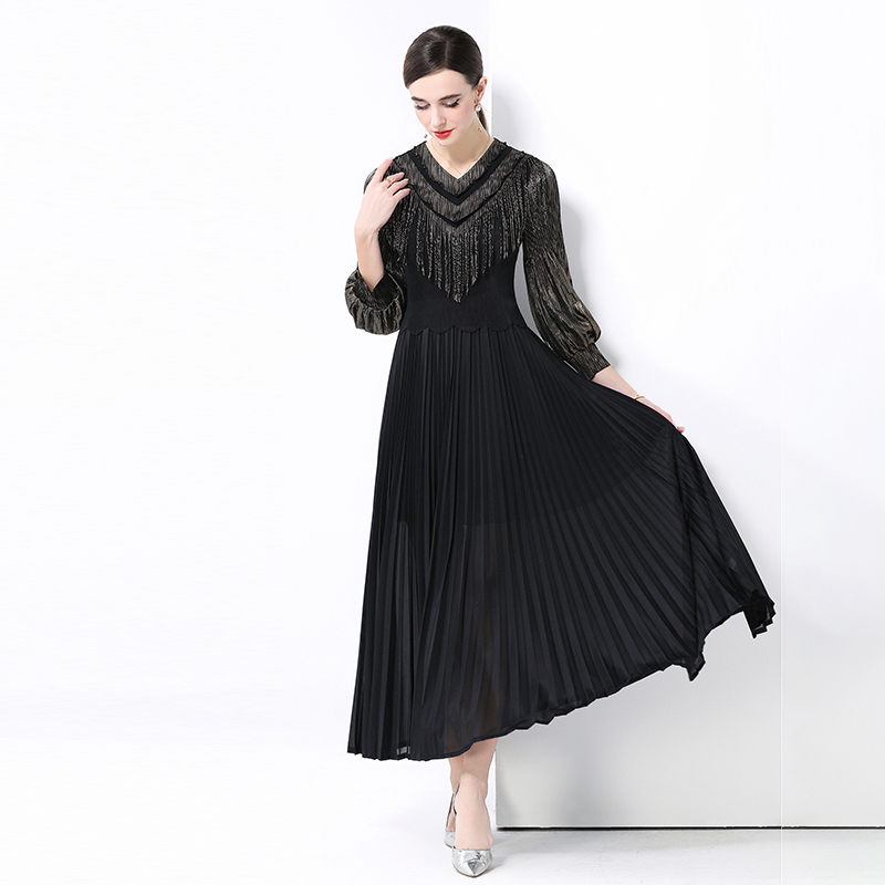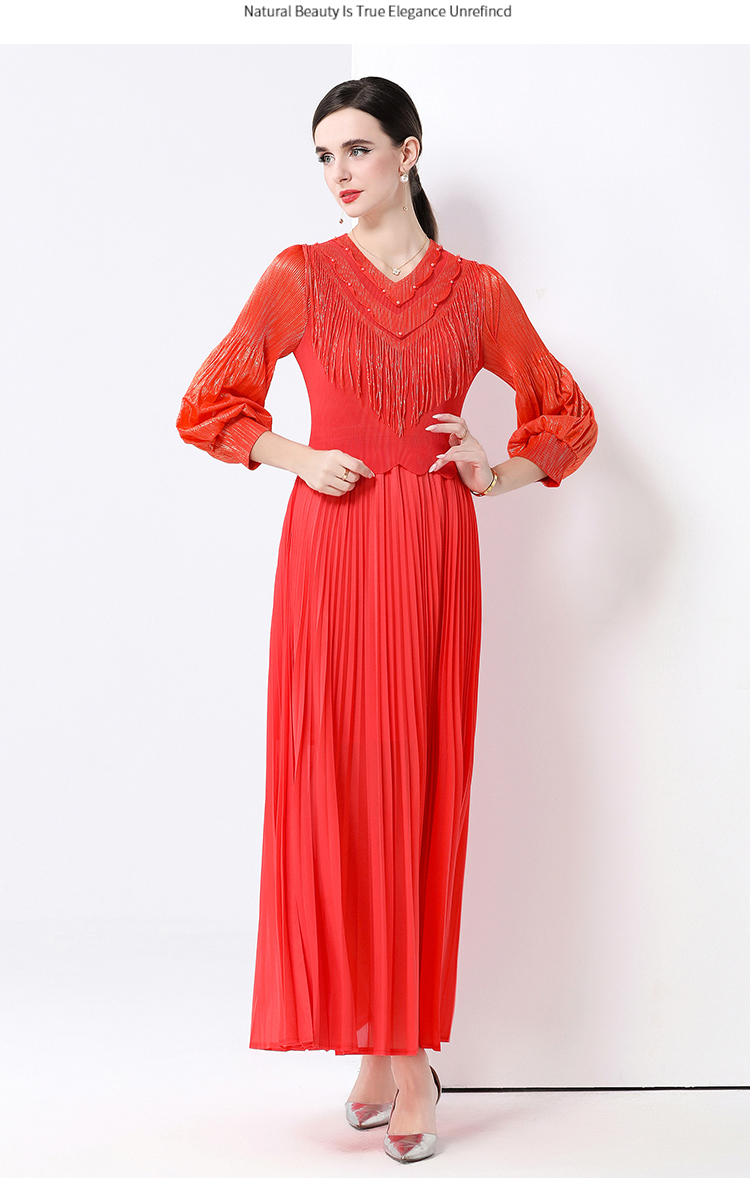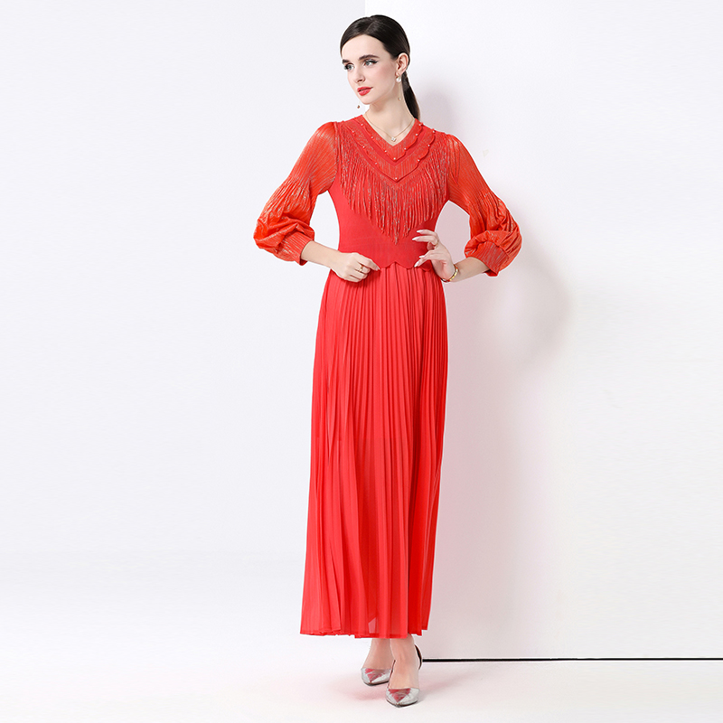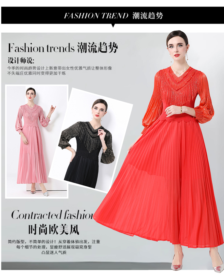MY14709# 复古重工钉珠烫金喇叭袖褶皱连衣裙女高级感新款过膝礼服裙子长裙女裝貨源服裝批發
