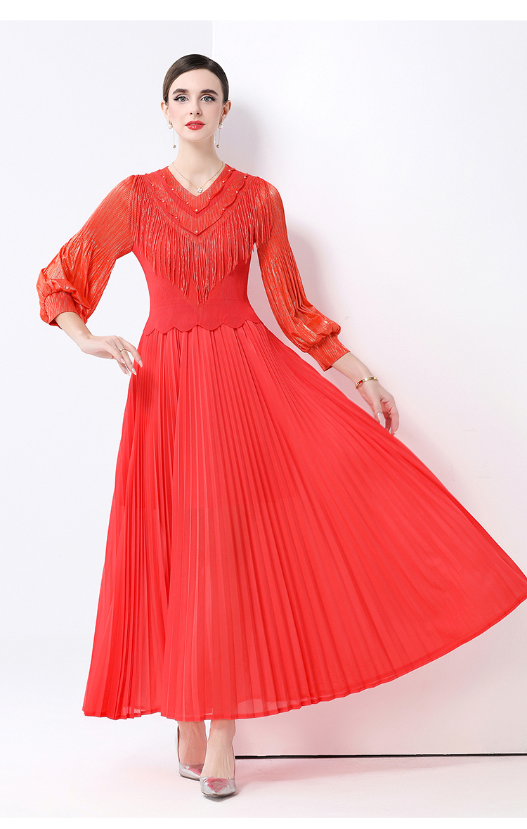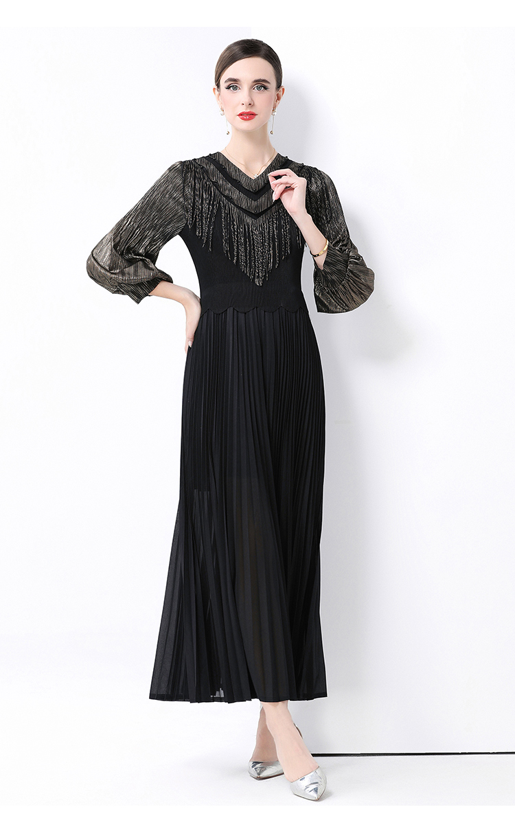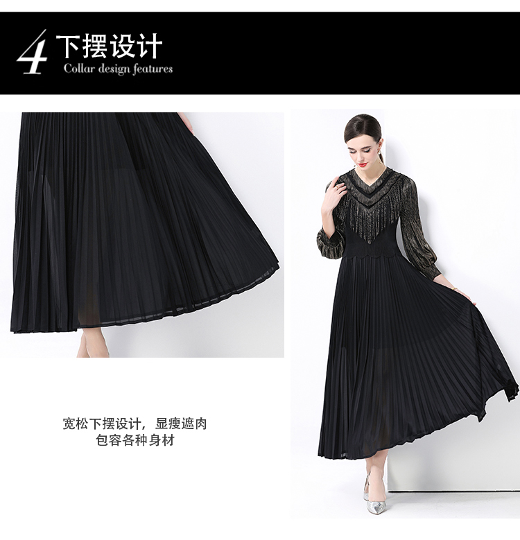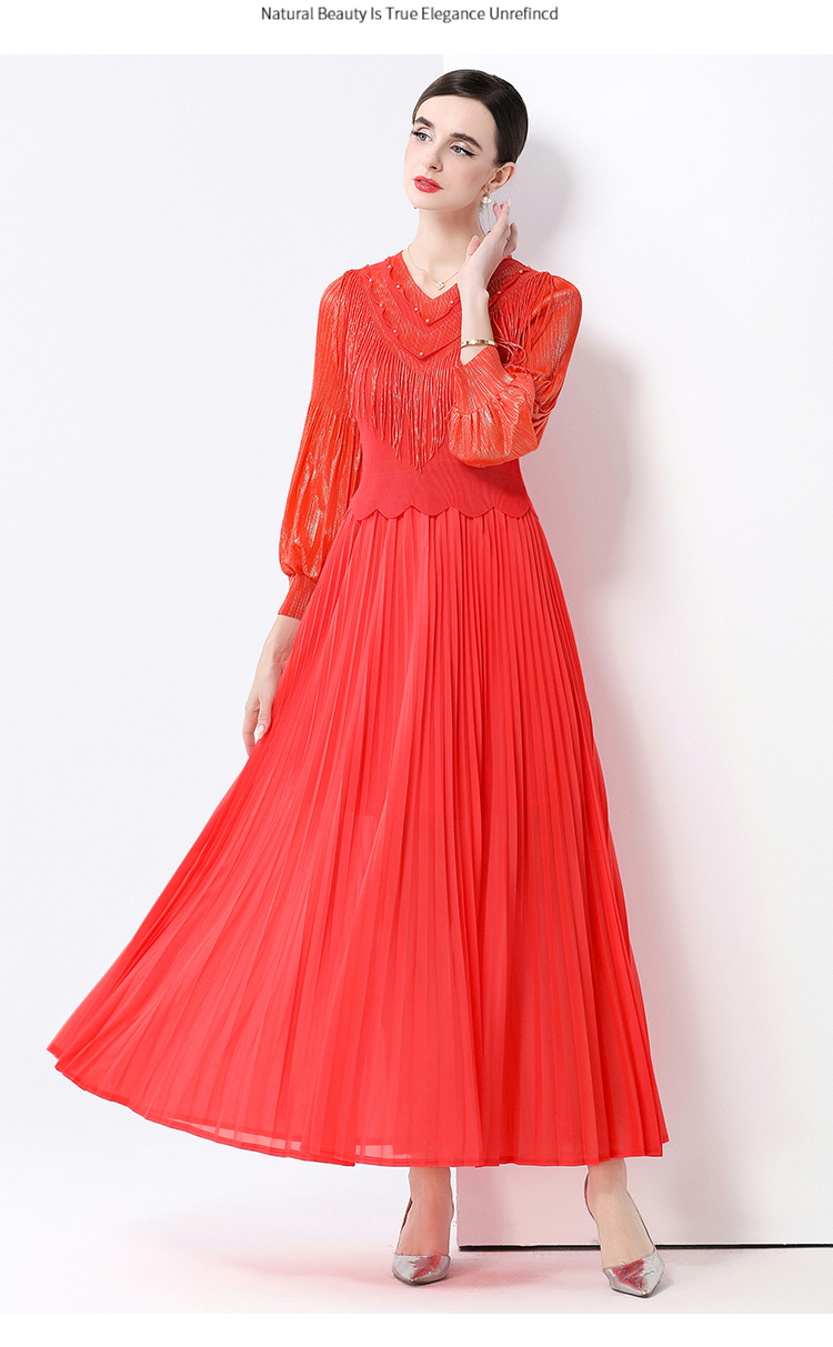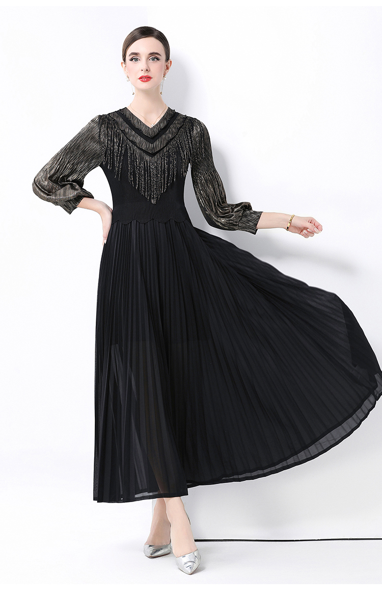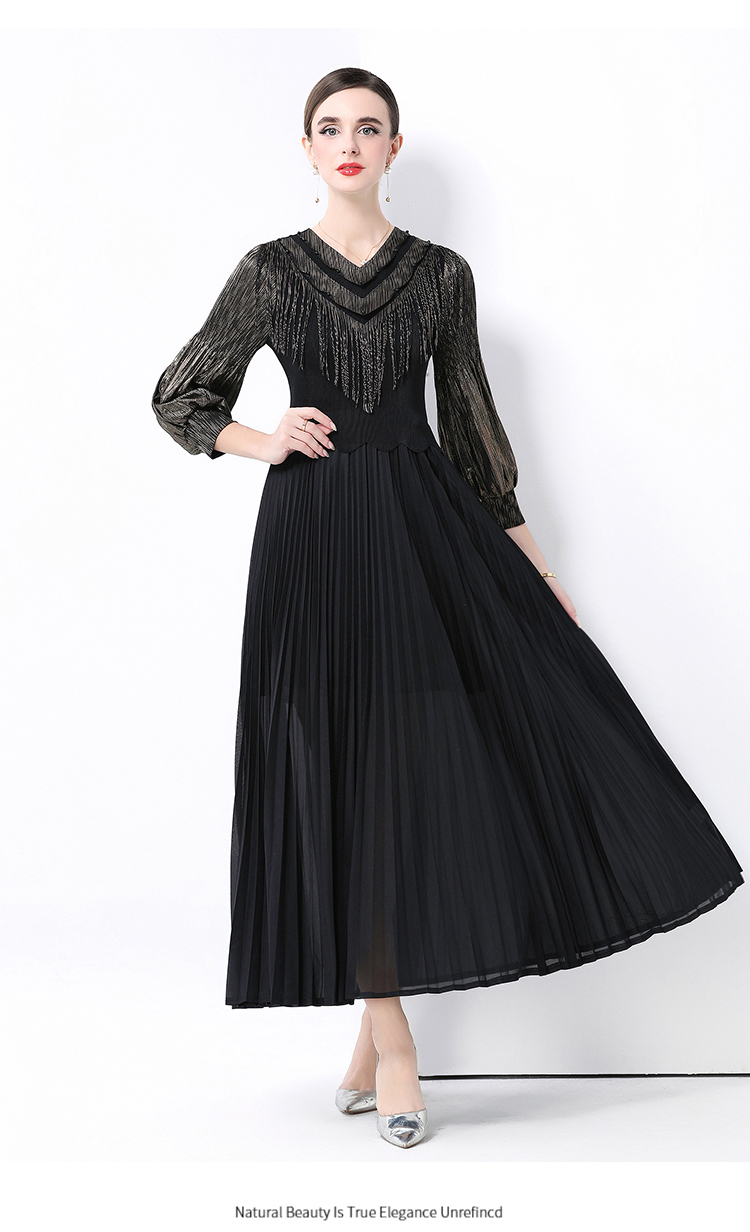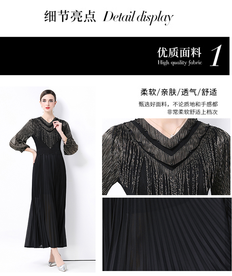 MY14709# 复古重工钉珠烫金喇叭袖褶皱连衣裙女高级感新款过膝礼服裙子长裙女裝貨源服裝批發