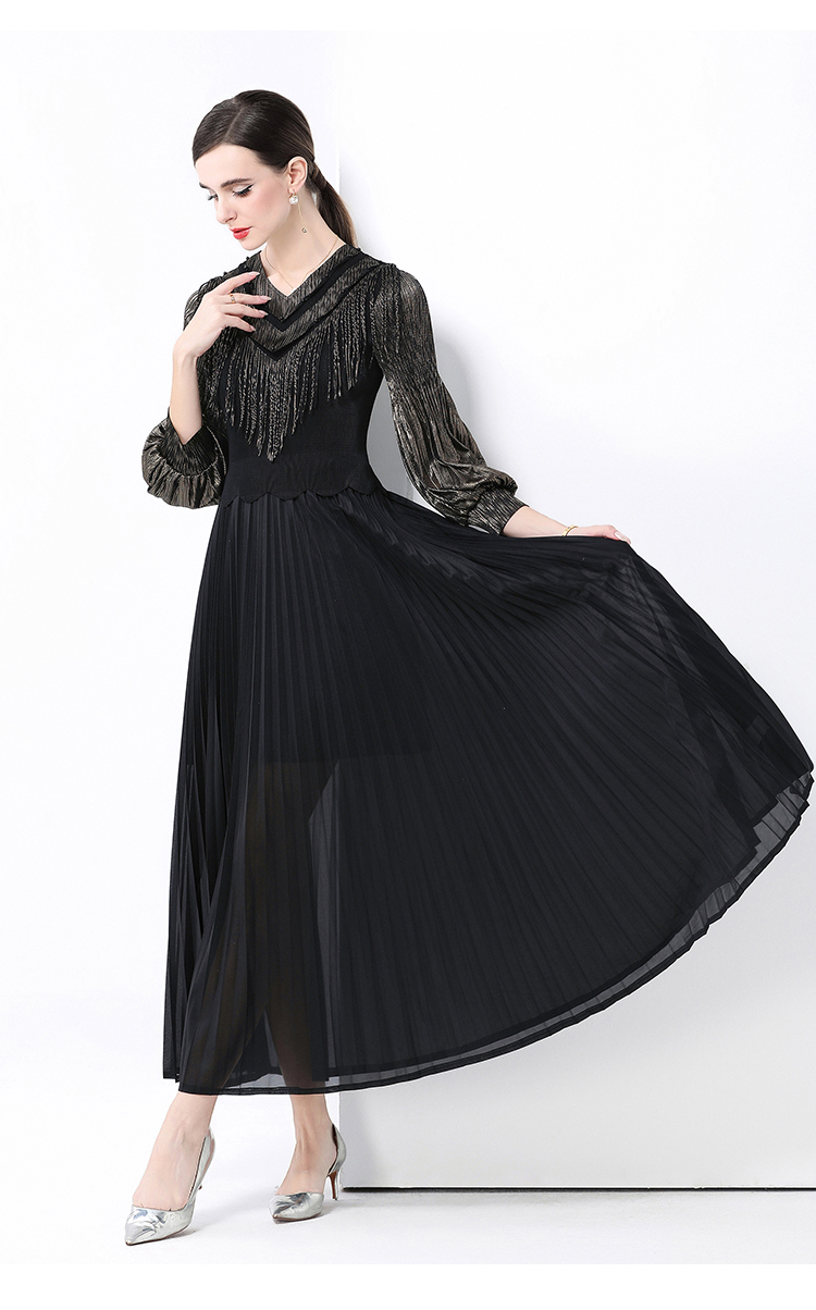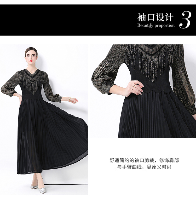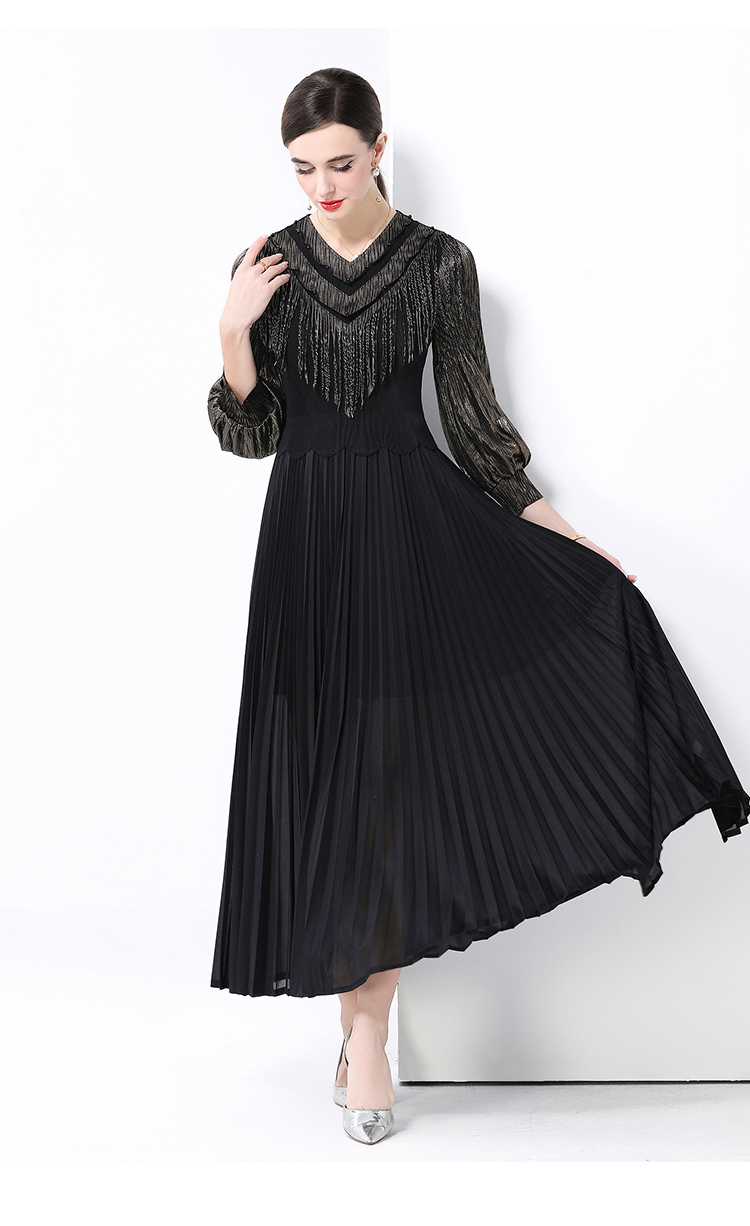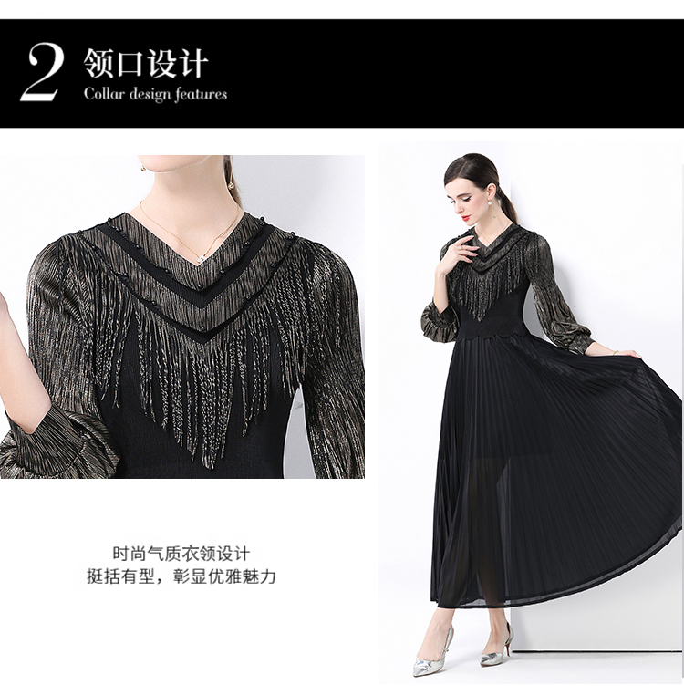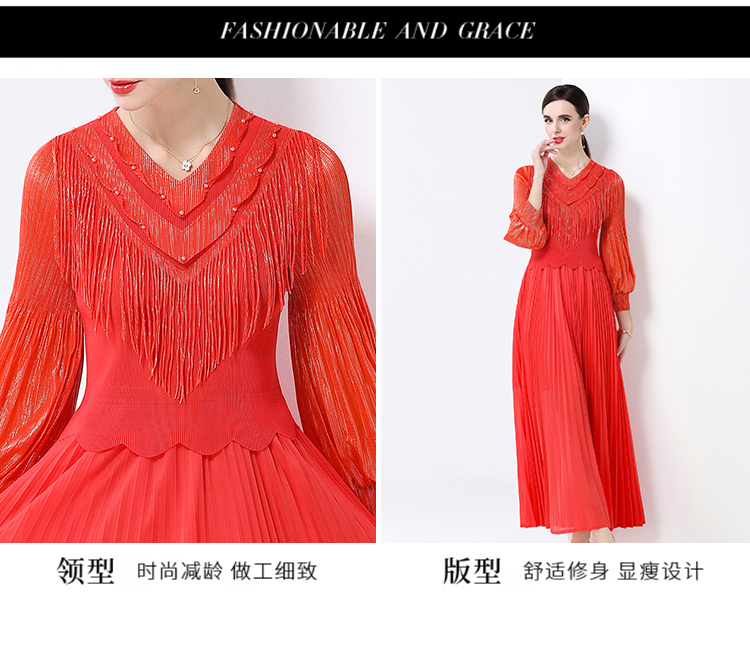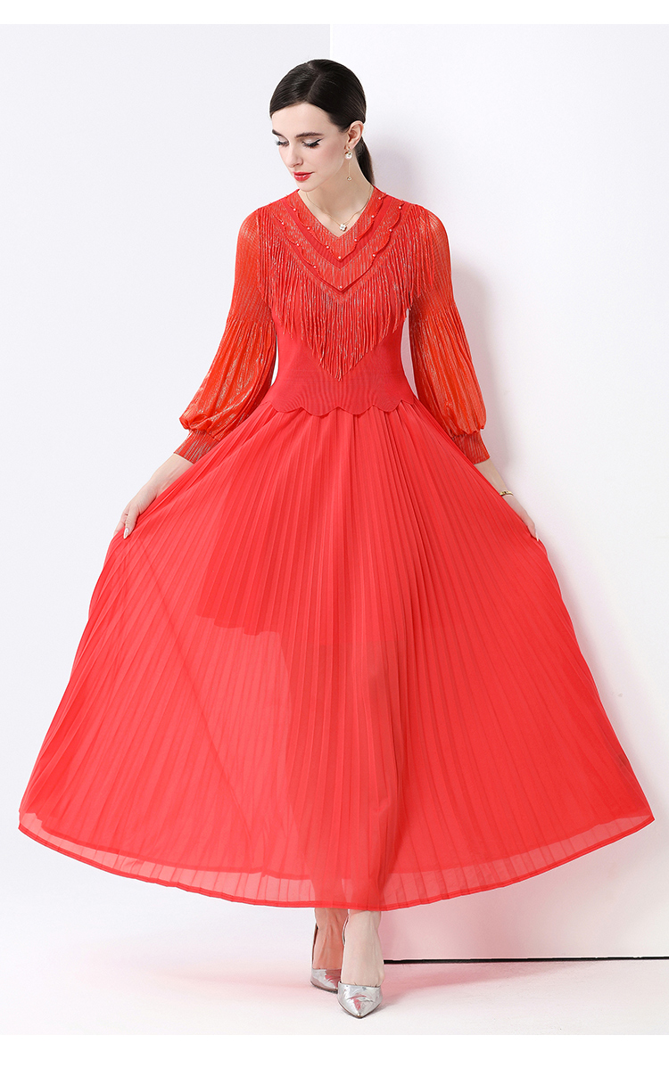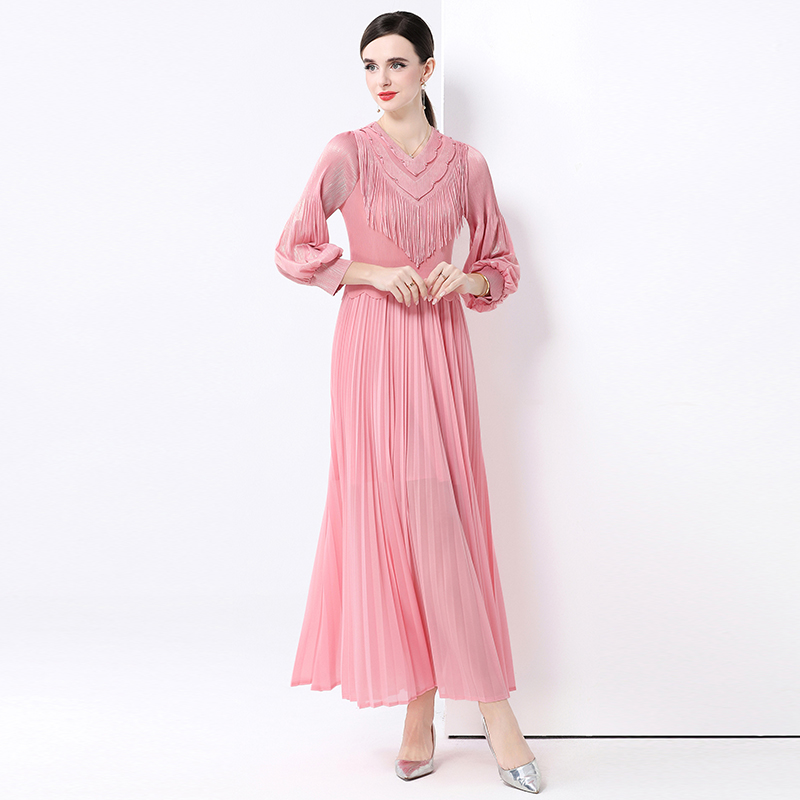 MY14709# 复古重工钉珠烫金喇叭袖褶皱连衣裙女高级感新款过膝礼服裙子长裙女裝貨源服裝批發