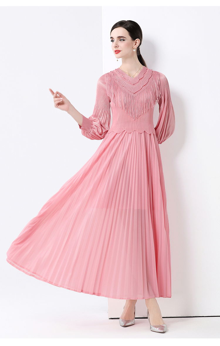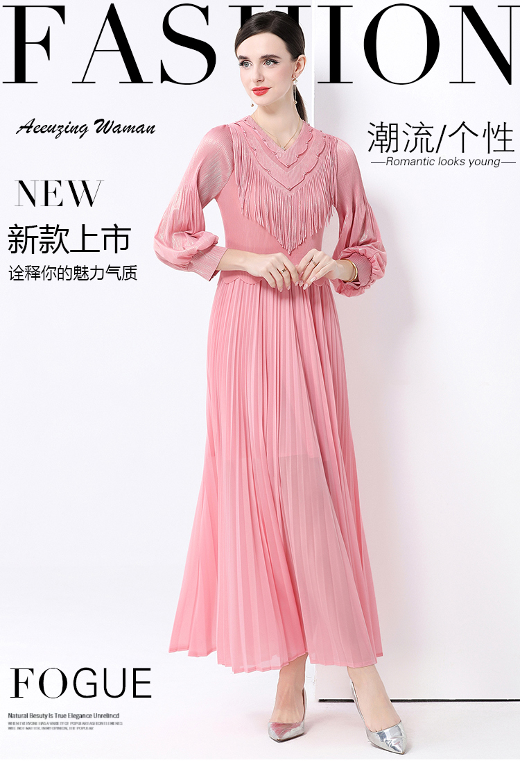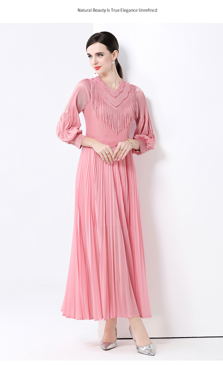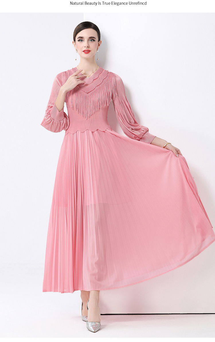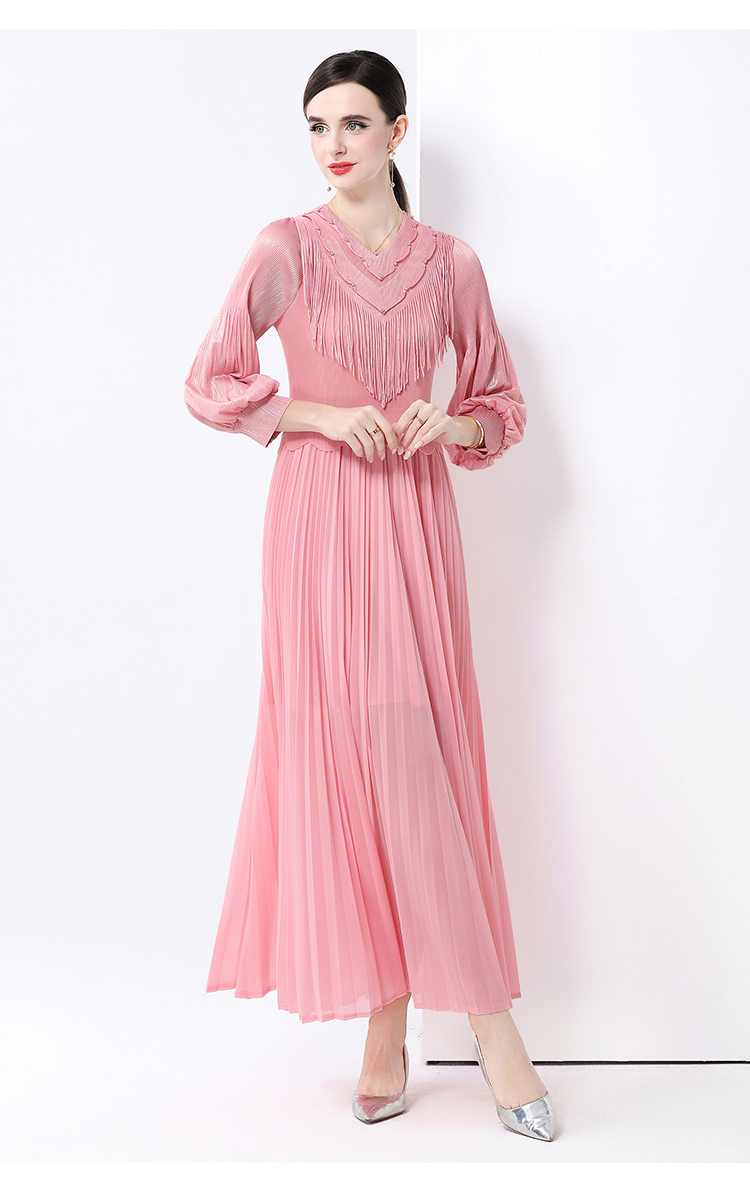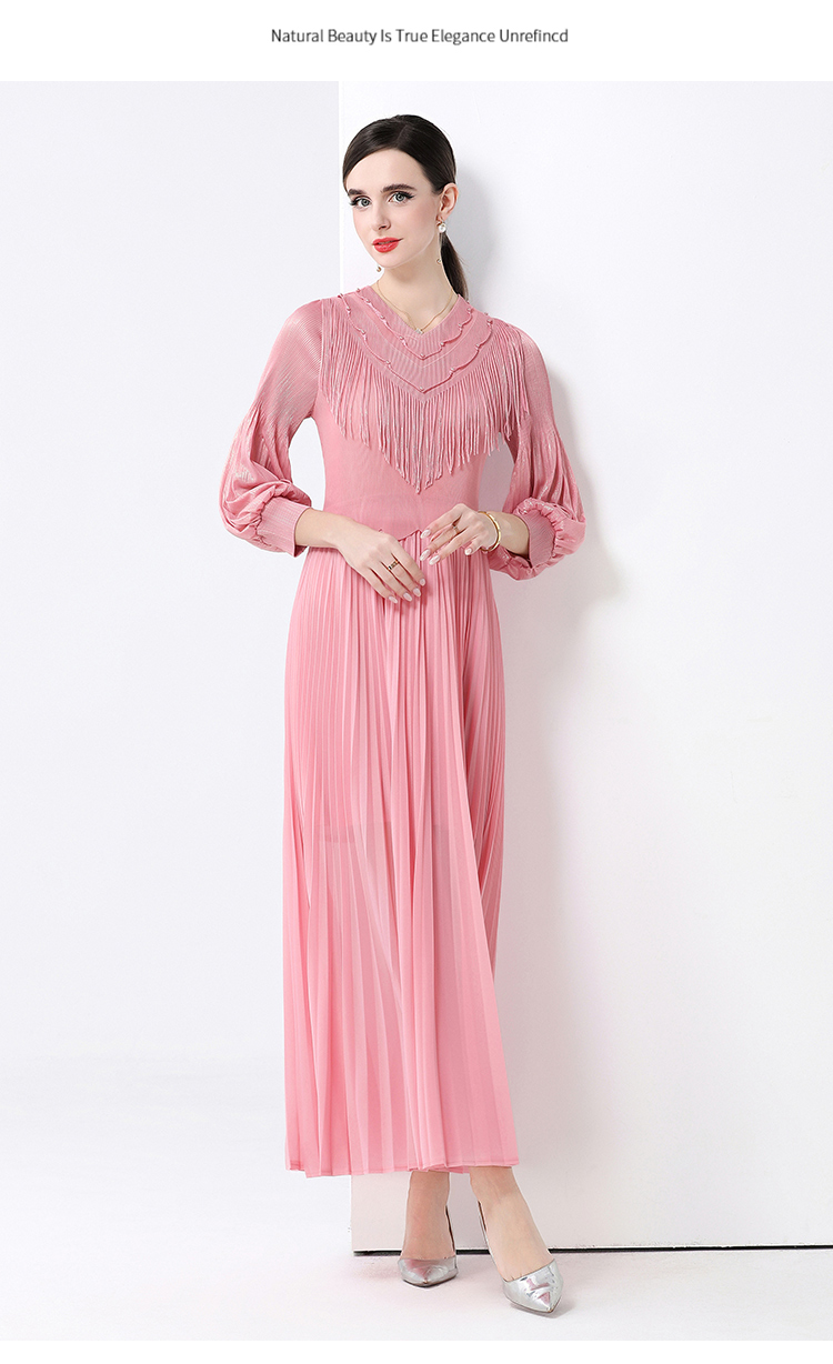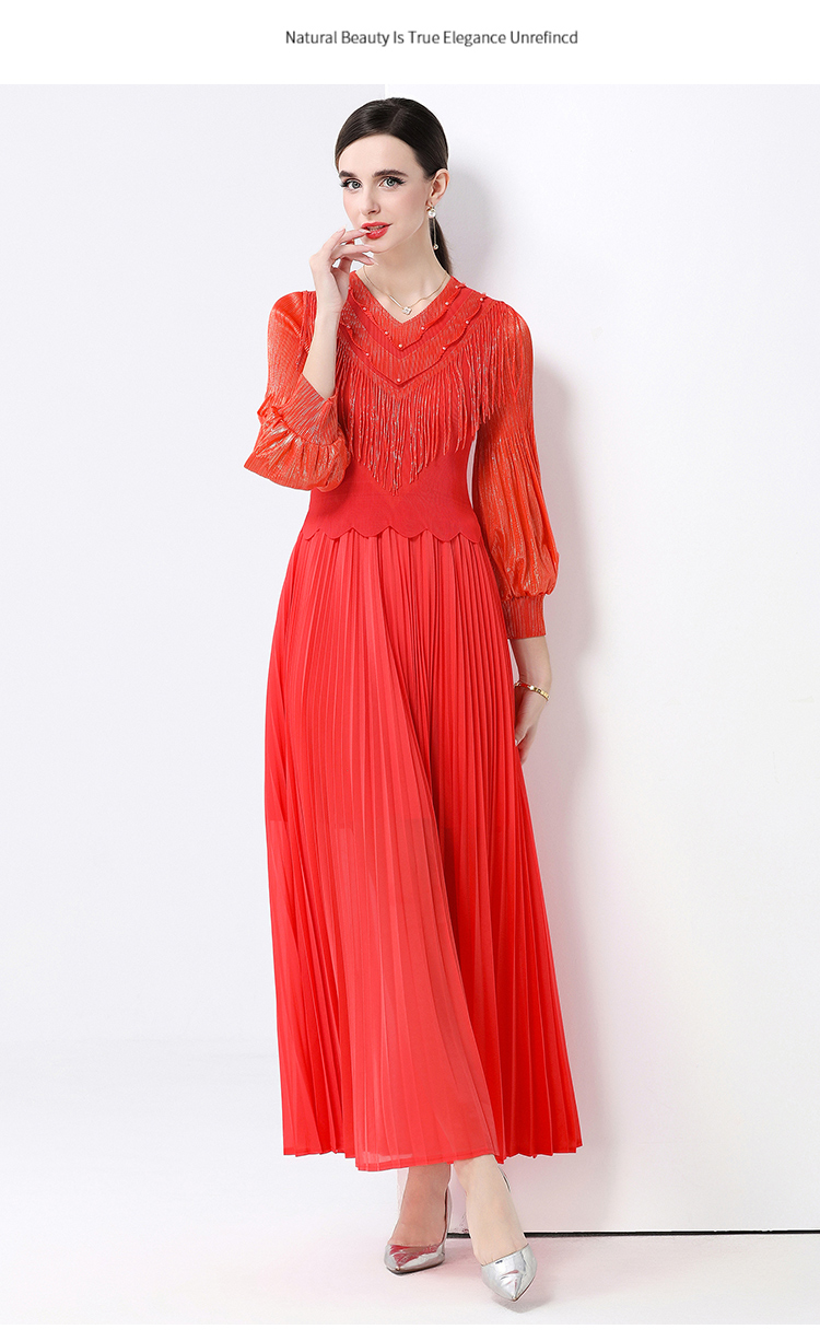 MY14709# 复古重工钉珠烫金喇叭袖褶皱连衣裙女高级感新款过膝礼服裙子长裙女裝貨源服裝批發