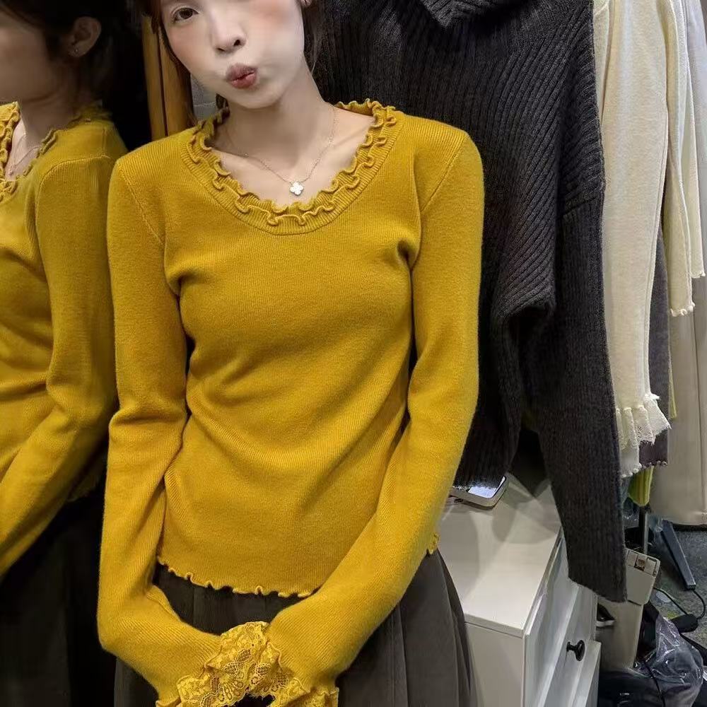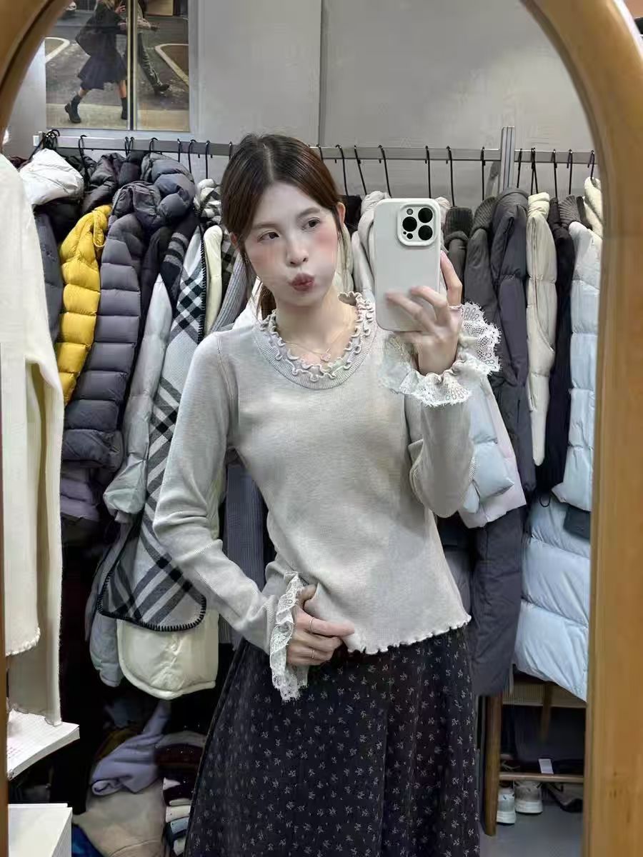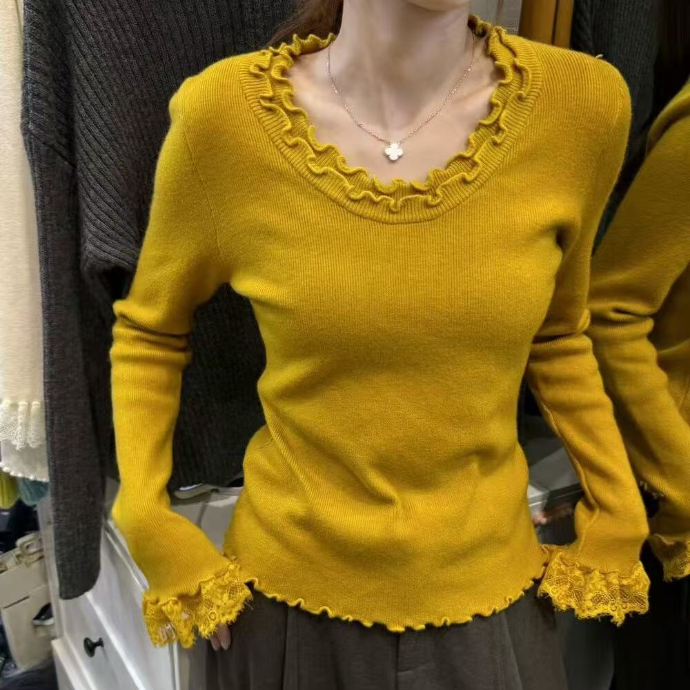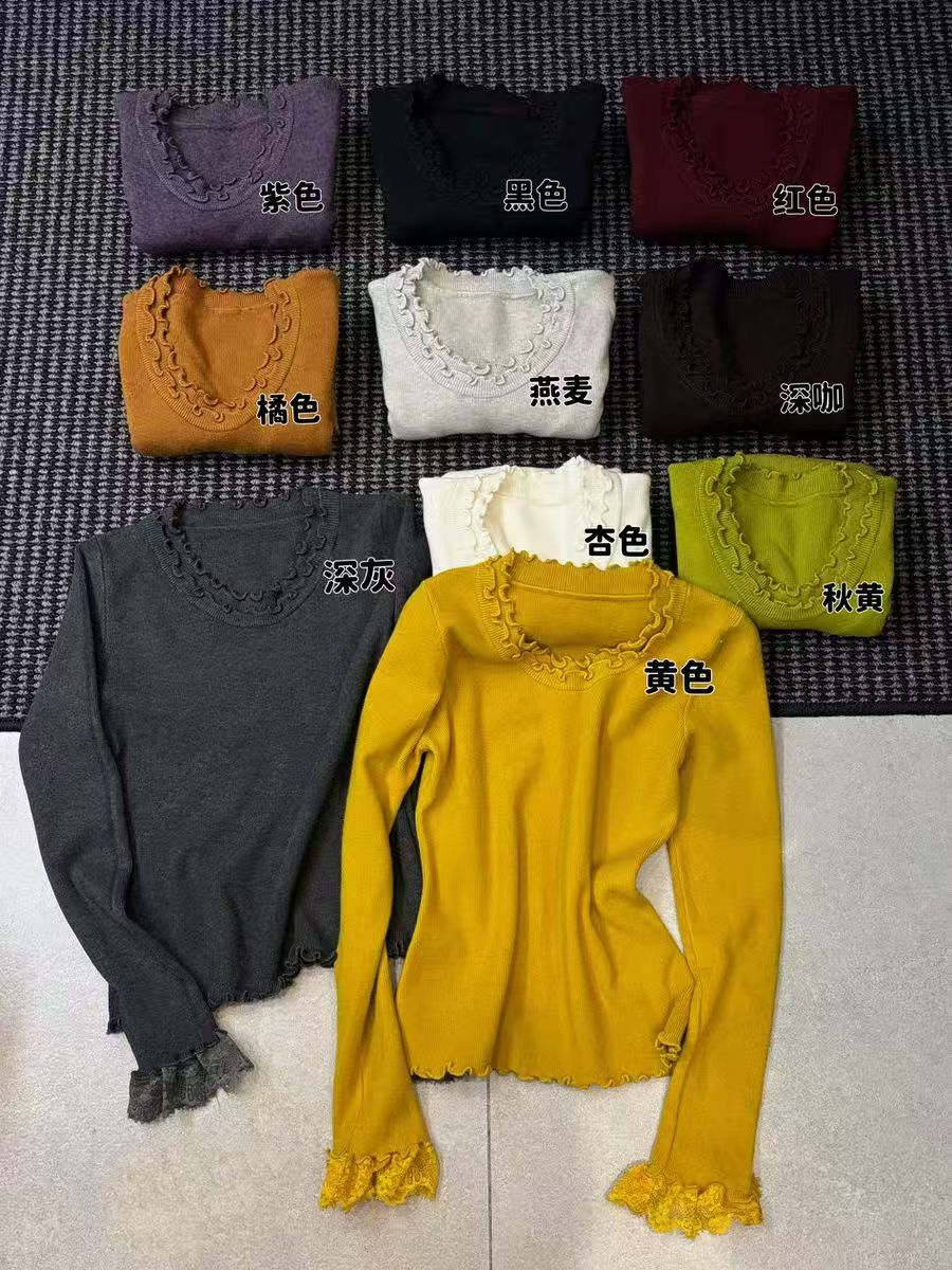 MY14720# 蕾丝新款韩版打底衫长袖减龄百搭舒适别致上衣休闲针织衫通勤女裝貨源服裝批發