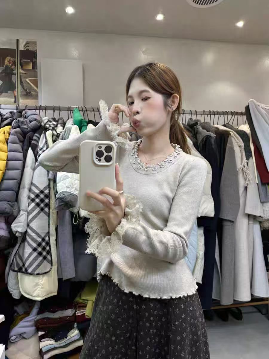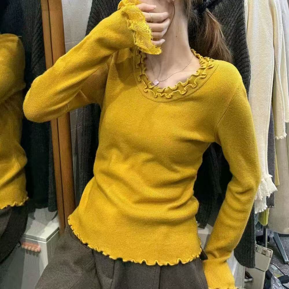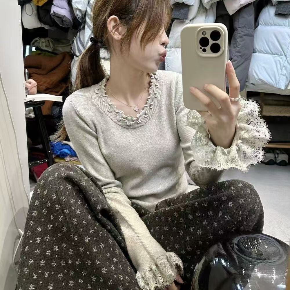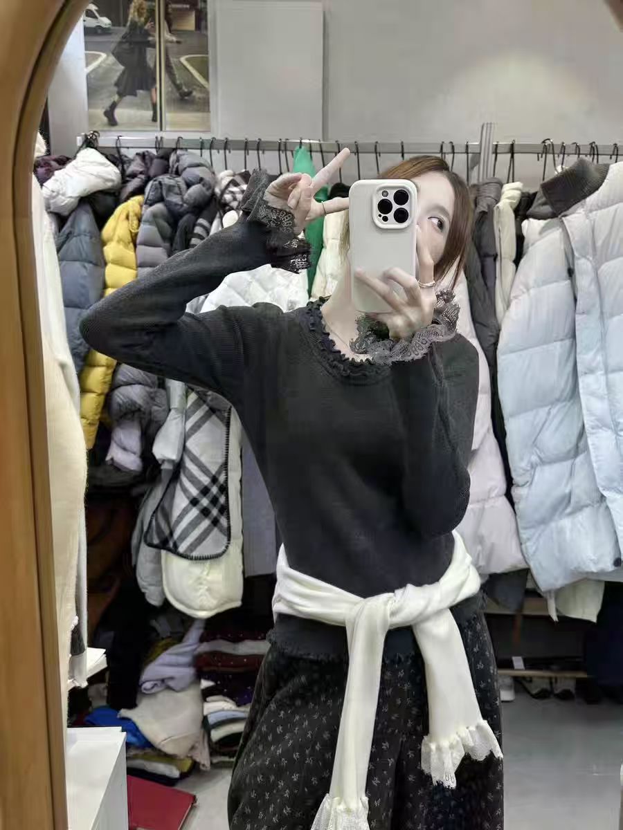 MY14720# 蕾丝新款韩版打底衫长袖减龄百搭舒适别致上衣休闲针织衫通勤女裝貨源服裝批發