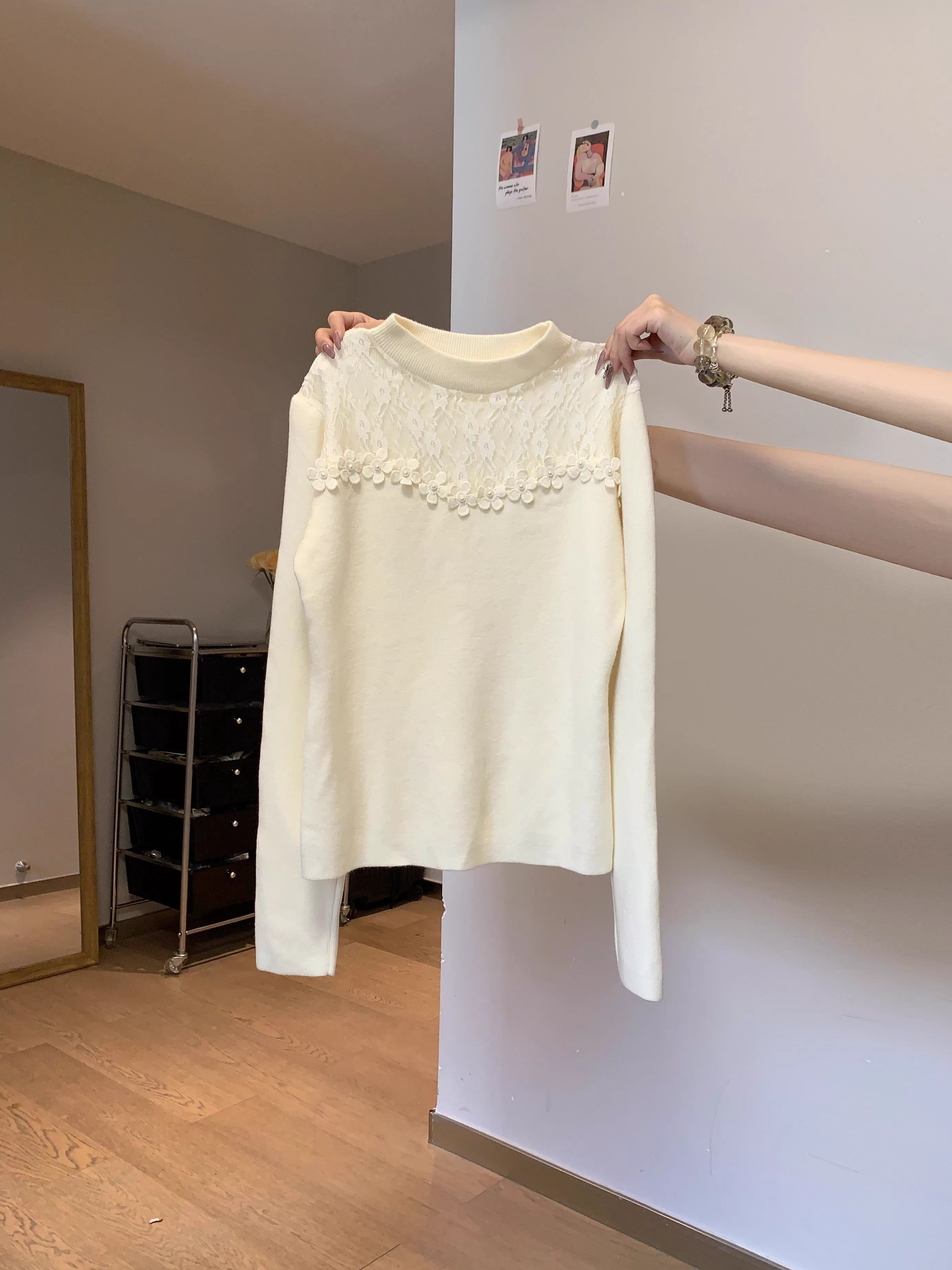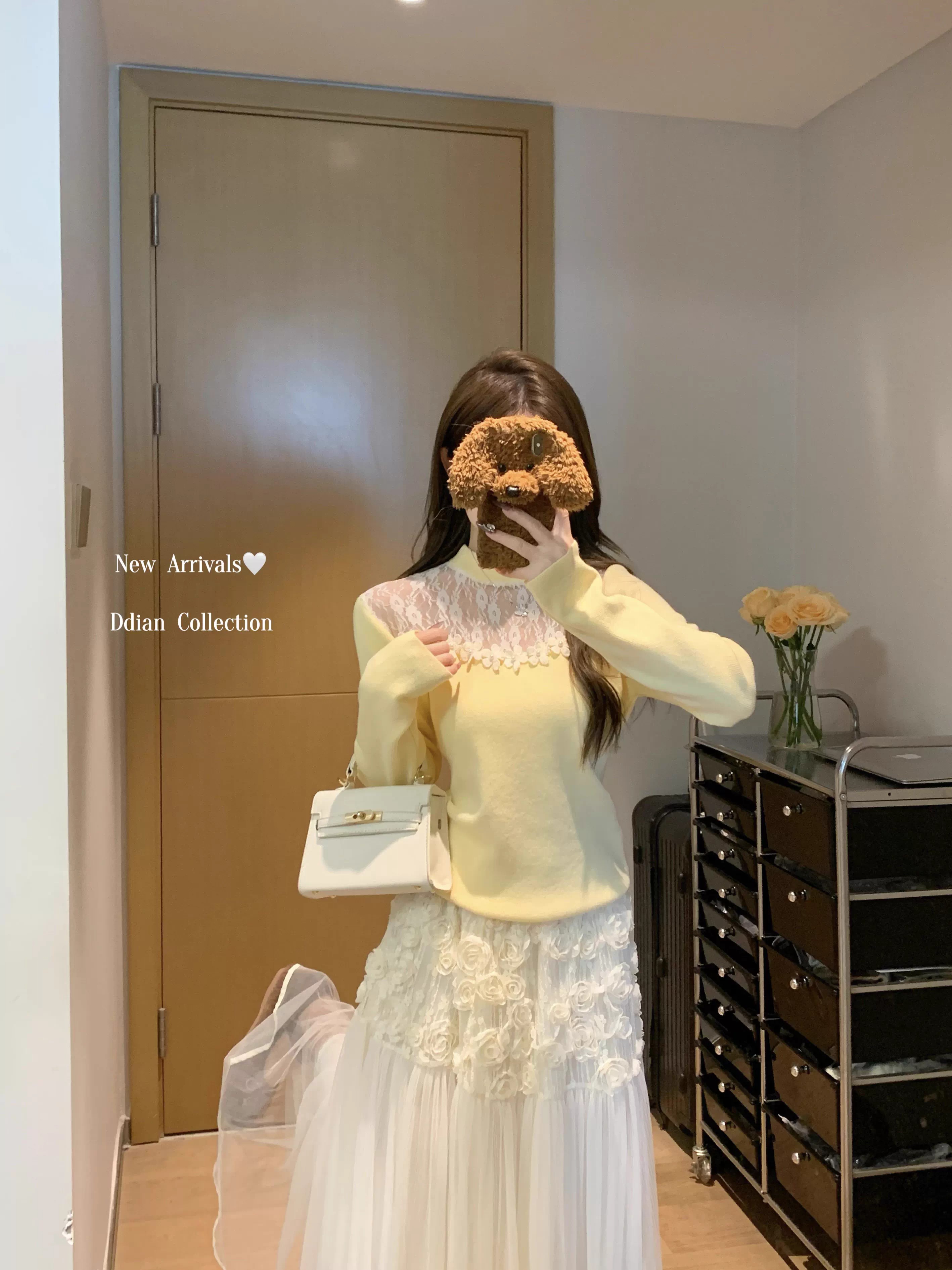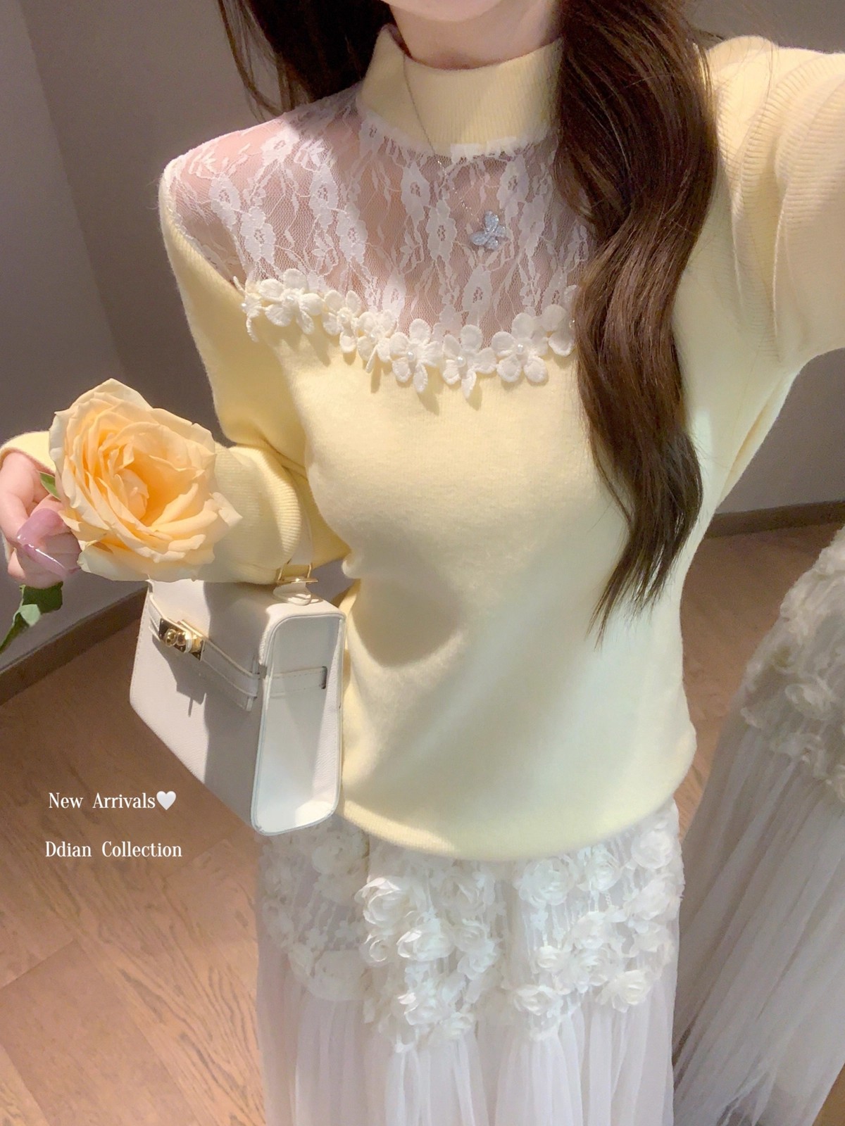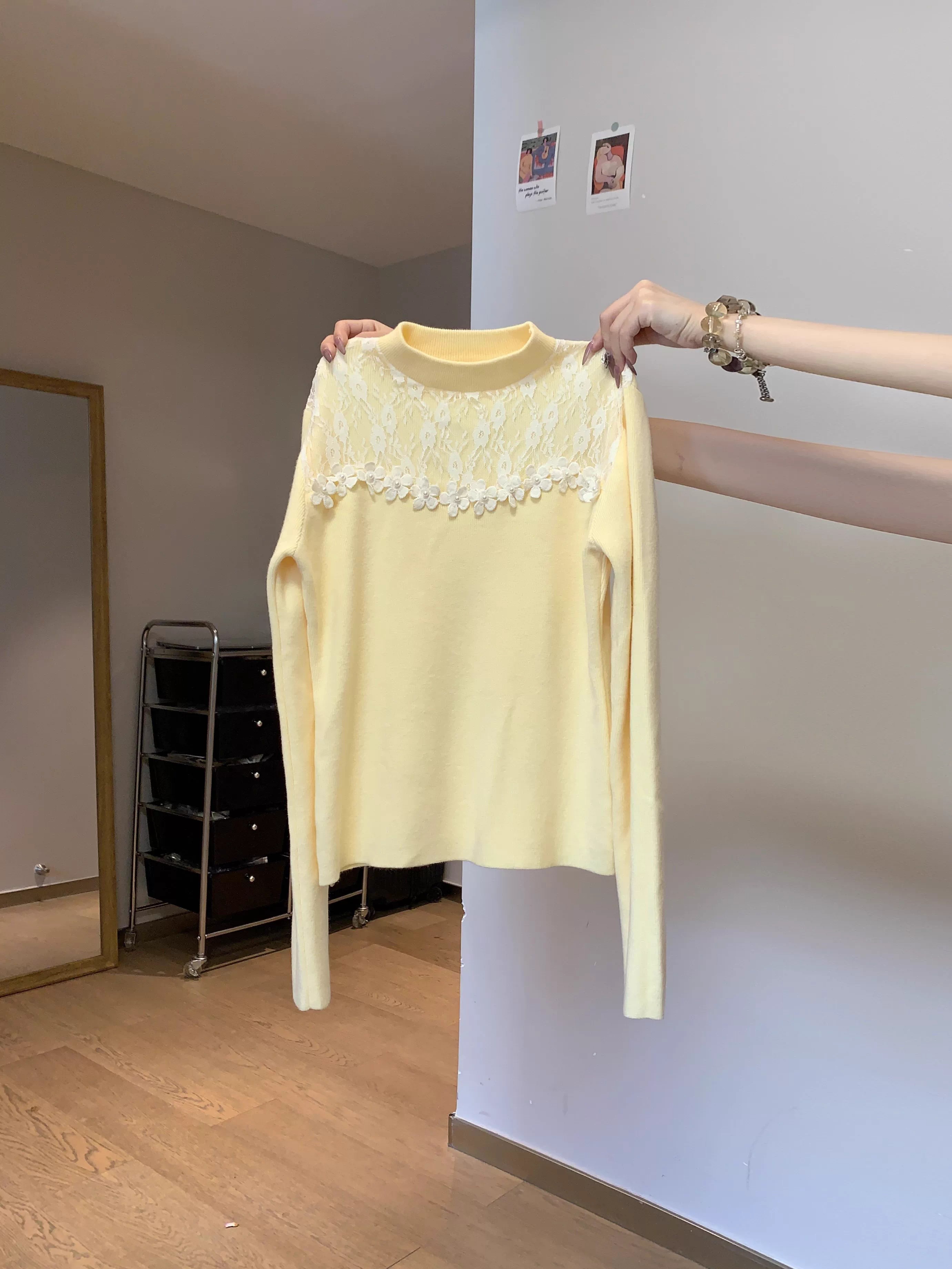 MY14738# miu系奶黄色半高领蕾丝微透拼接打底衫女春纯欲内搭毛衣针织上衣女裝貨源服裝批發
