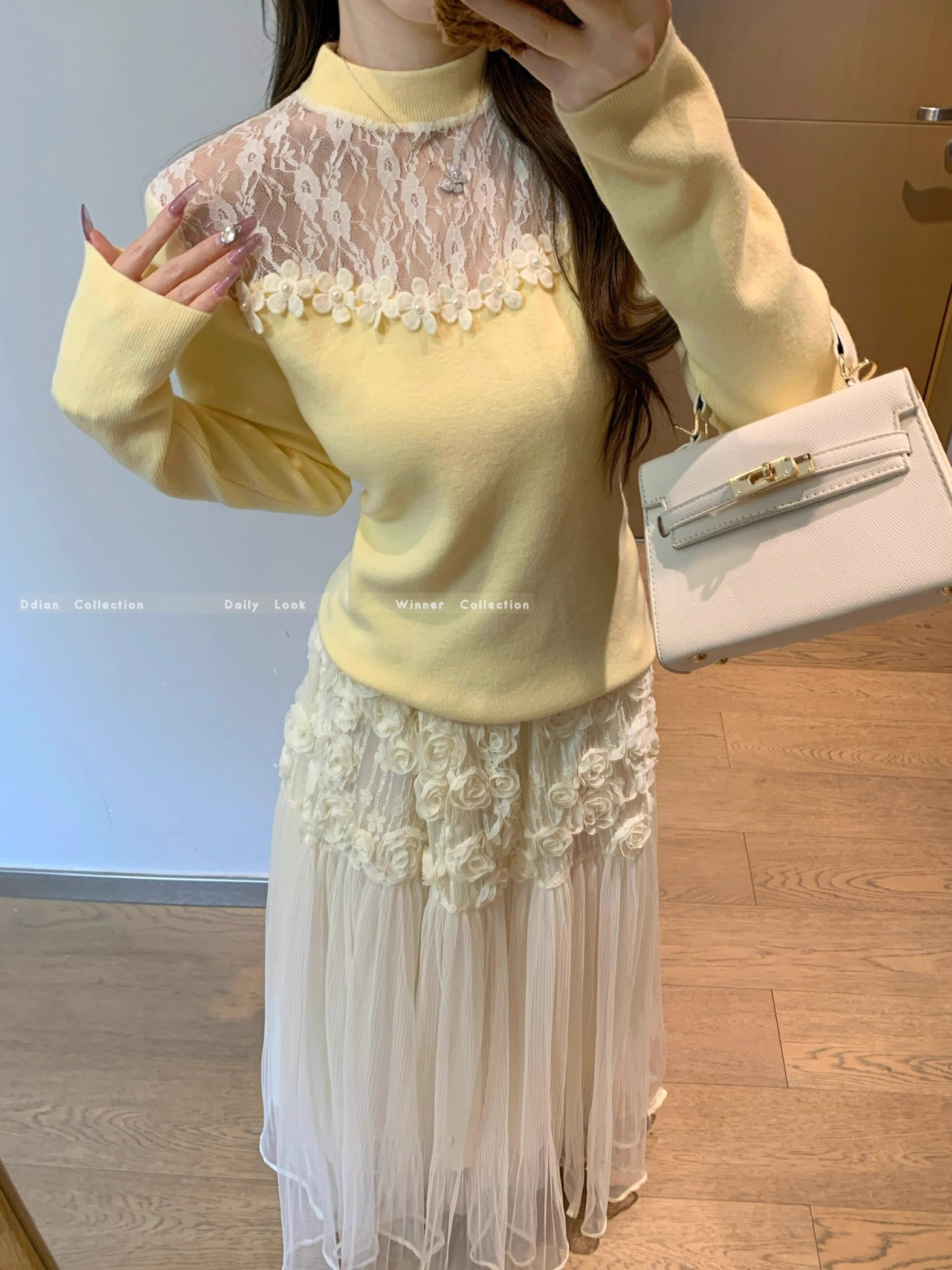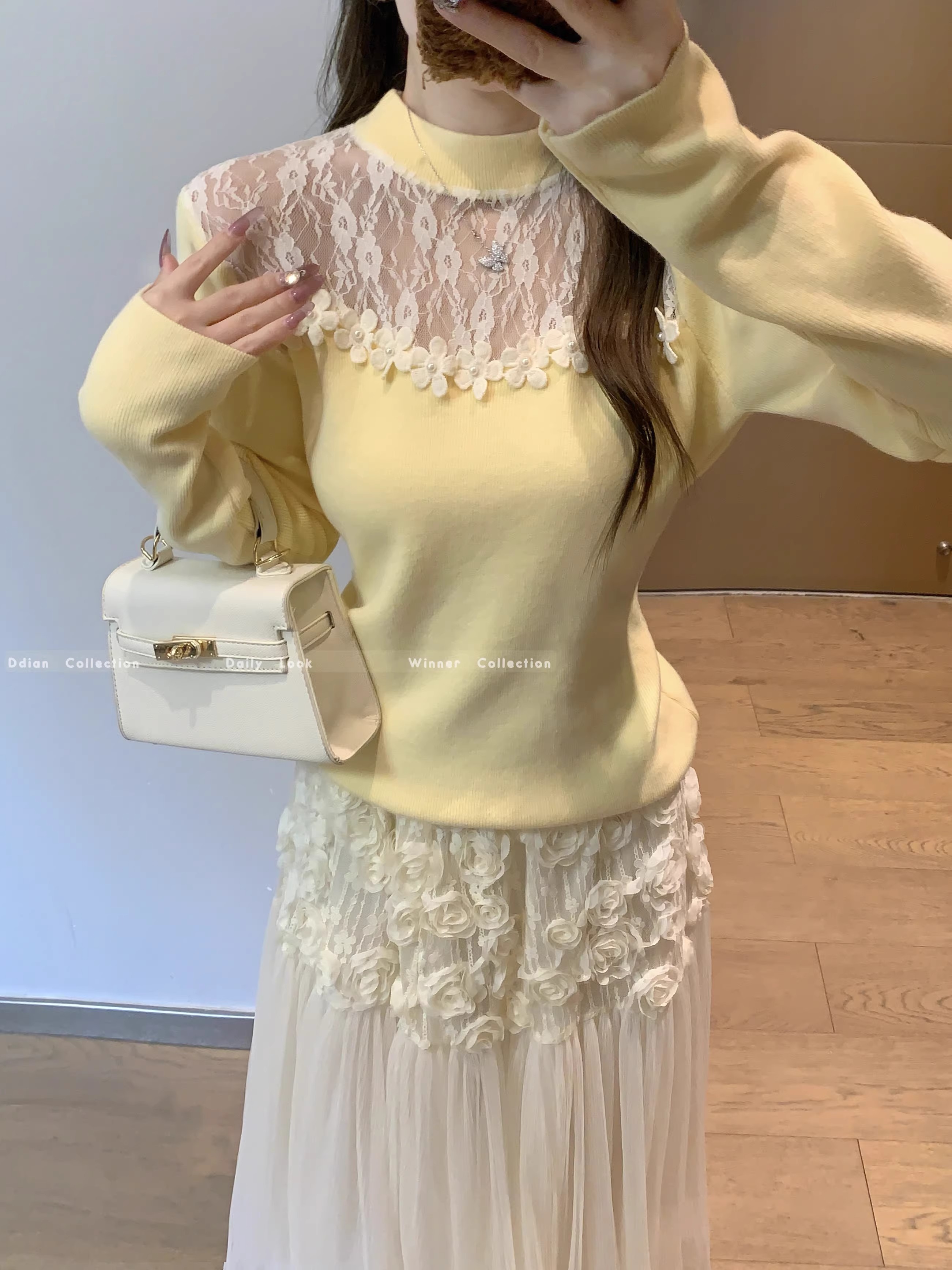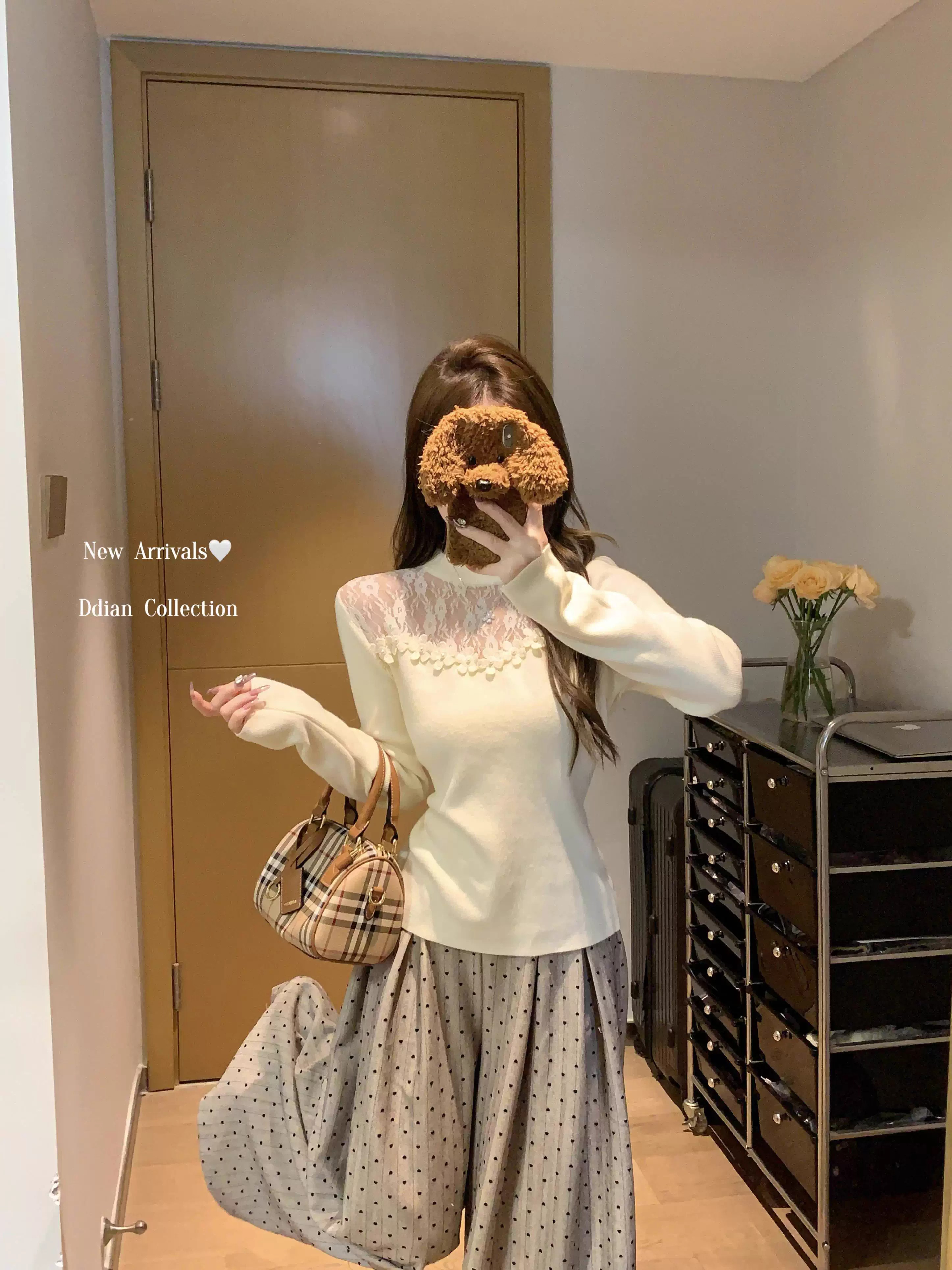 MY14738# miu系奶黄色半高领蕾丝微透拼接打底衫女春纯欲内搭毛衣针织上衣女裝貨源服裝批發