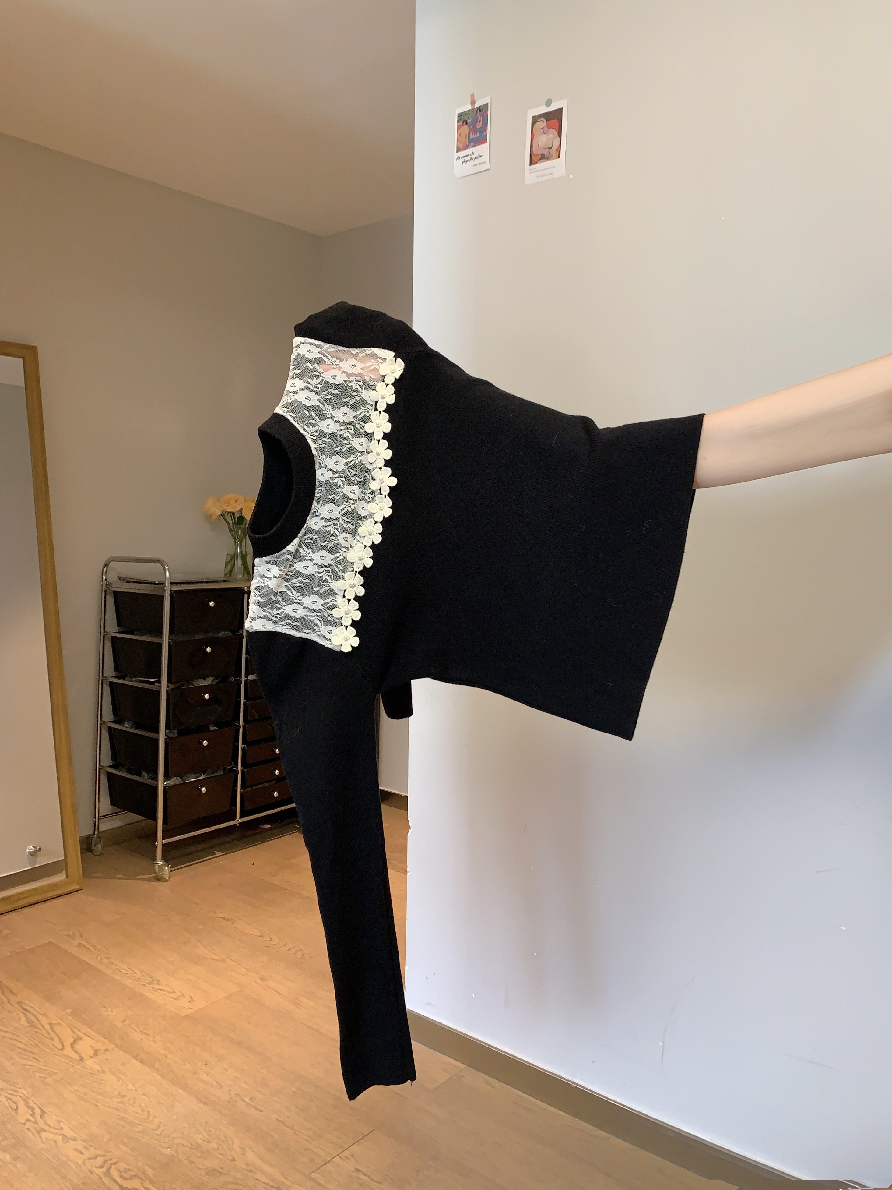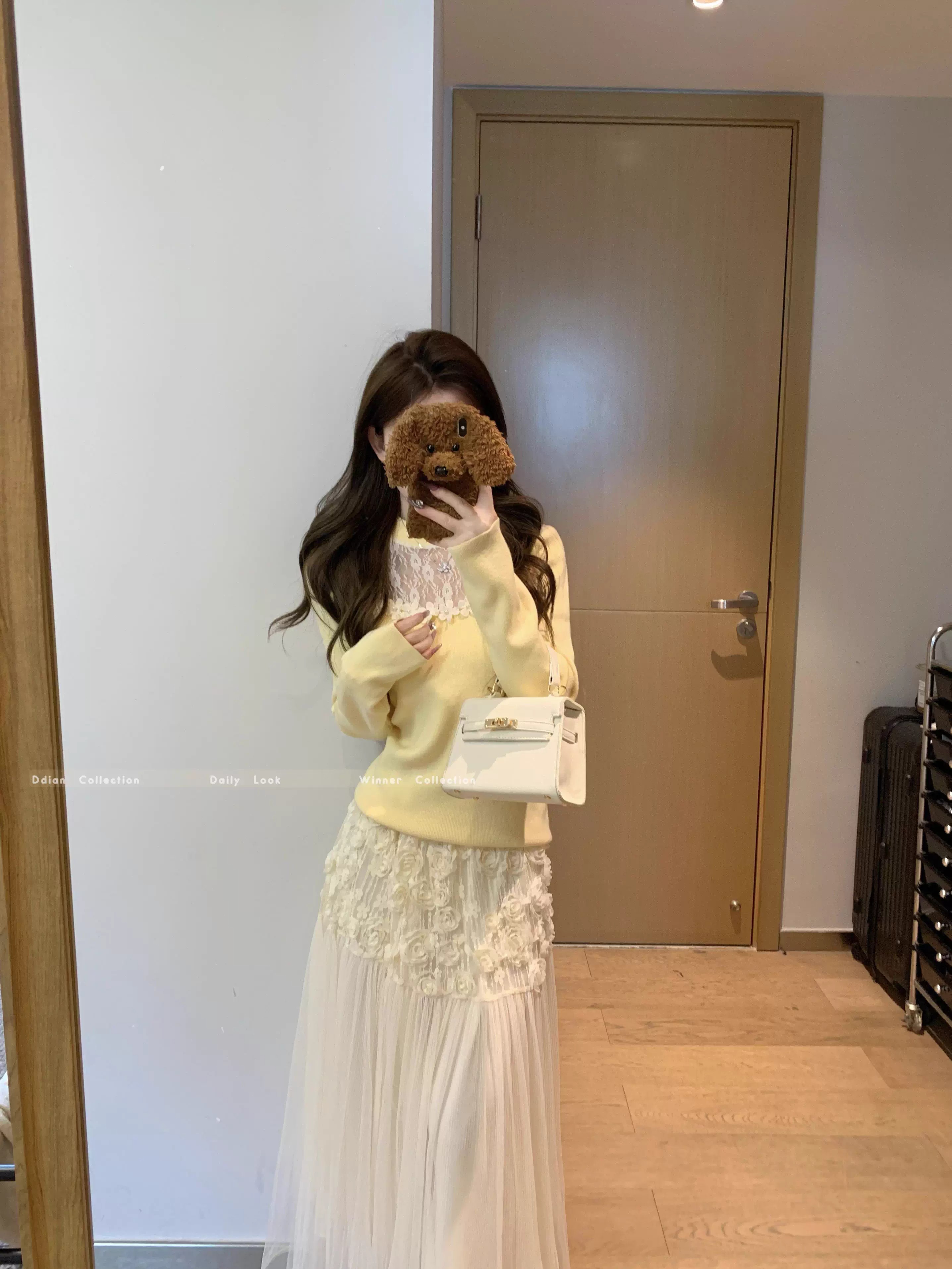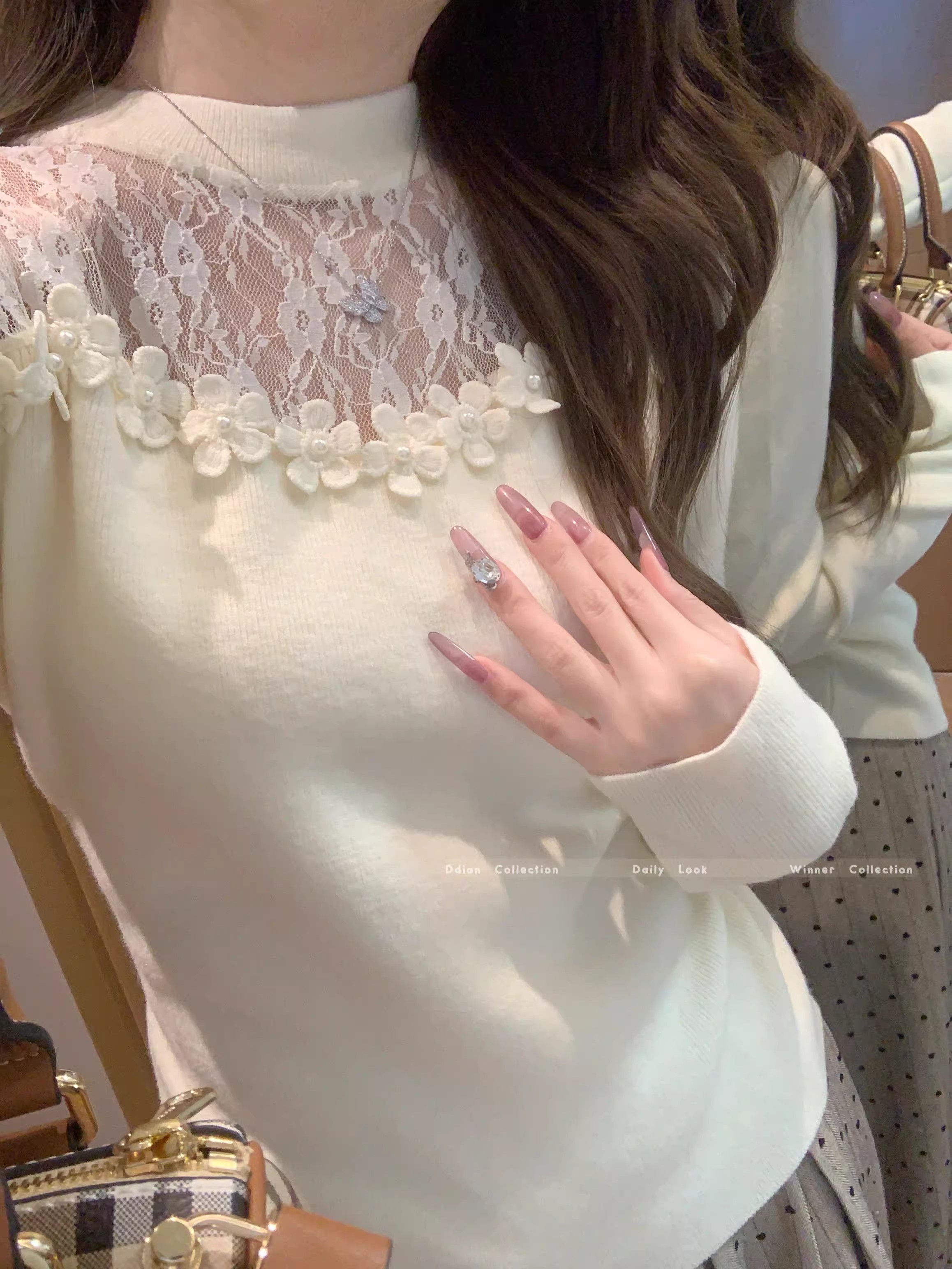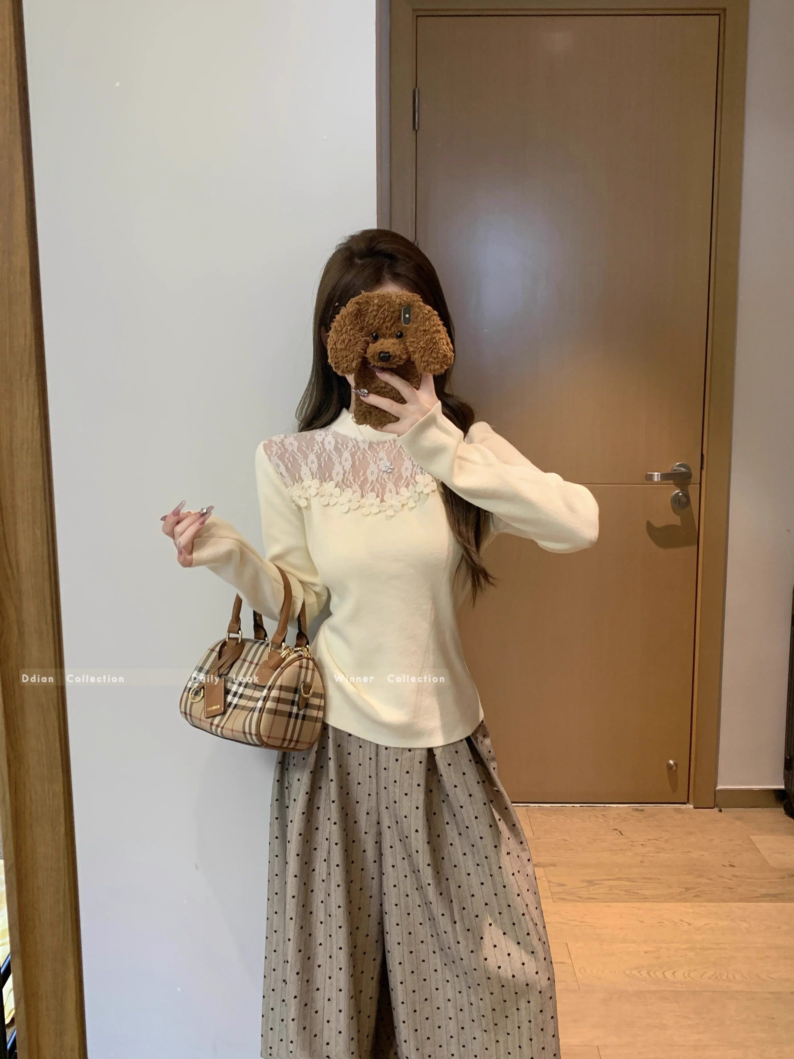 MY14738# miu系奶黄色半高领蕾丝微透拼接打底衫女春纯欲内搭毛衣针织上衣女裝貨源服裝批發