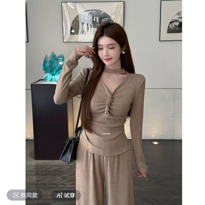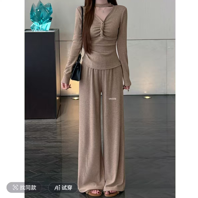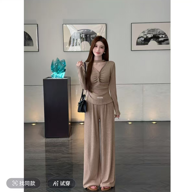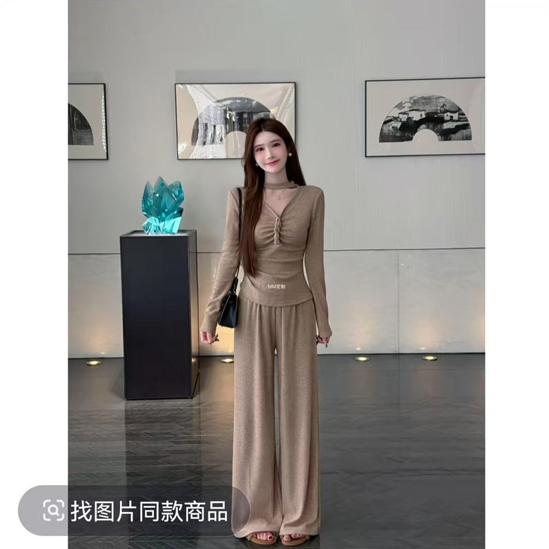 MY14759# 南意情书随性休闲V领不规则扭结上衣高腰松紧直筒长裤套装女女裝貨源服裝批發