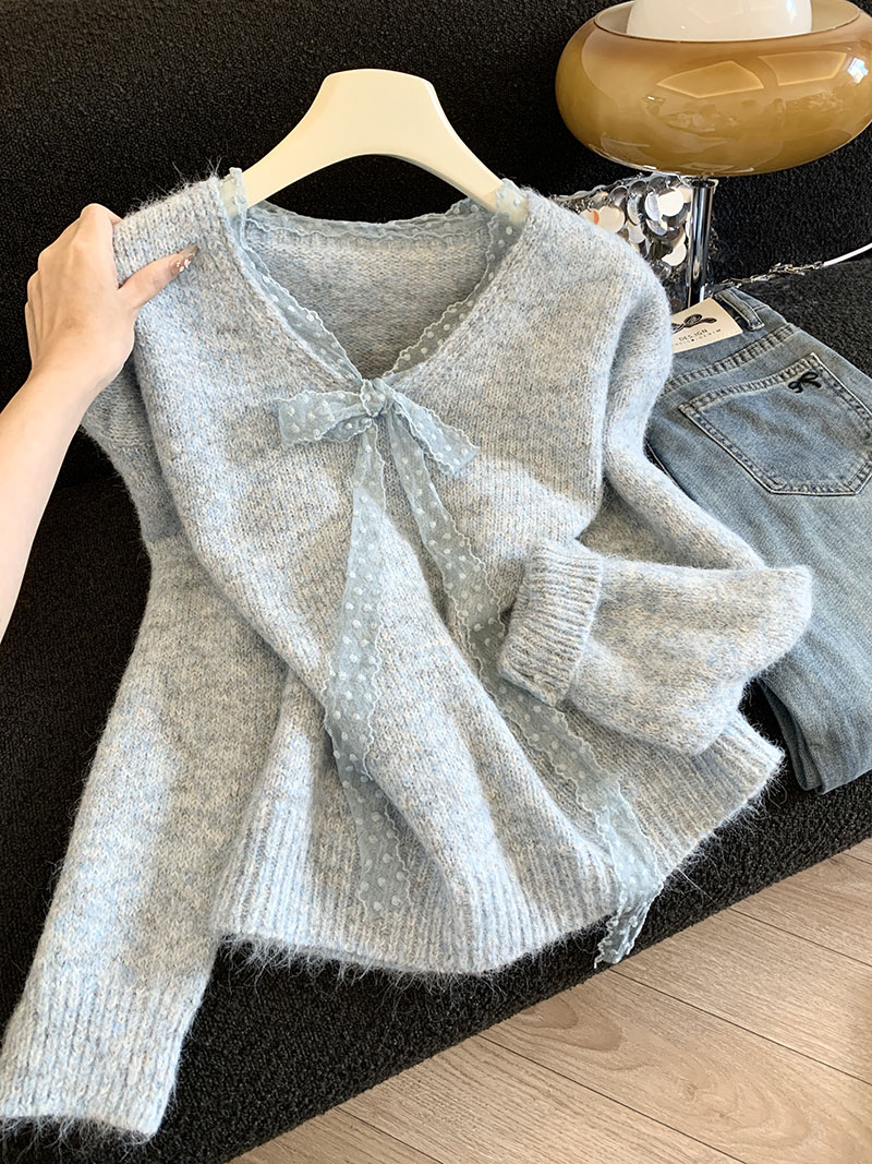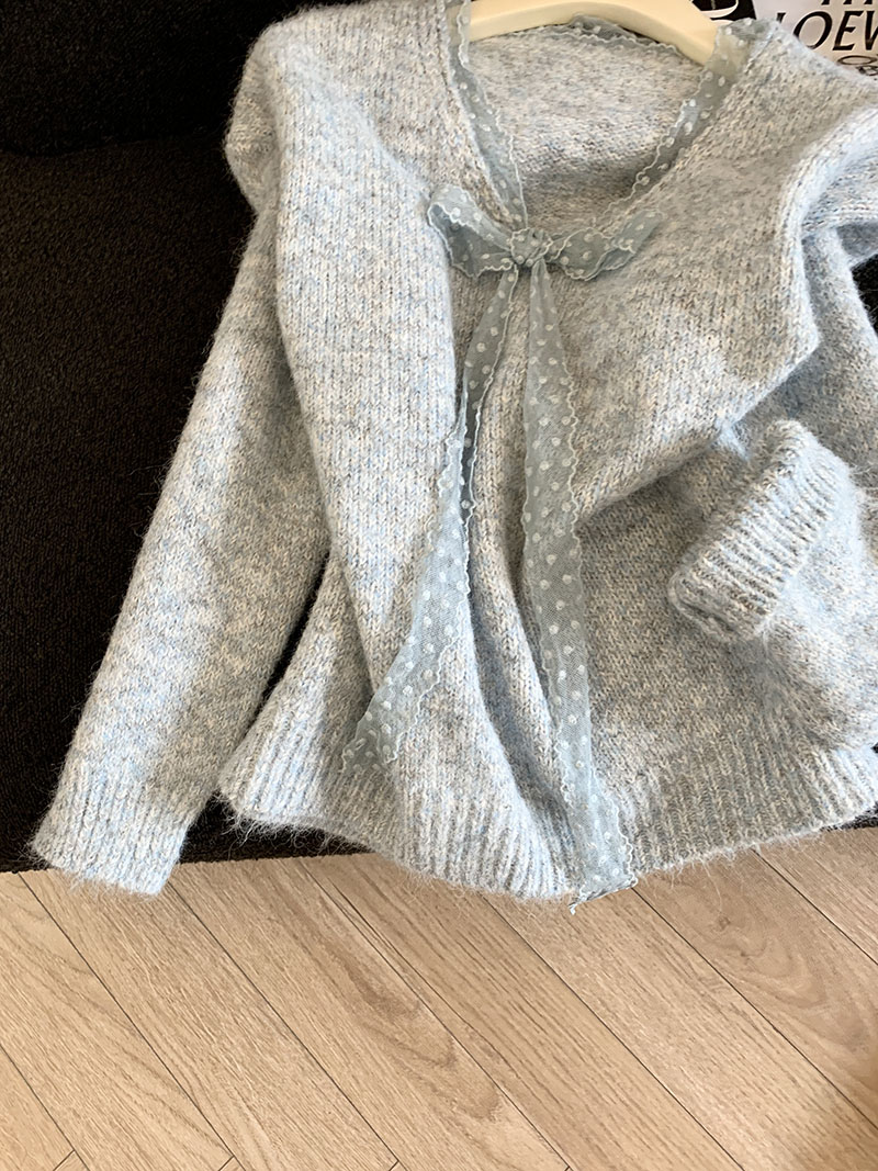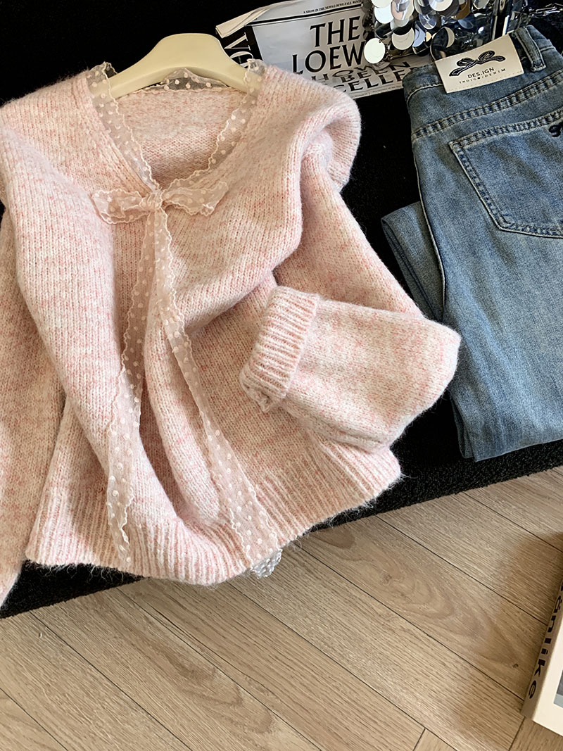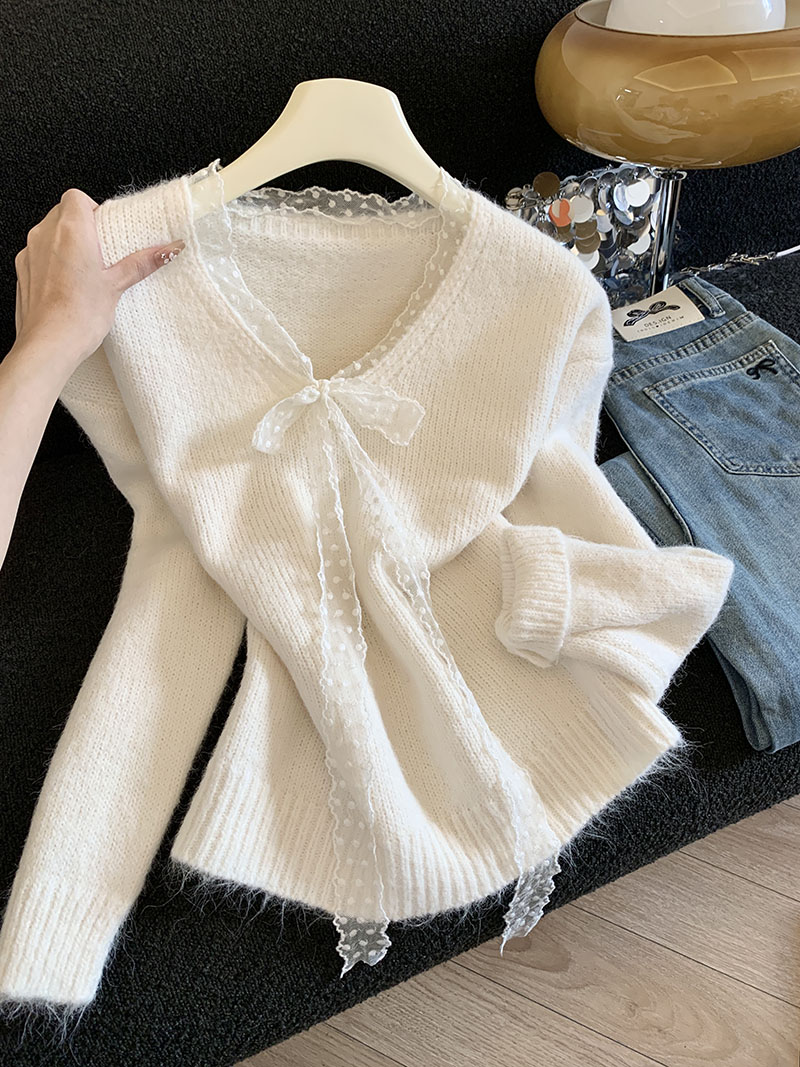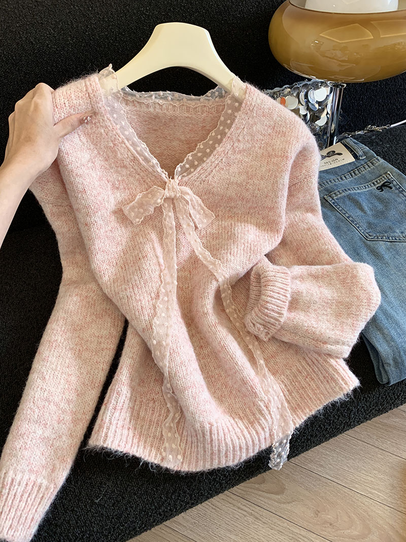 MY14872# 蕾丝蝴蝶结V领长袖针织衫女款巨好看软糯宽松毛衣上衣女女裝貨源服裝批發