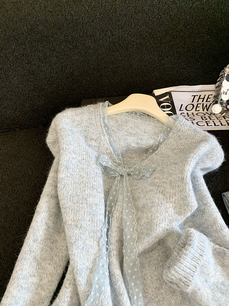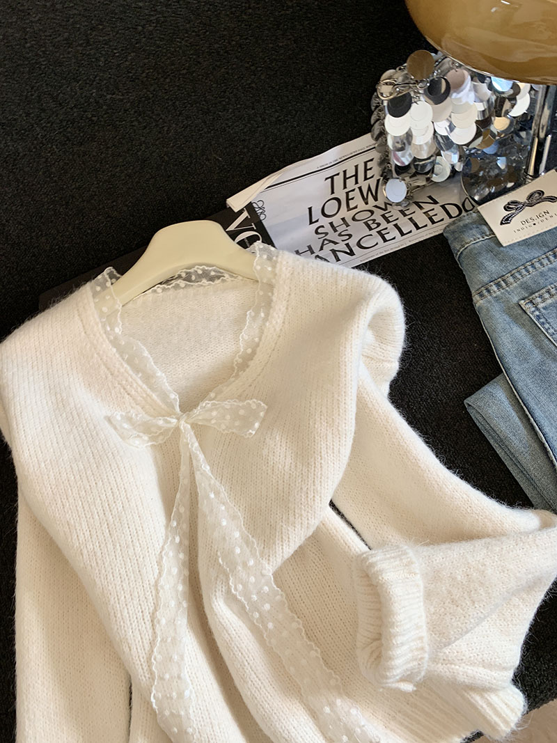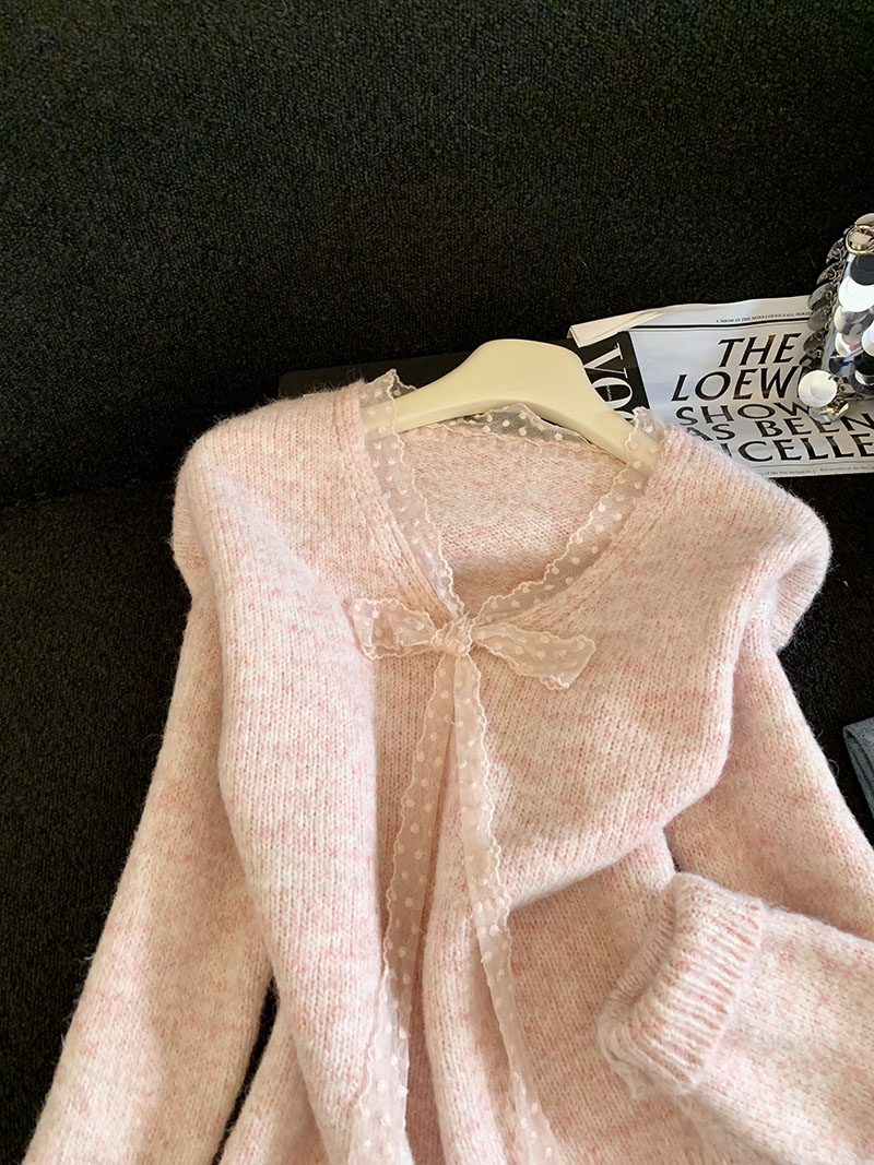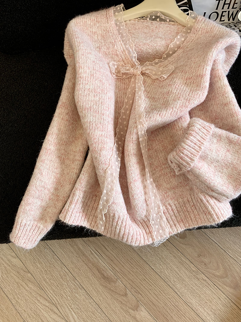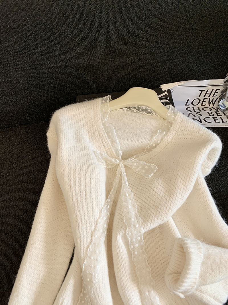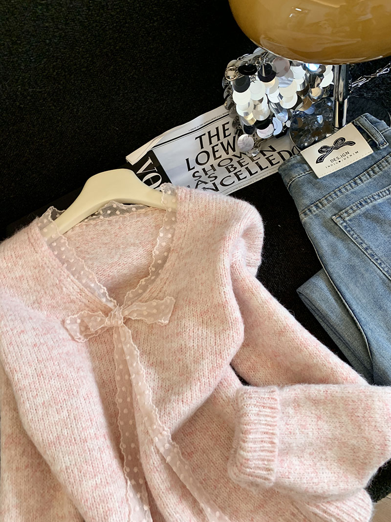 MY14872# 蕾丝蝴蝶结V领长袖针织衫女款巨好看软糯宽松毛衣上衣女女裝貨源服裝批發