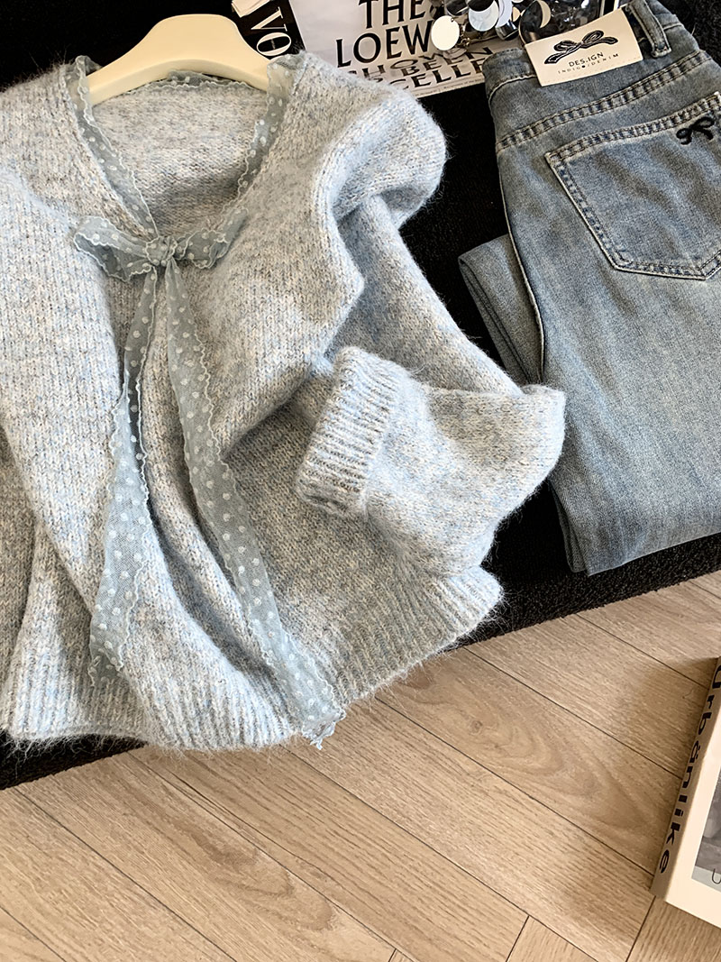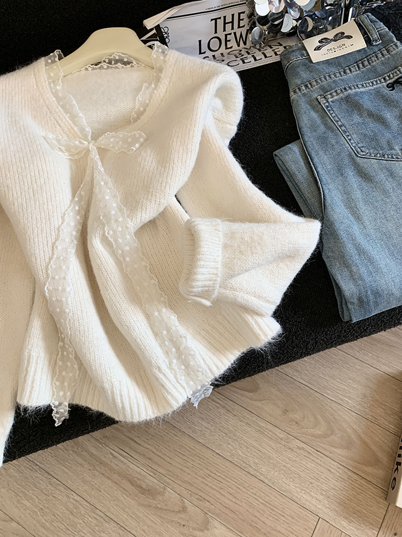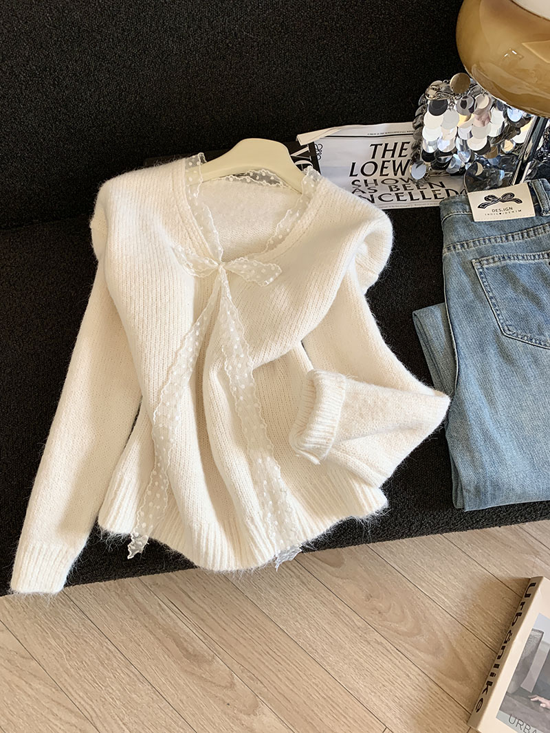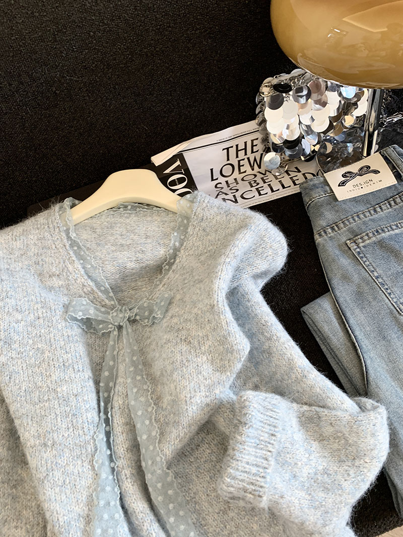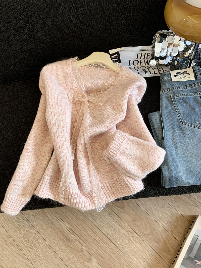 MY14872# 蕾丝蝴蝶结V领长袖针织衫女款巨好看软糯宽松毛衣上衣女女裝貨源服裝批發