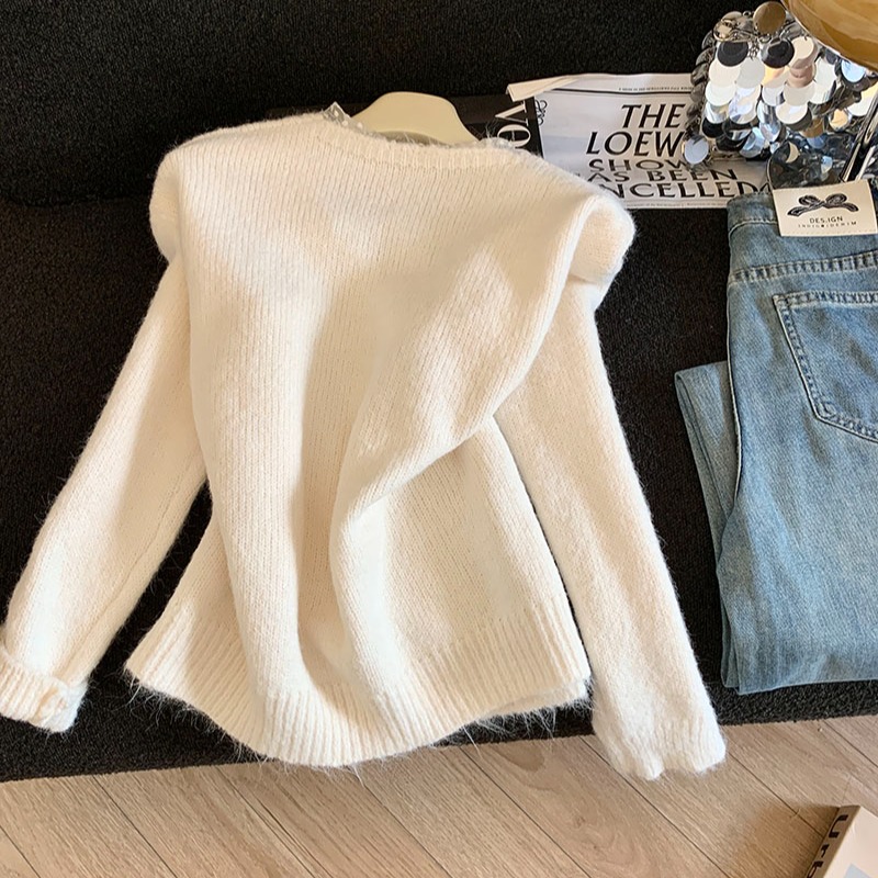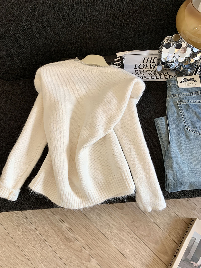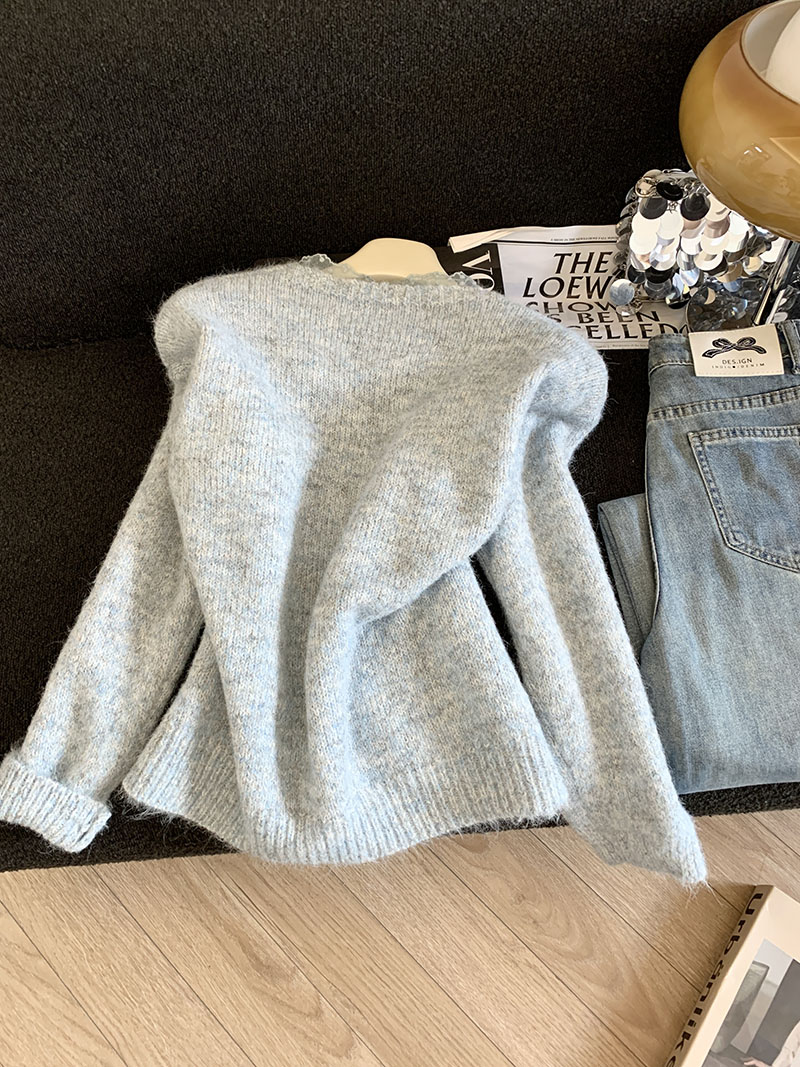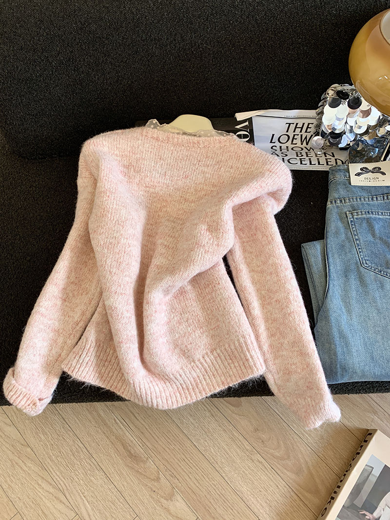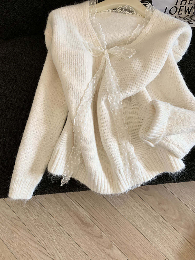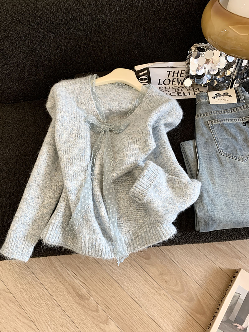 MY14872# 蕾丝蝴蝶结V领长袖针织衫女款巨好看软糯宽松毛衣上衣女女裝貨源服裝批發