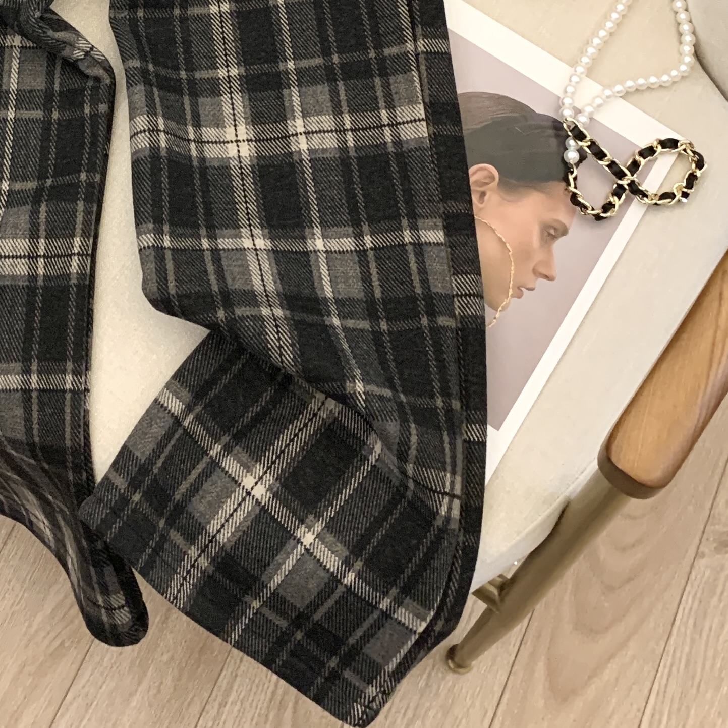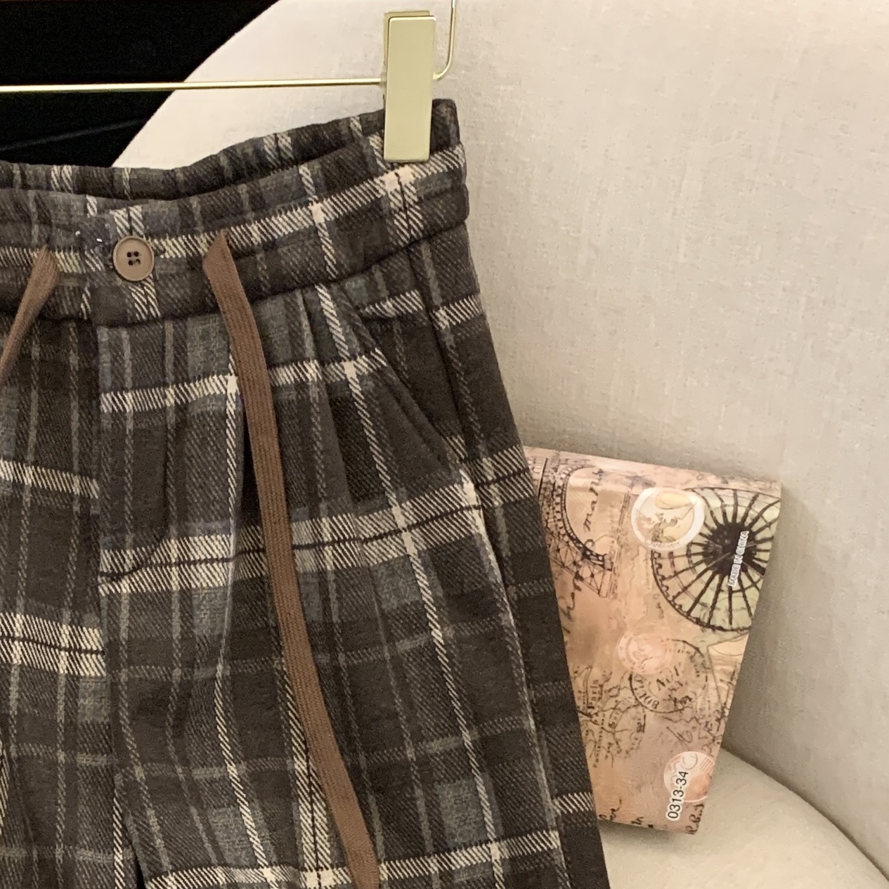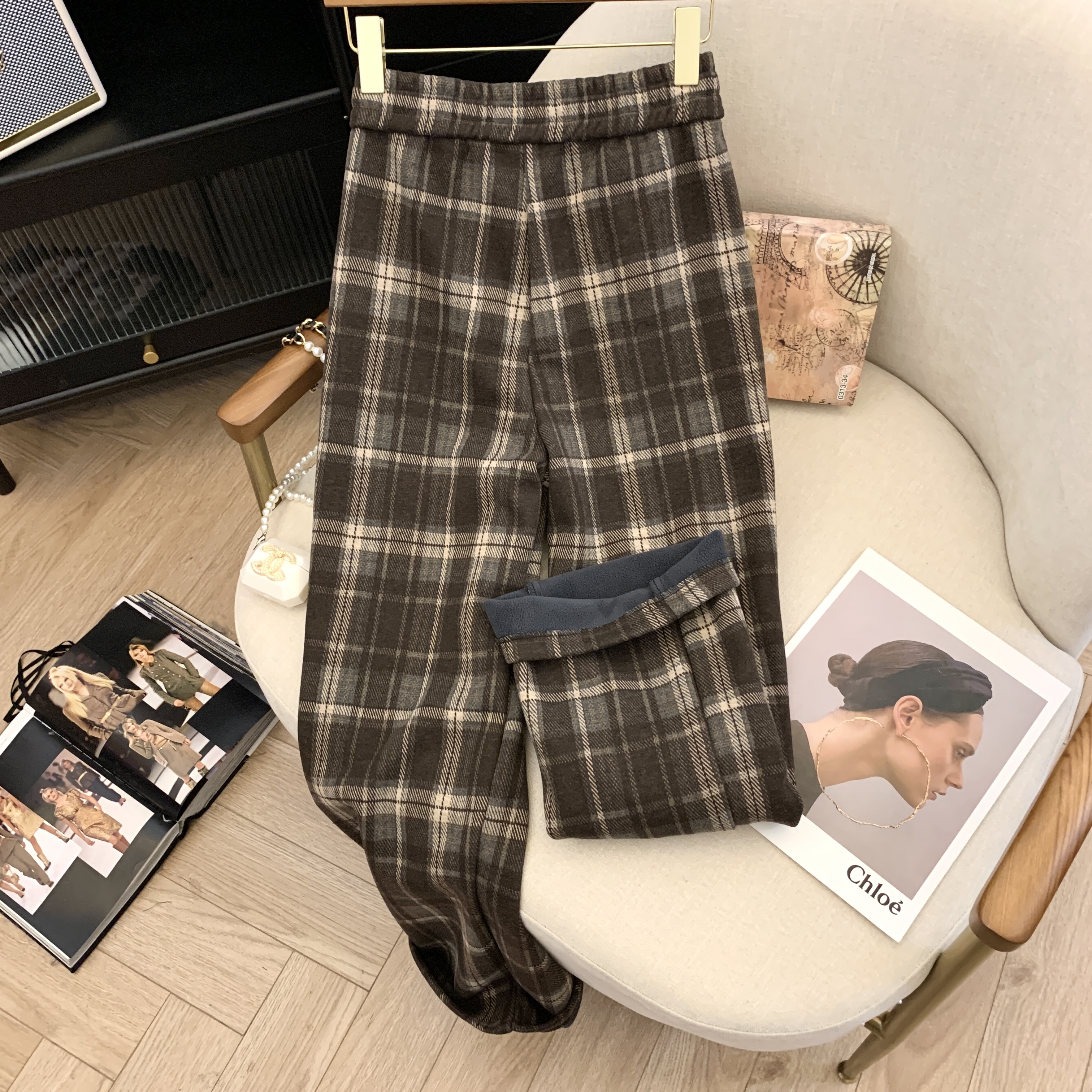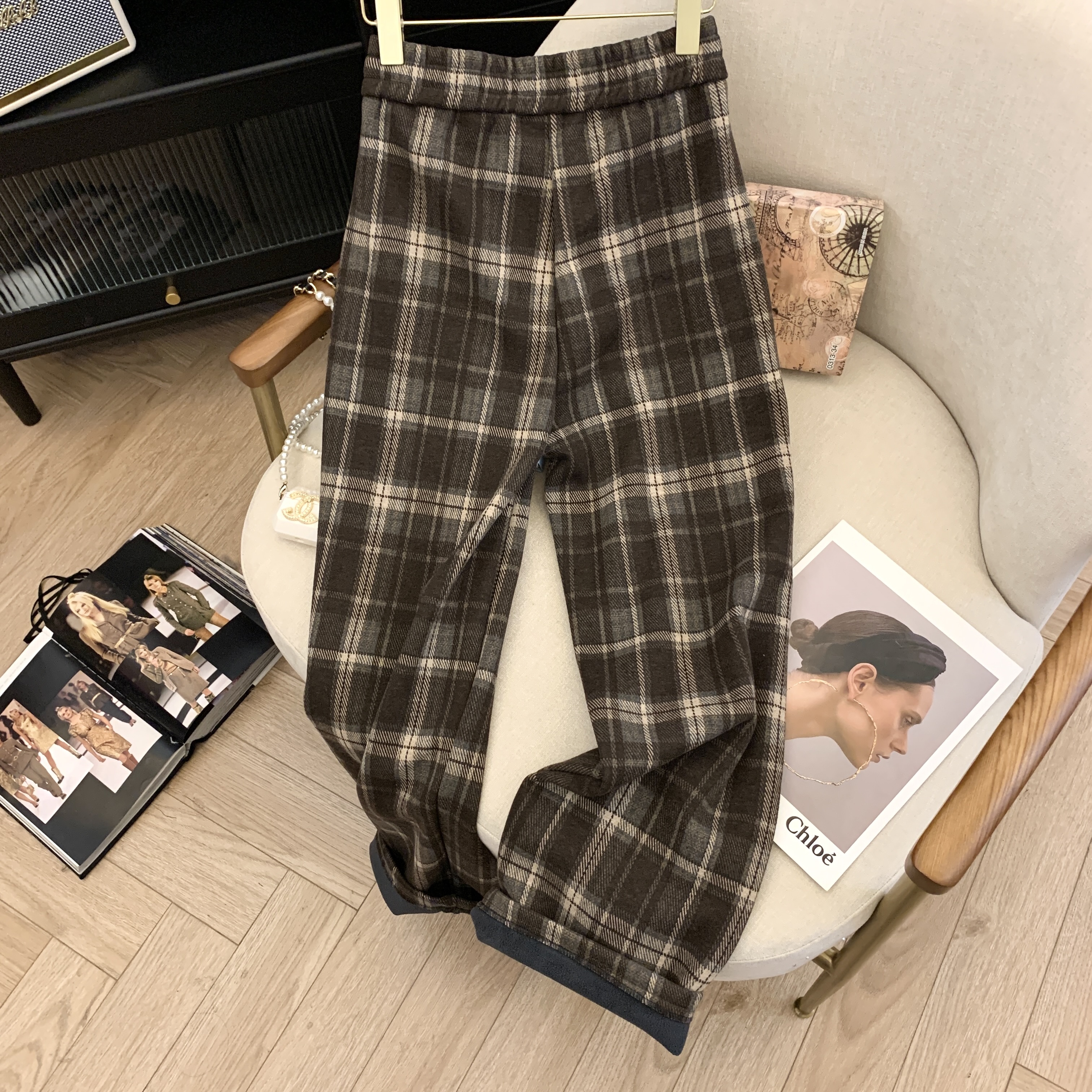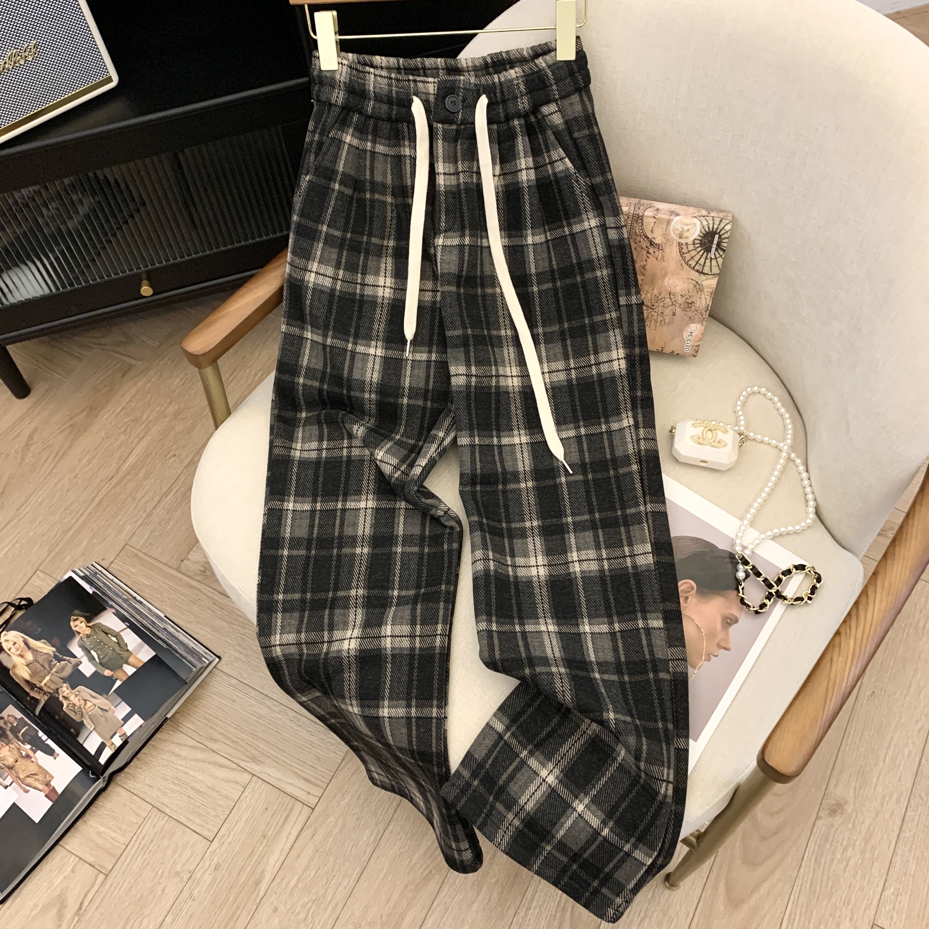 MY14873# 新款加绒格子裤毛呢阔腿裤高腰直筒拖地高腰休闲裤女女裝貨源服裝批發