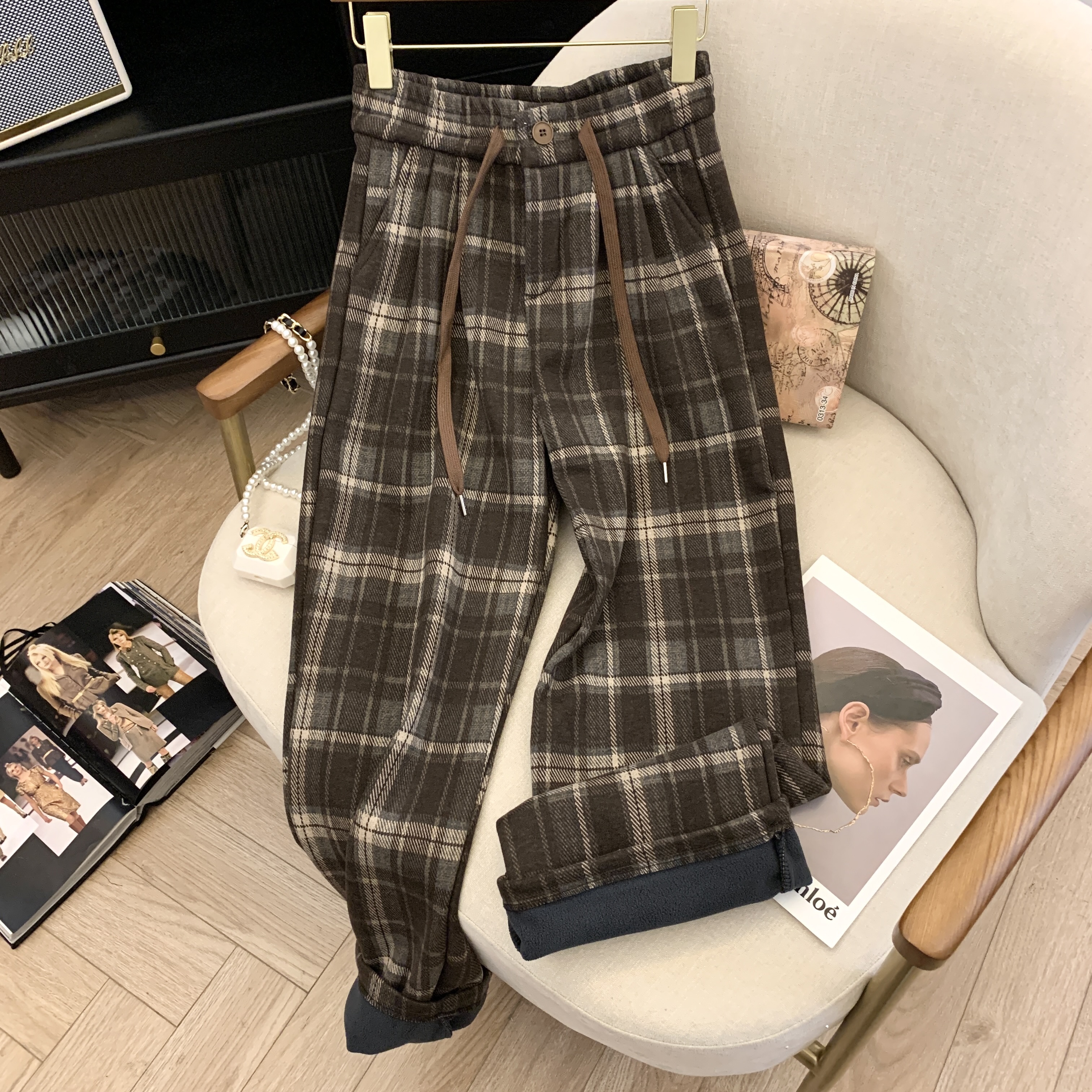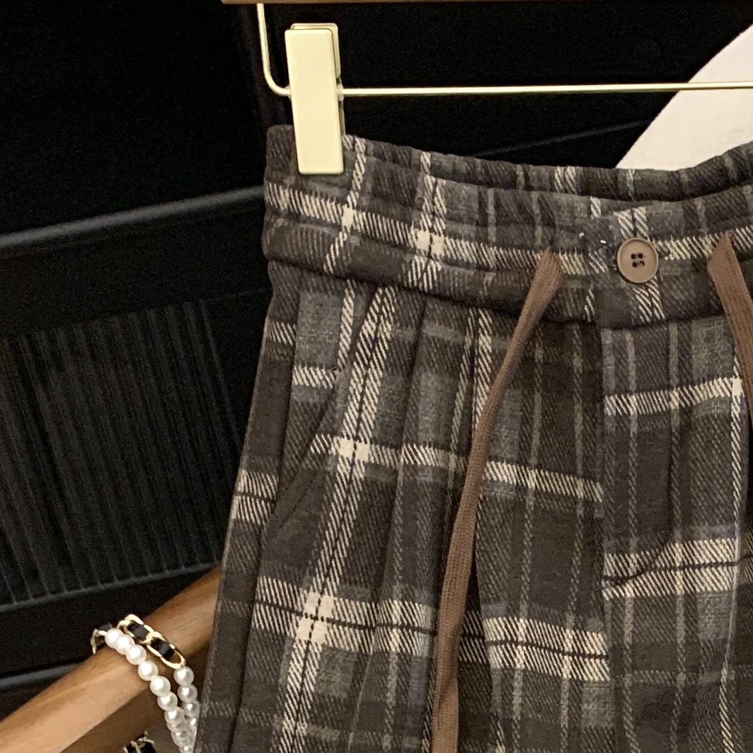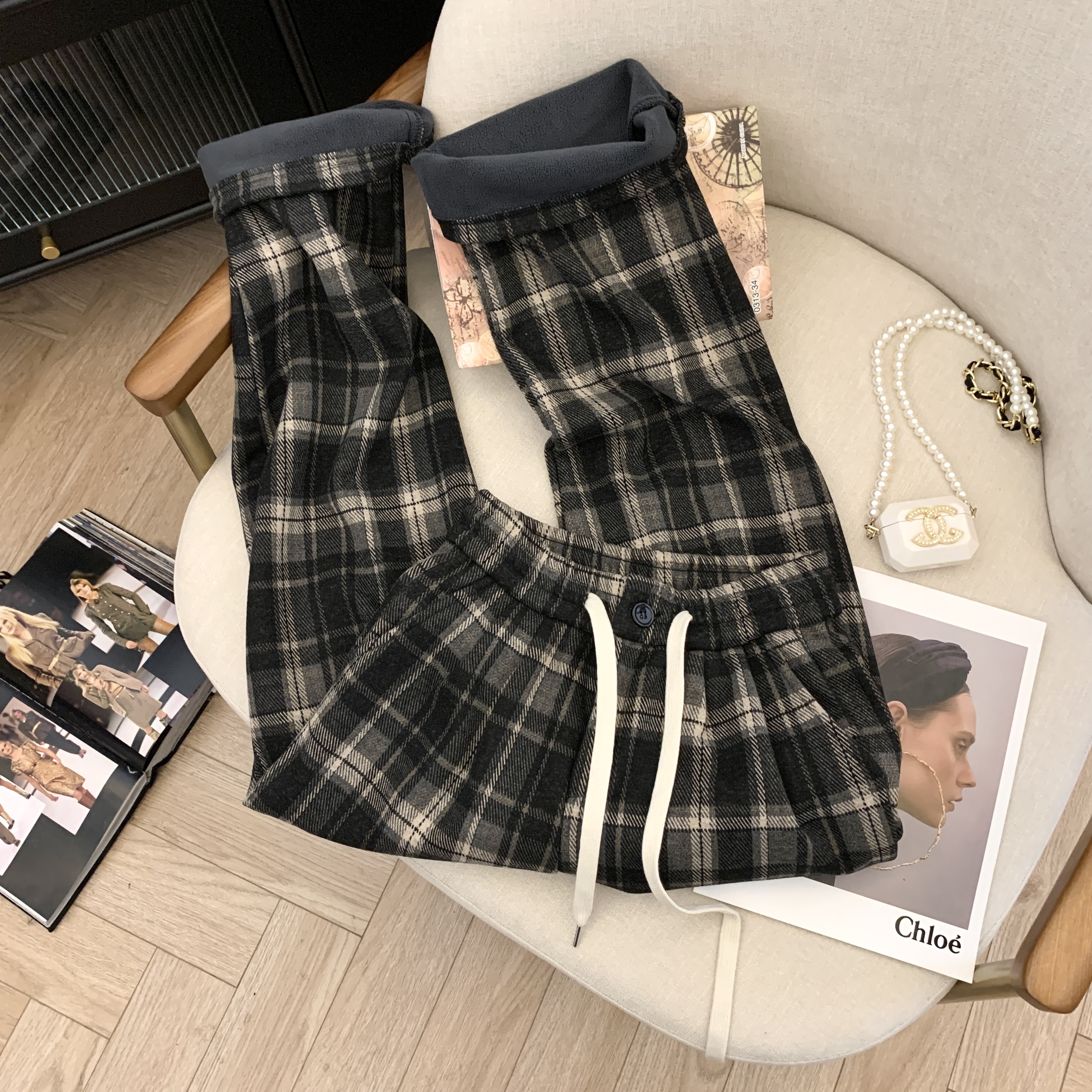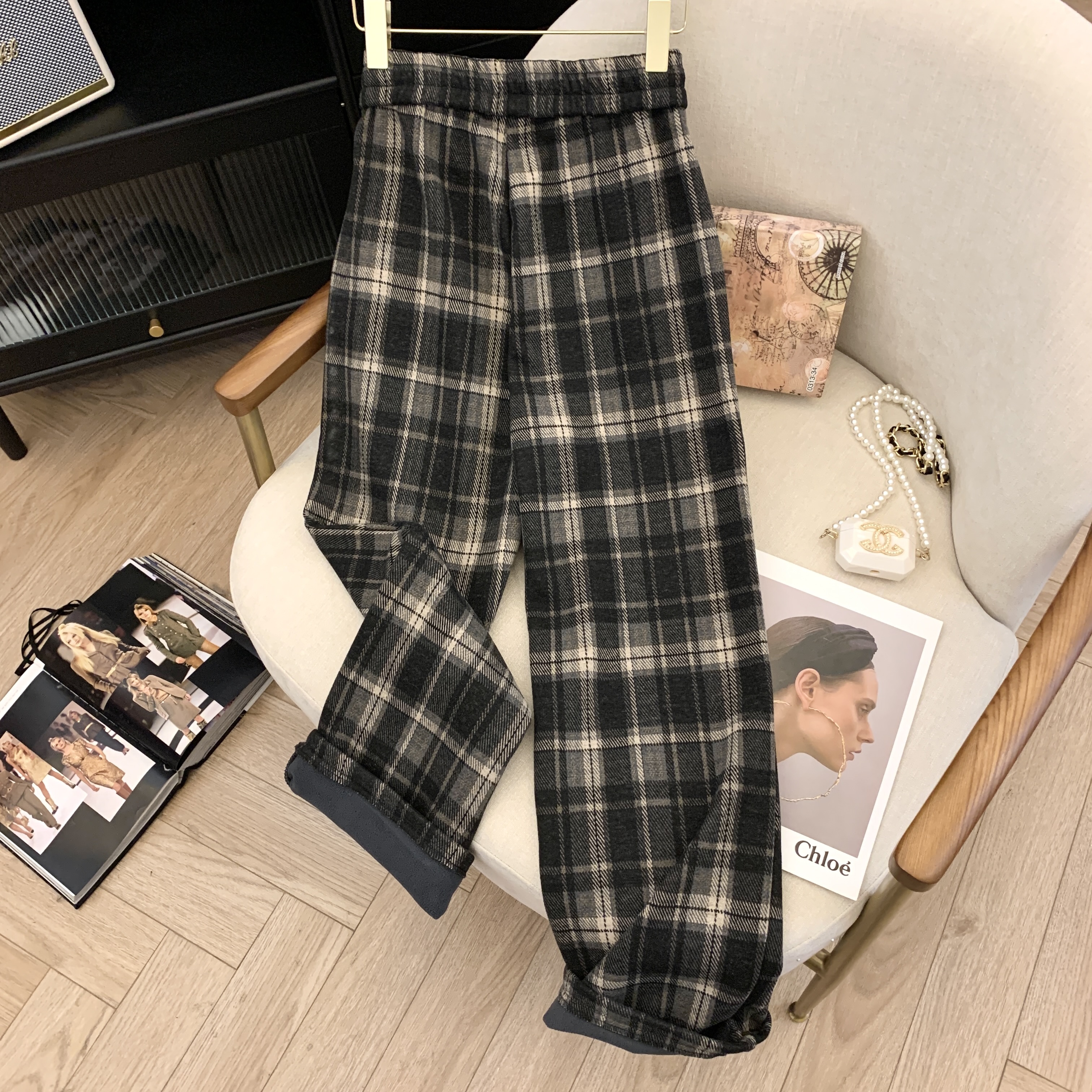 MY14873# 新款加绒格子裤毛呢阔腿裤高腰直筒拖地高腰休闲裤女女裝貨源服裝批發