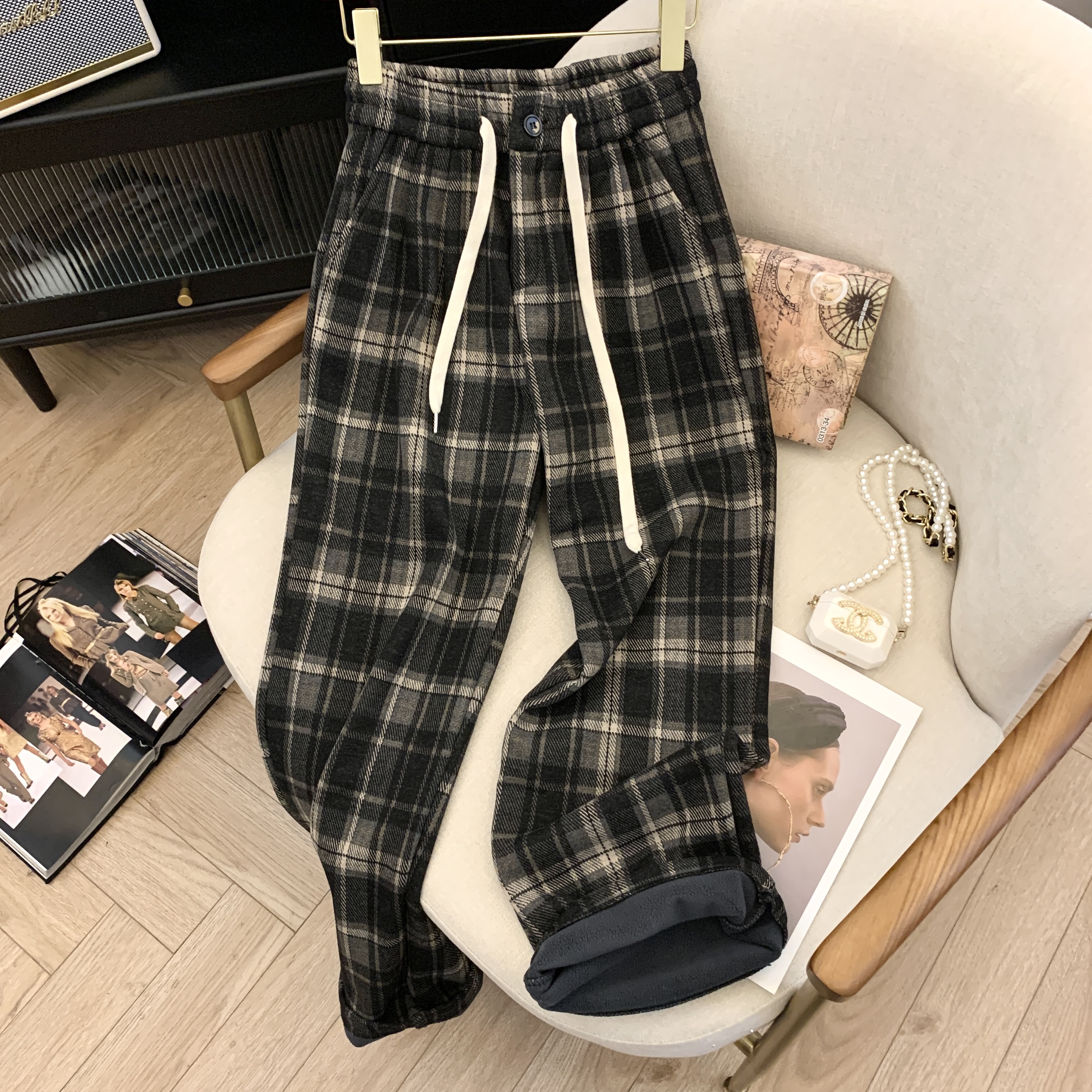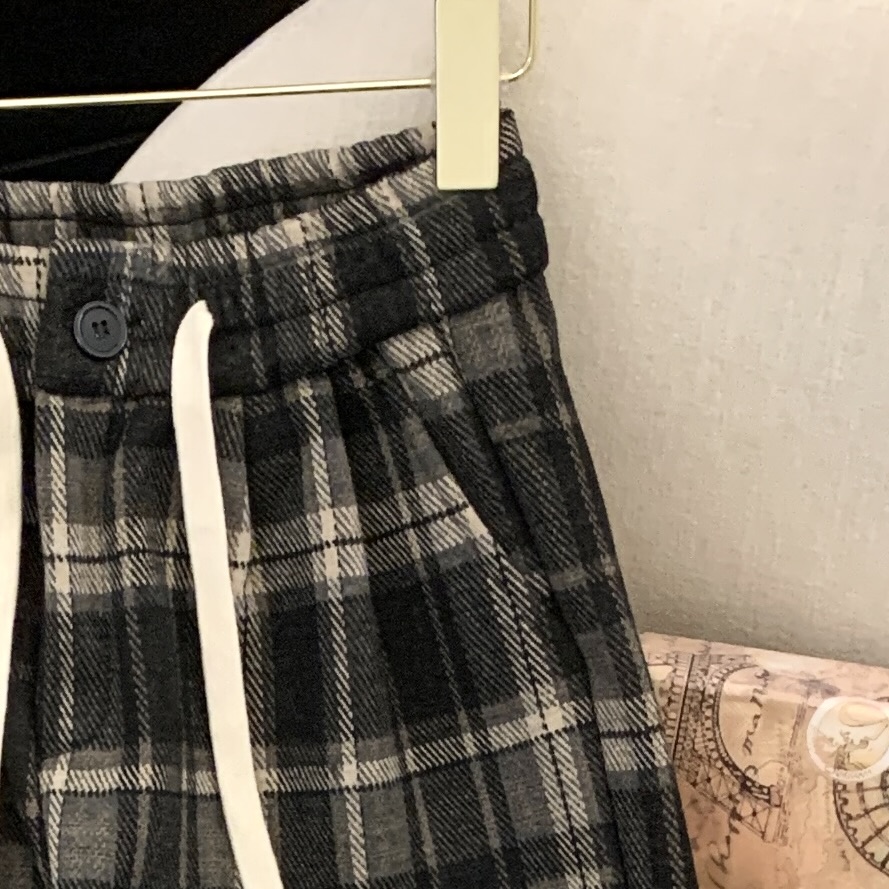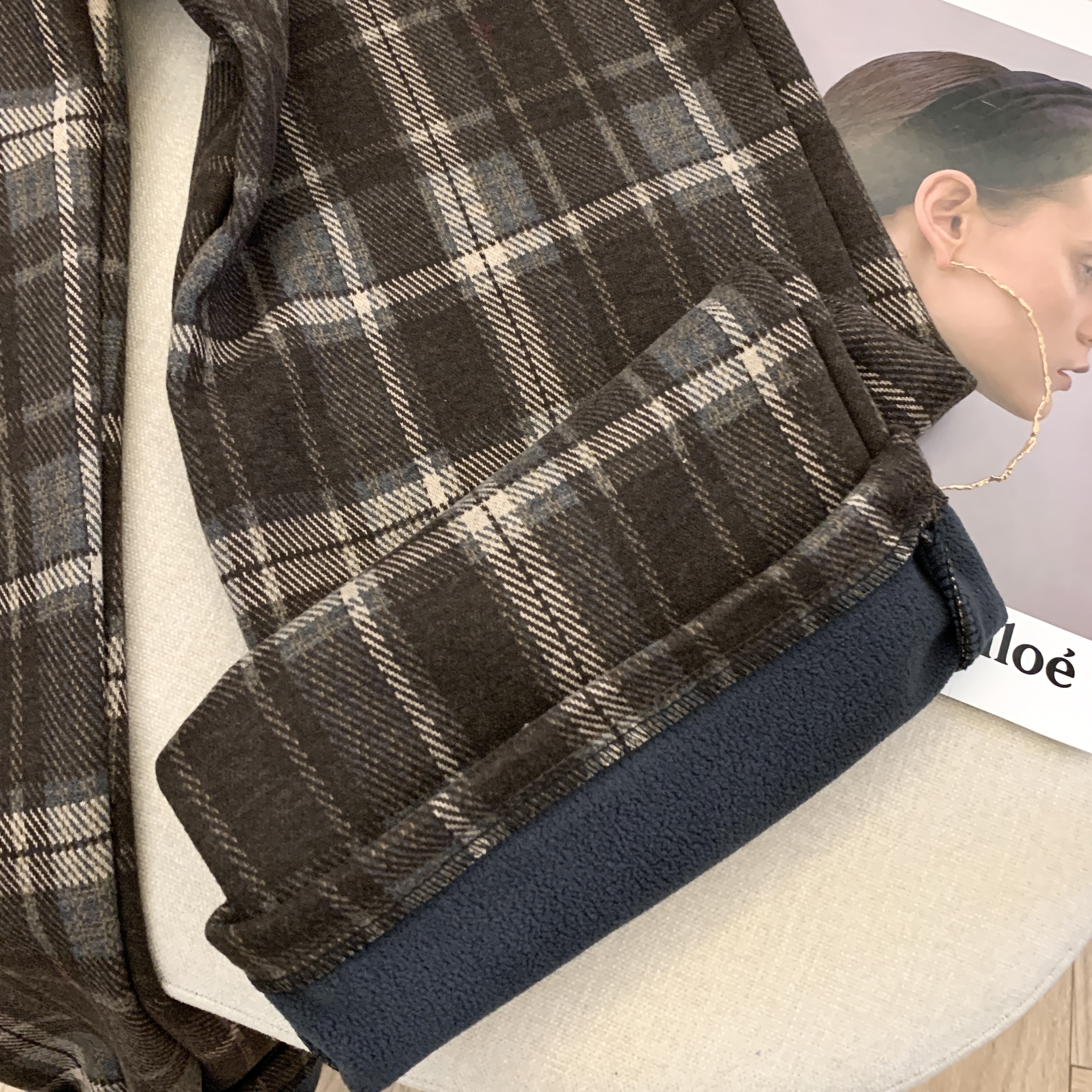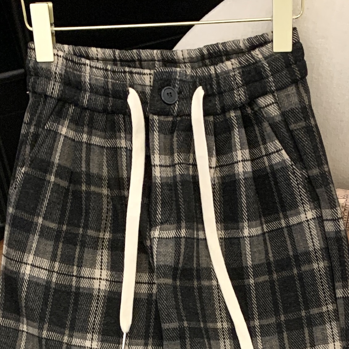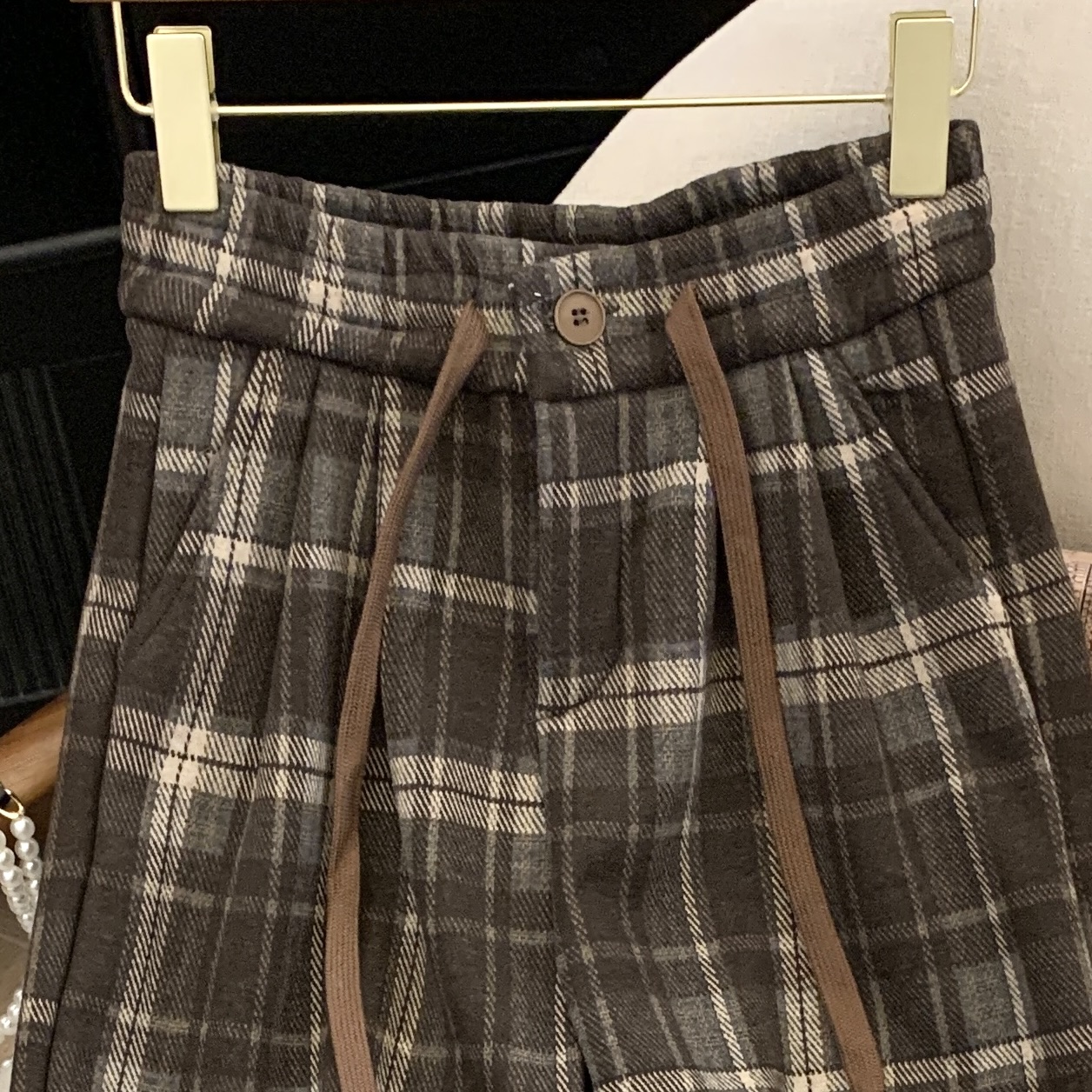 MY14873# 新款加绒格子裤毛呢阔腿裤高腰直筒拖地高腰休闲裤女女裝貨源服裝批發