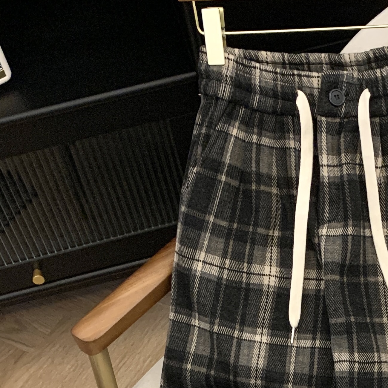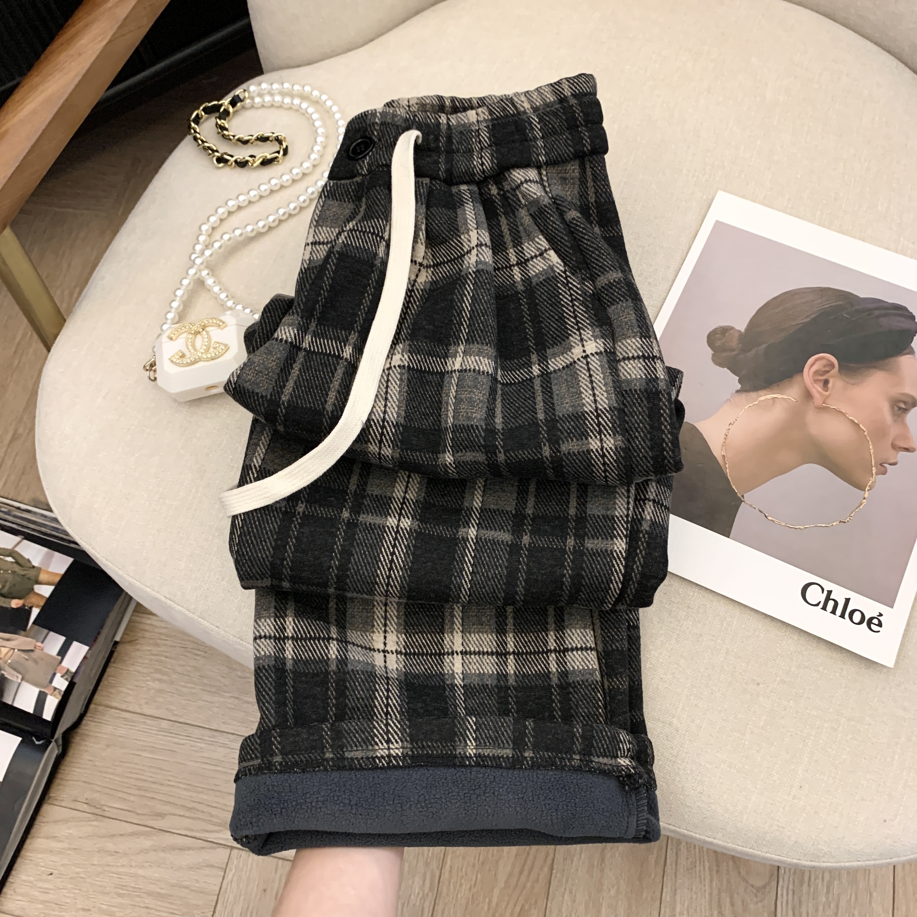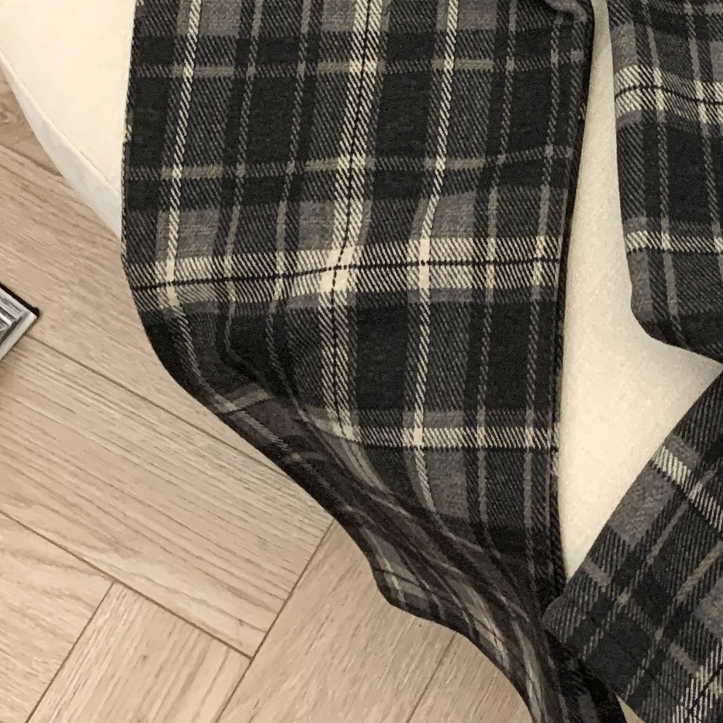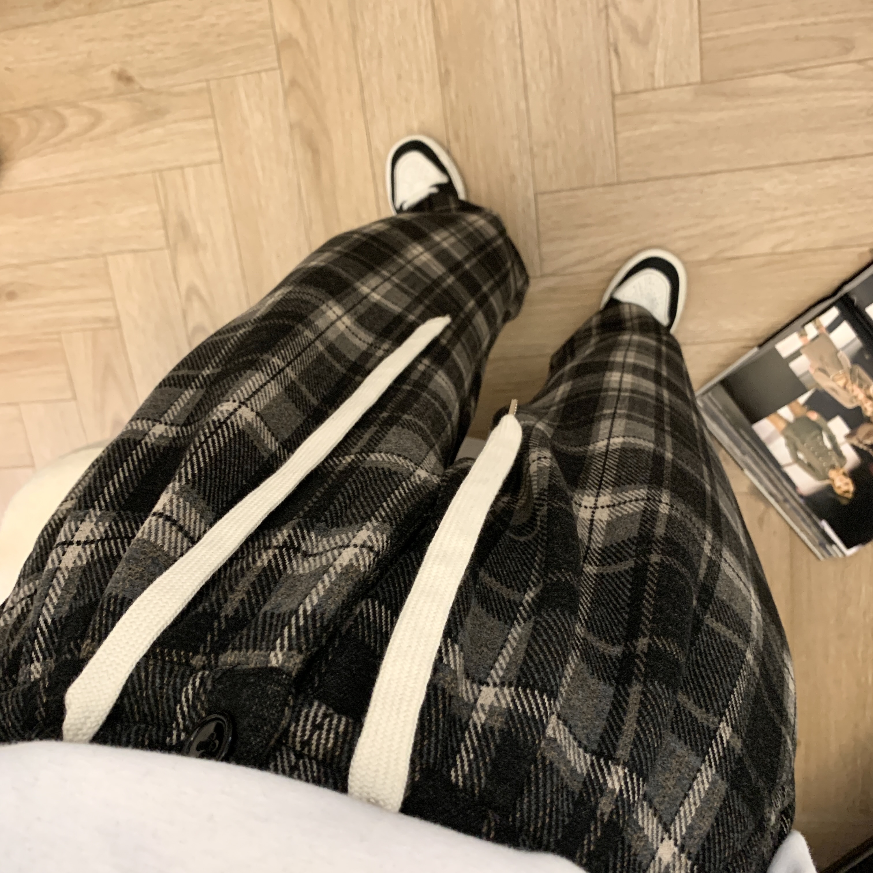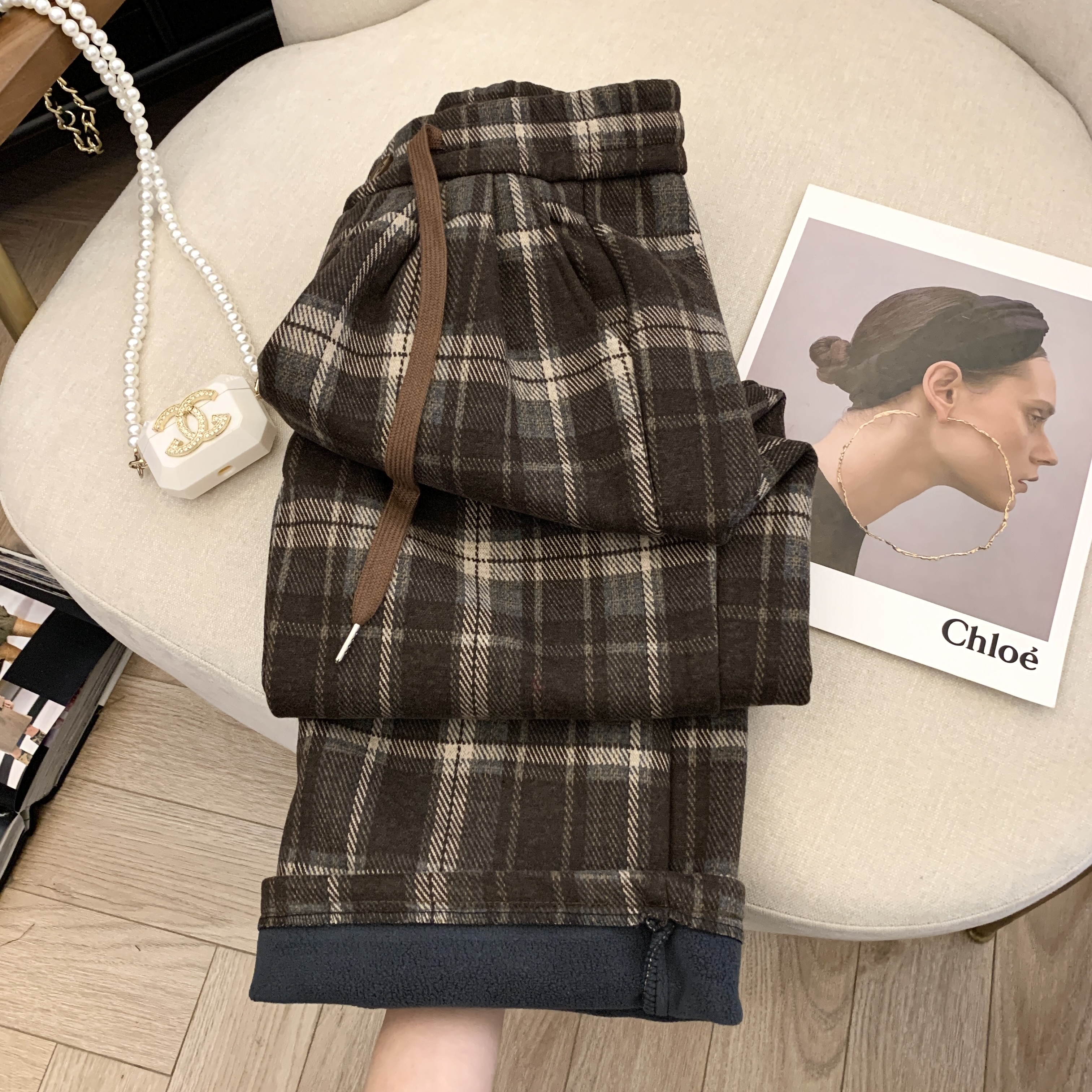 MY14873# 新款加绒格子裤毛呢阔腿裤高腰直筒拖地高腰休闲裤女女裝貨源服裝批發