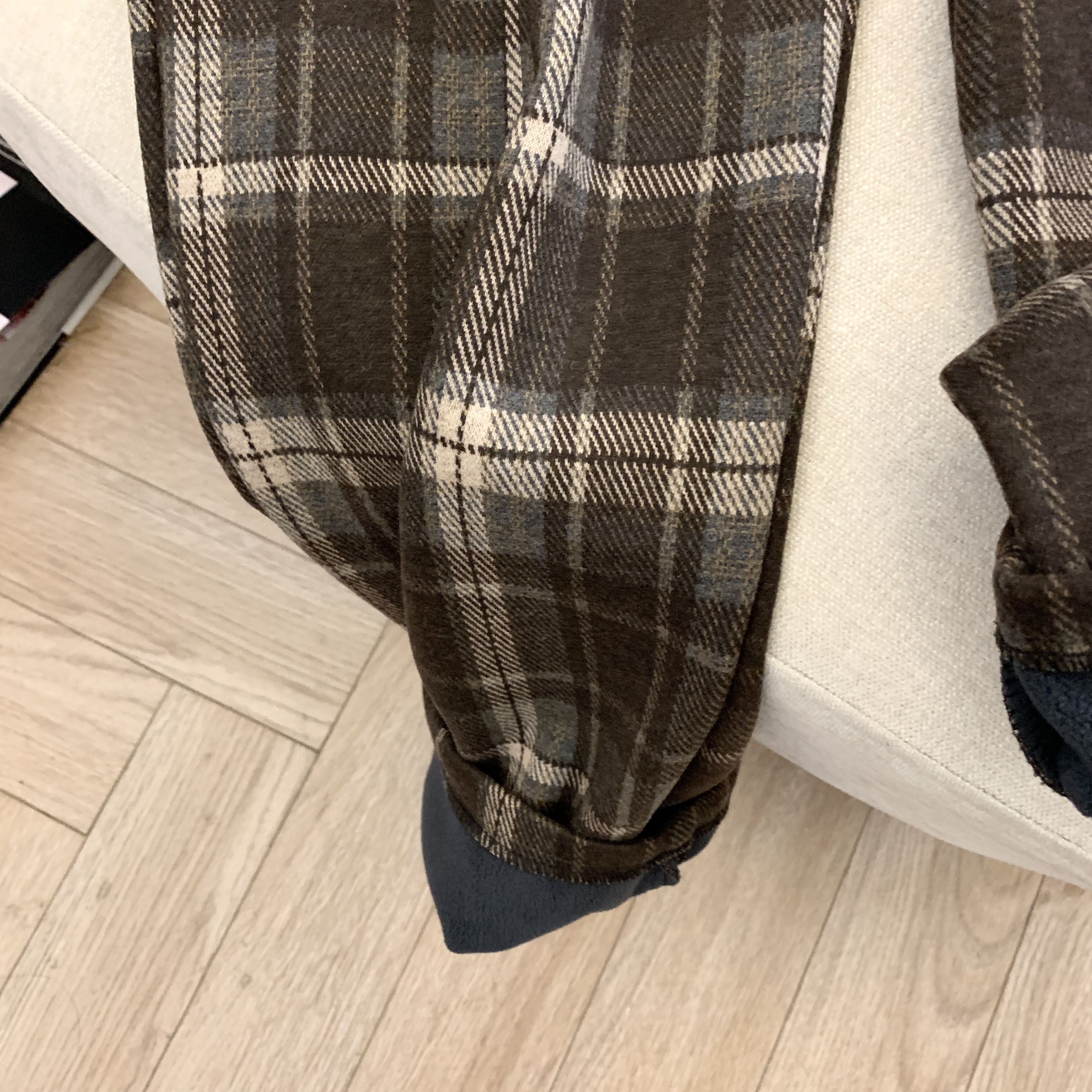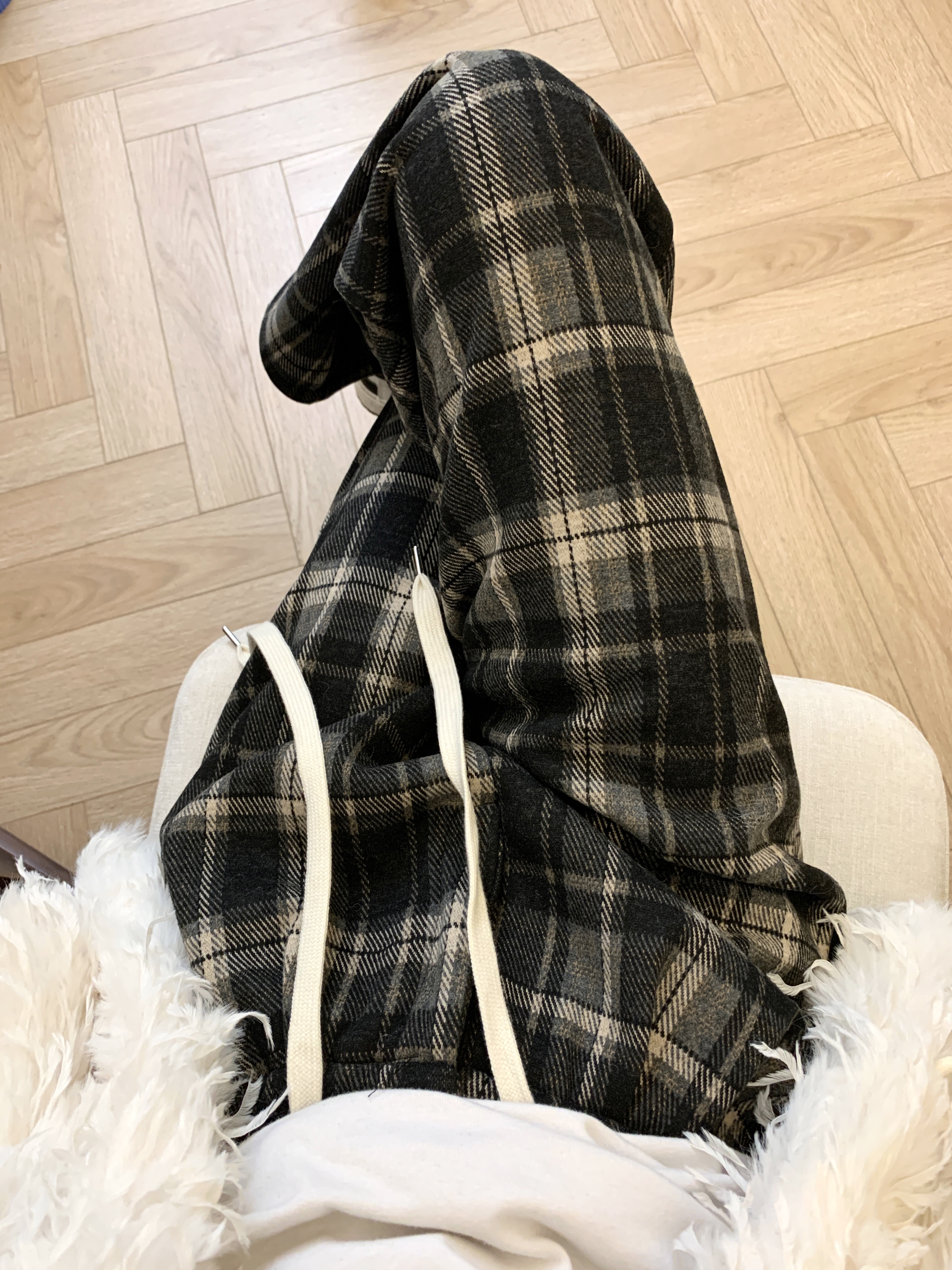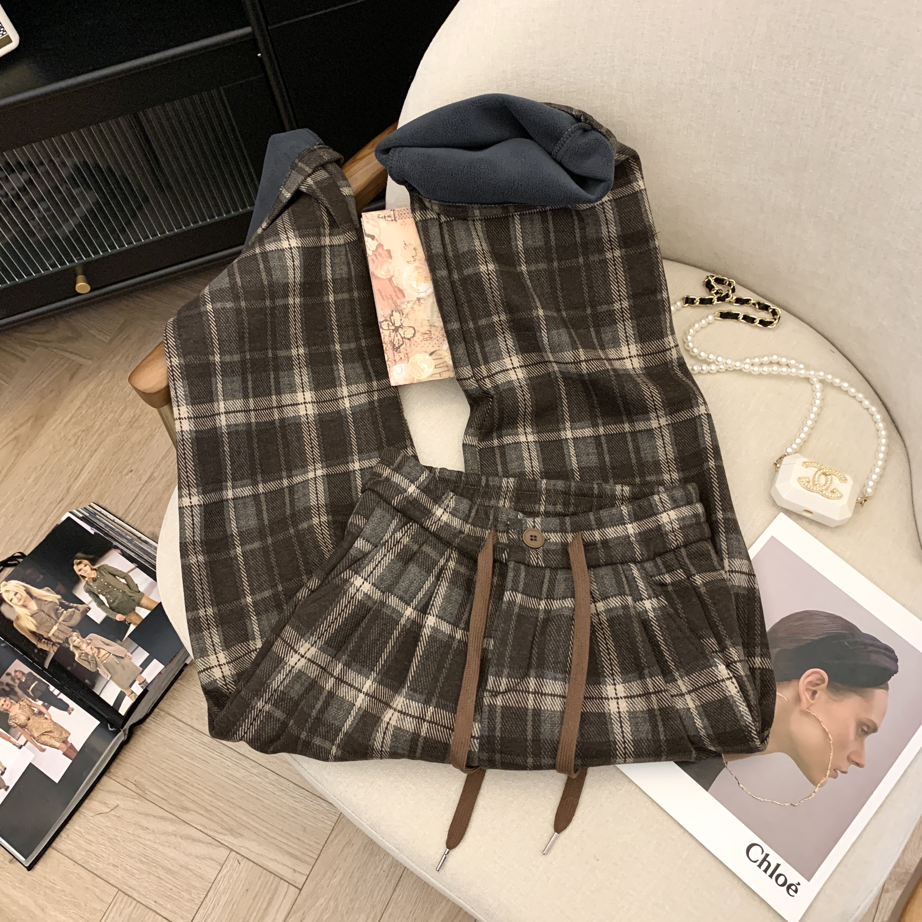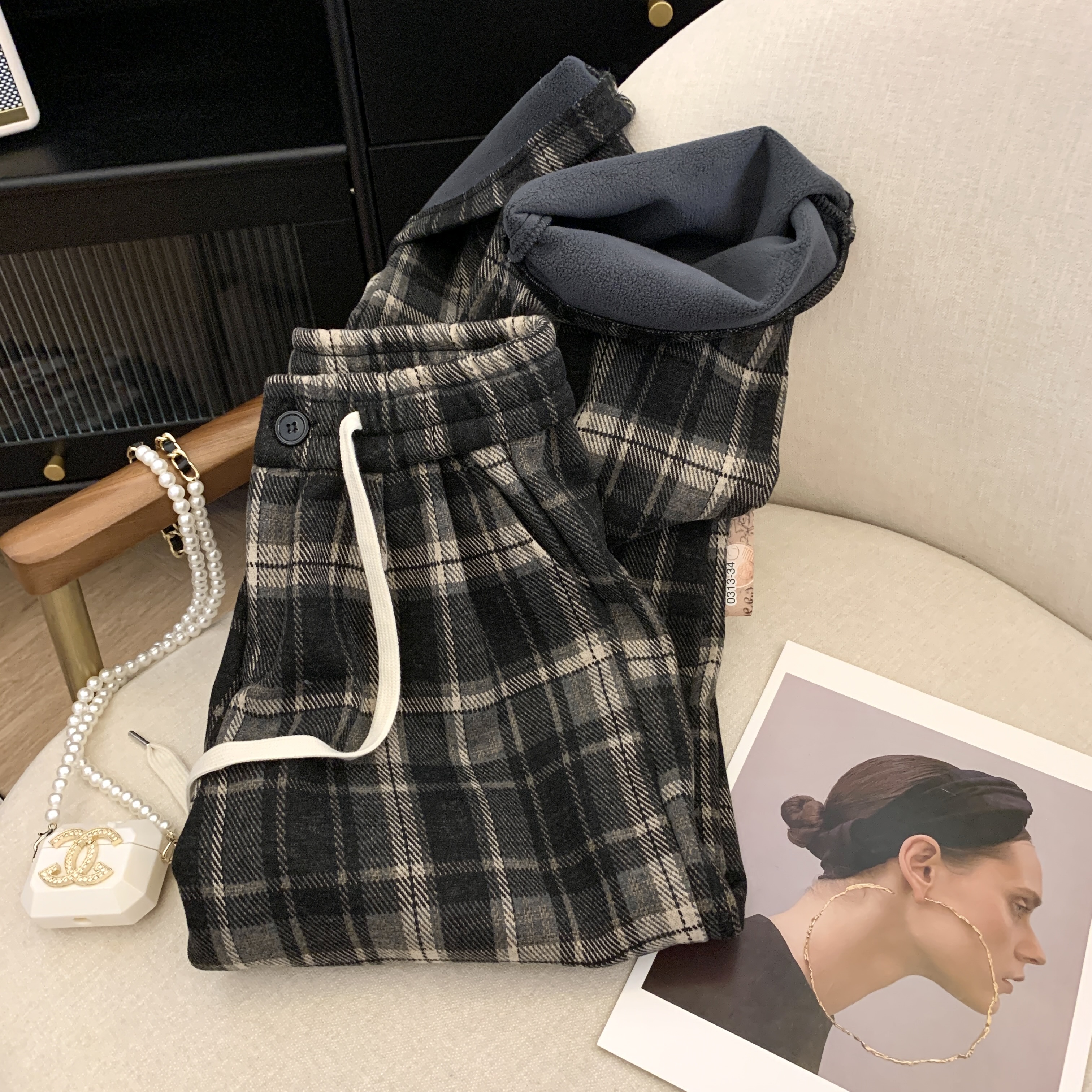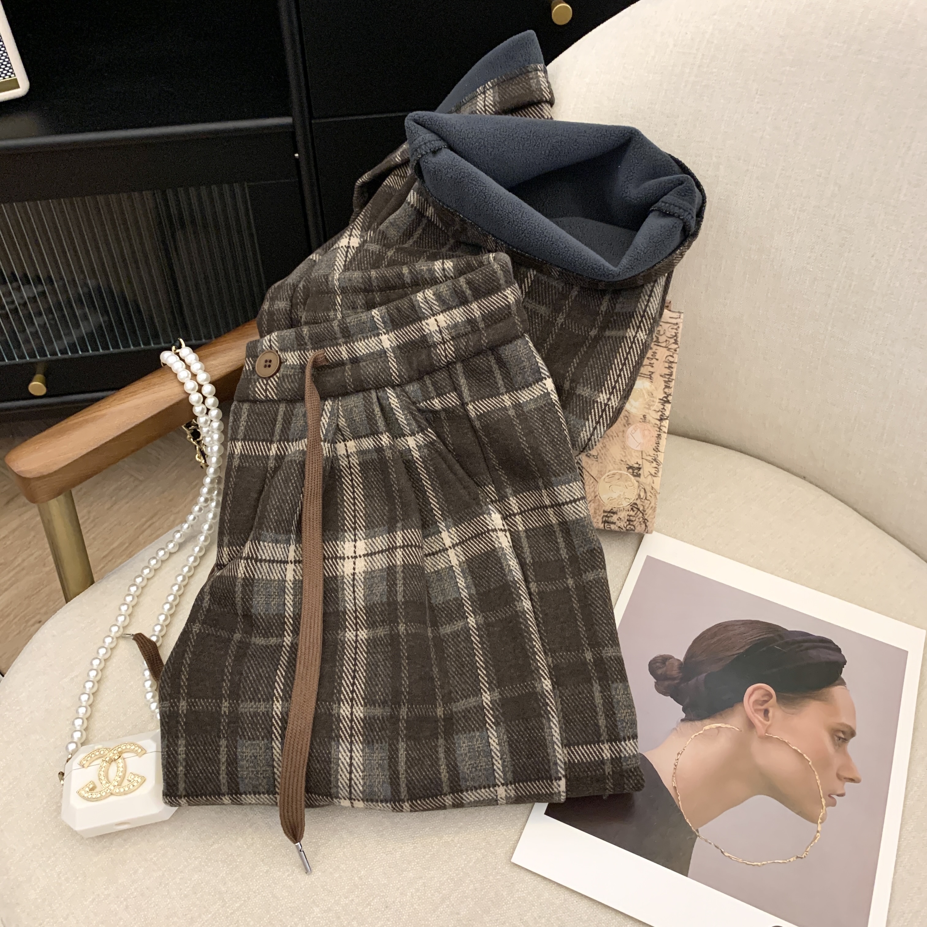 MY14873# 新款加绒格子裤毛呢阔腿裤高腰直筒拖地高腰休闲裤女女裝貨源服裝批發