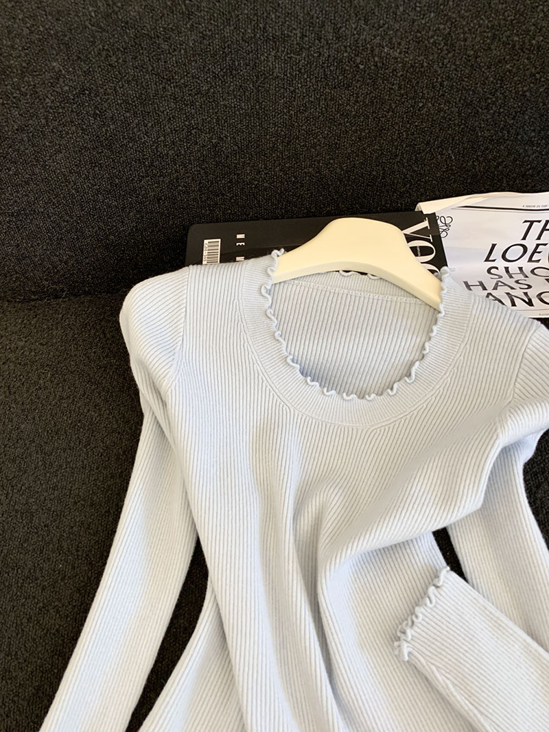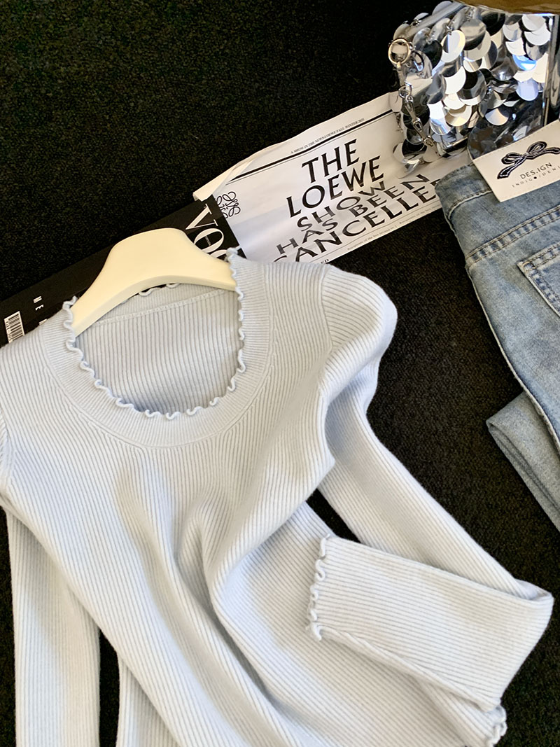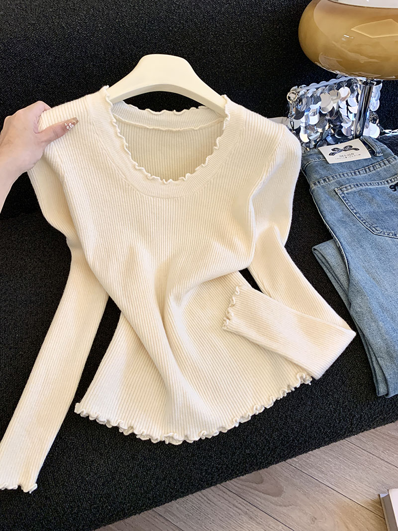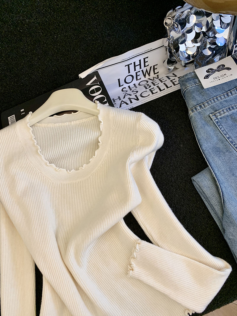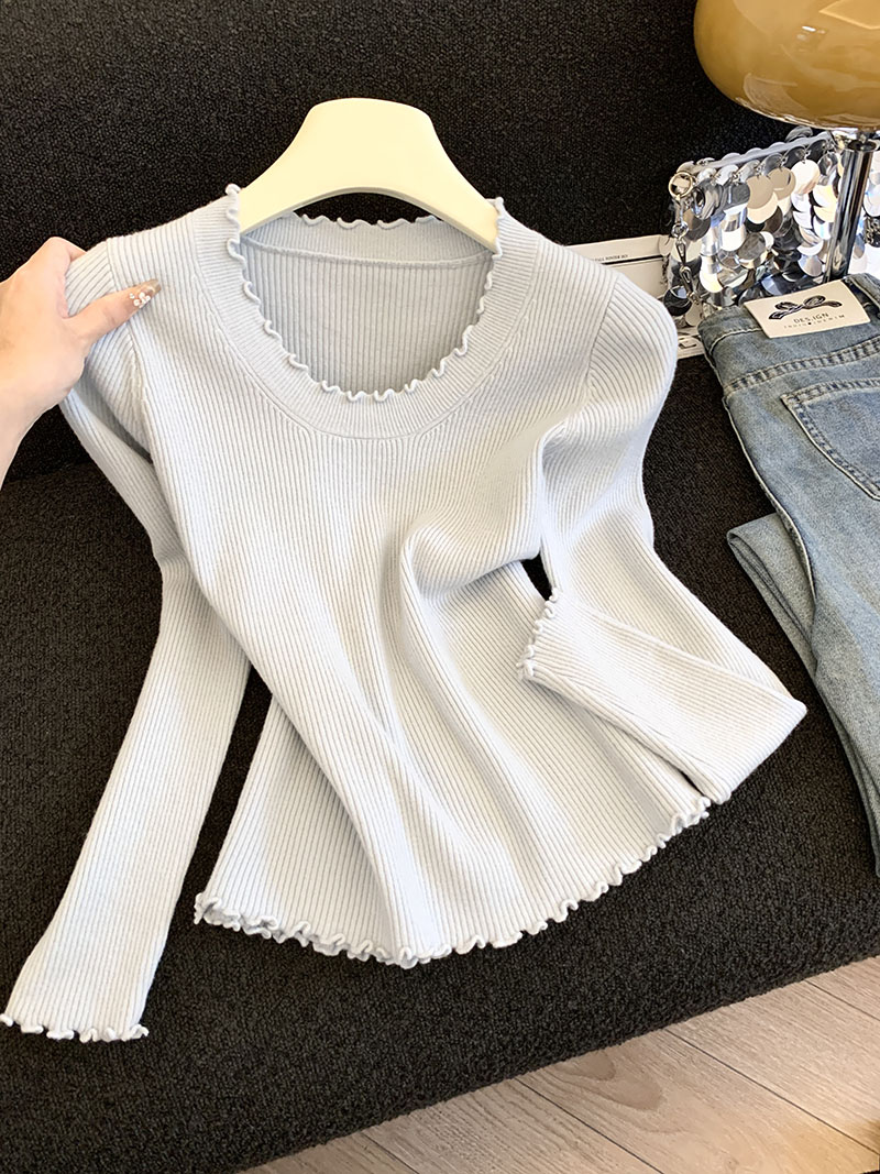 MY14874# 新款宽松慵懒风花边圆领长袖针织衫舒适柔软打底衫上衣女女裝貨源服裝批發