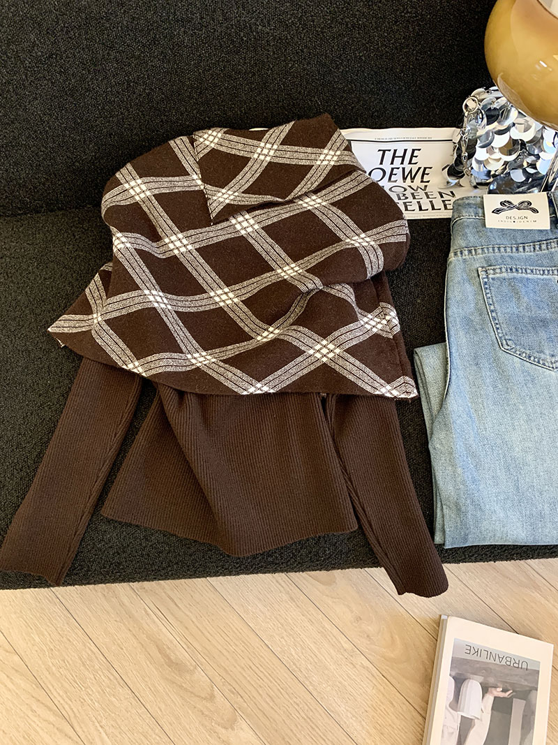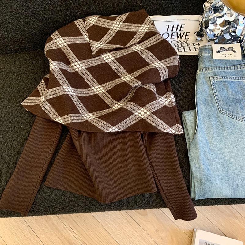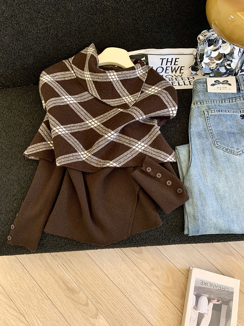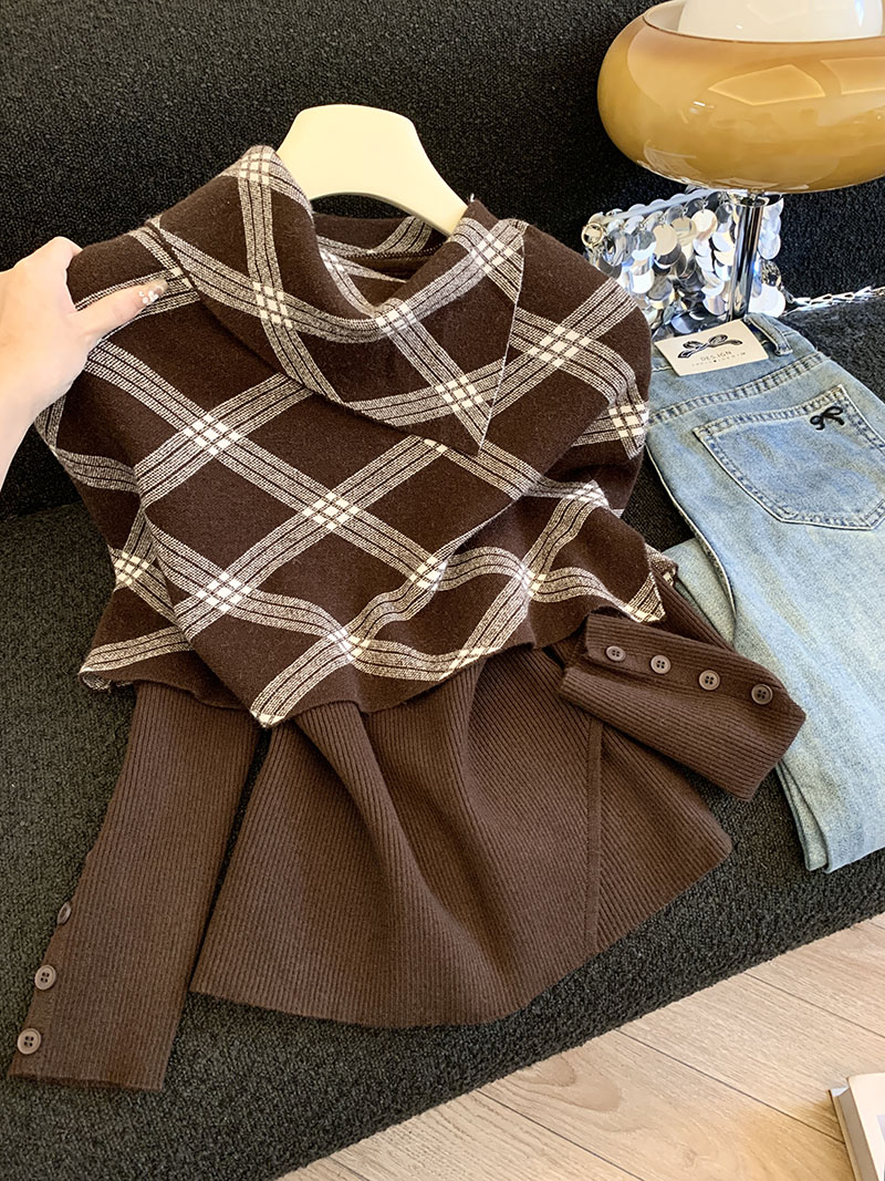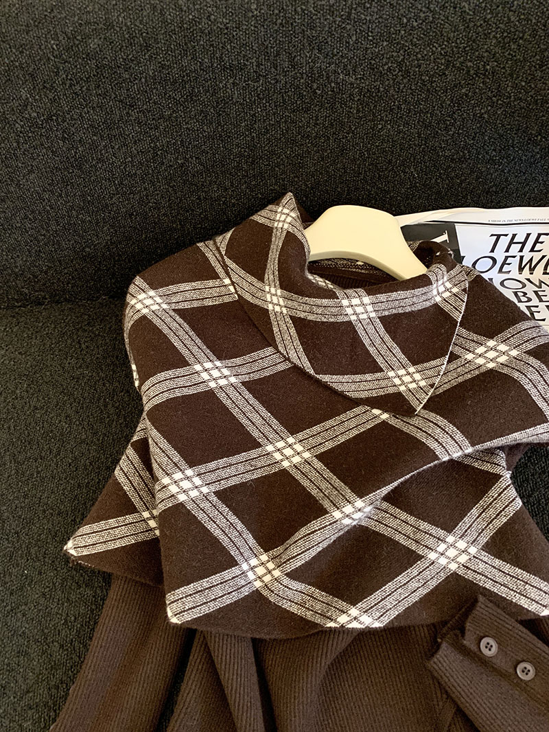 MY14875# 新款韩版修身两件套格子斗篷披肩加简约套头毛衣女裝貨源服裝批發