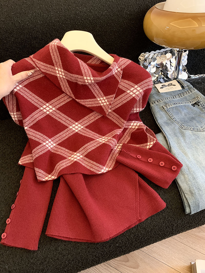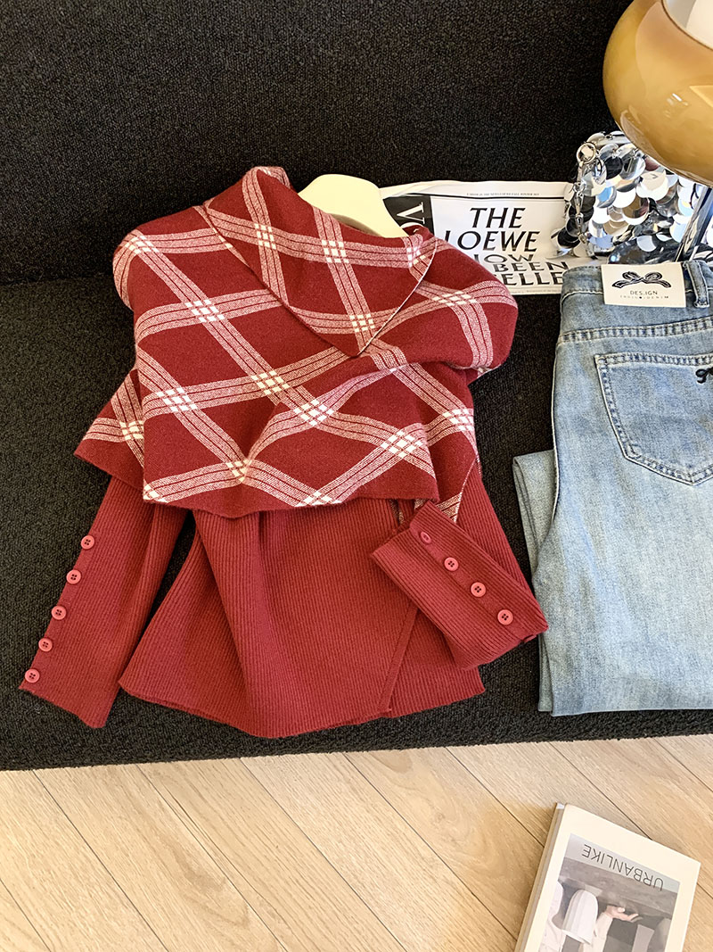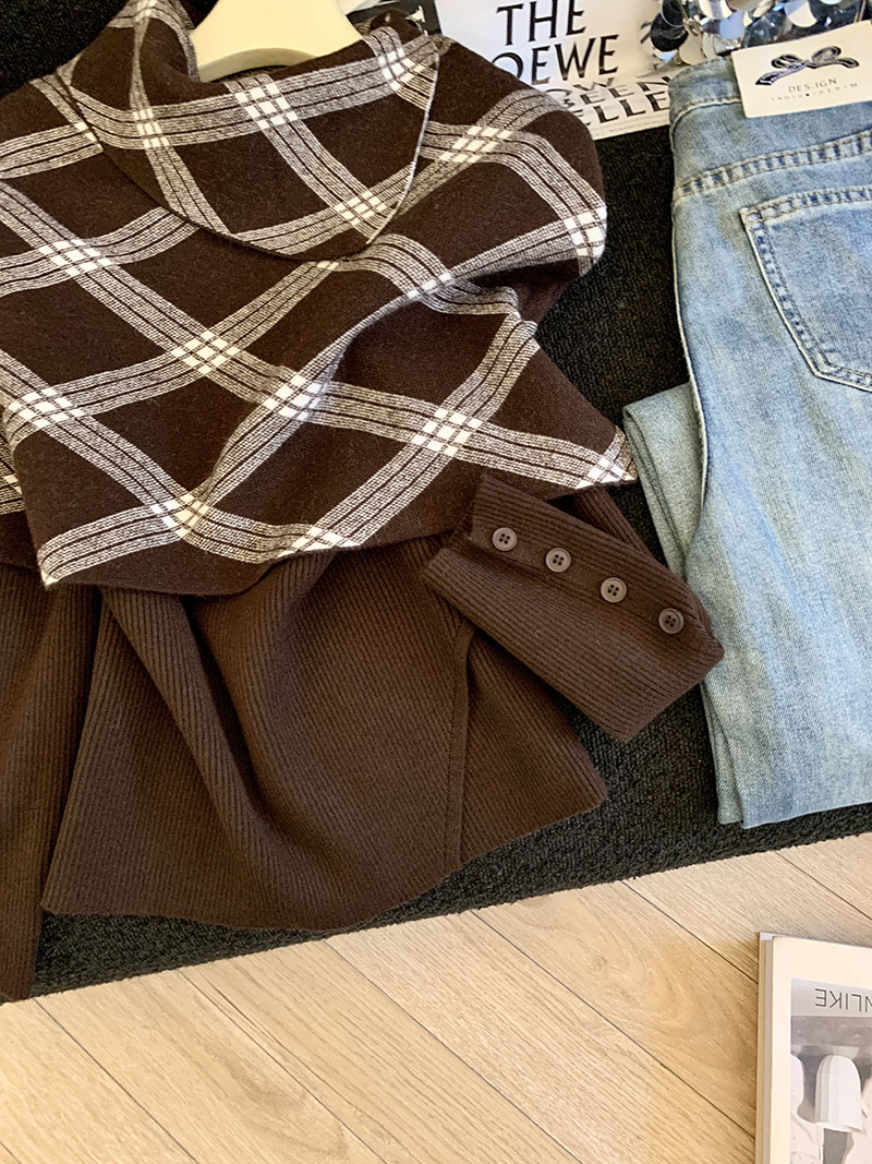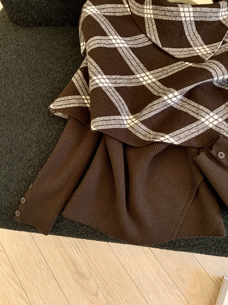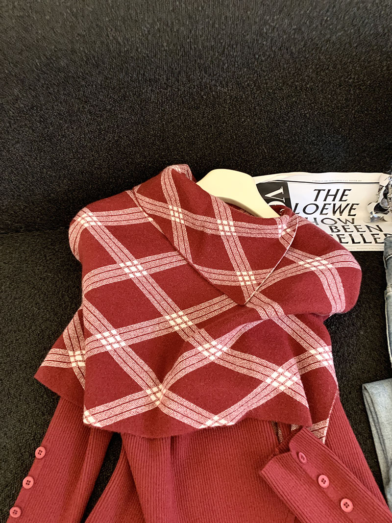 MY14875# 新款韩版修身两件套格子斗篷披肩加简约套头毛衣女裝貨源服裝批發