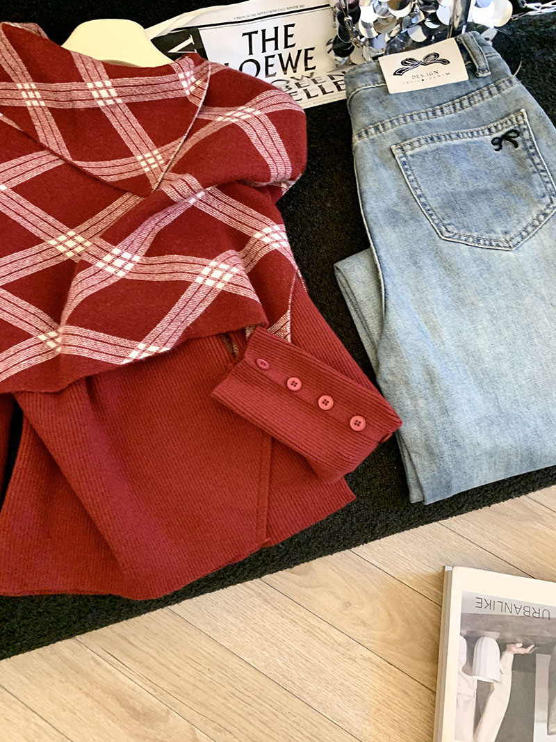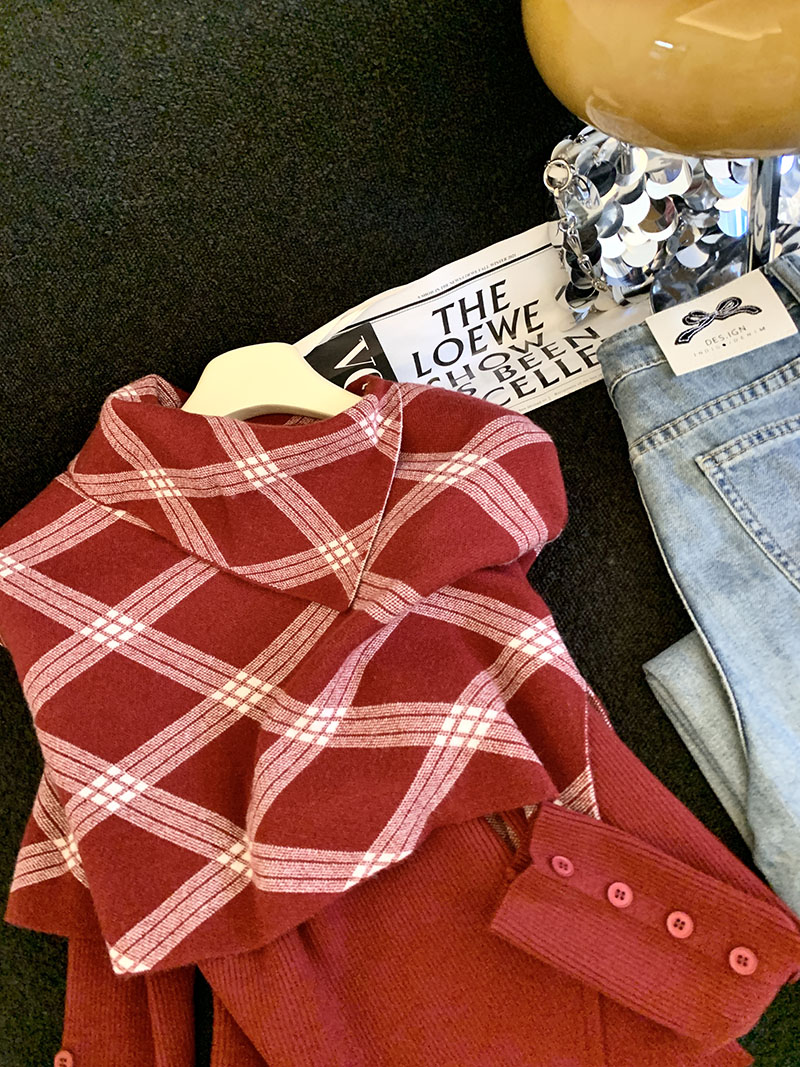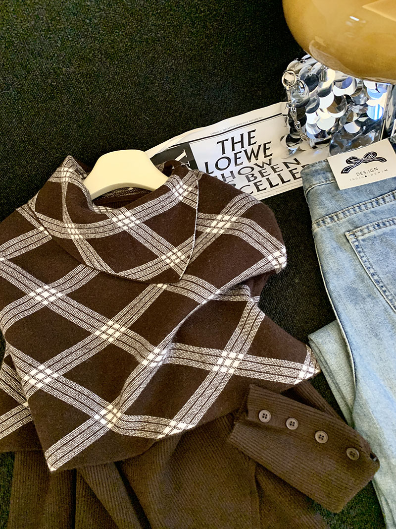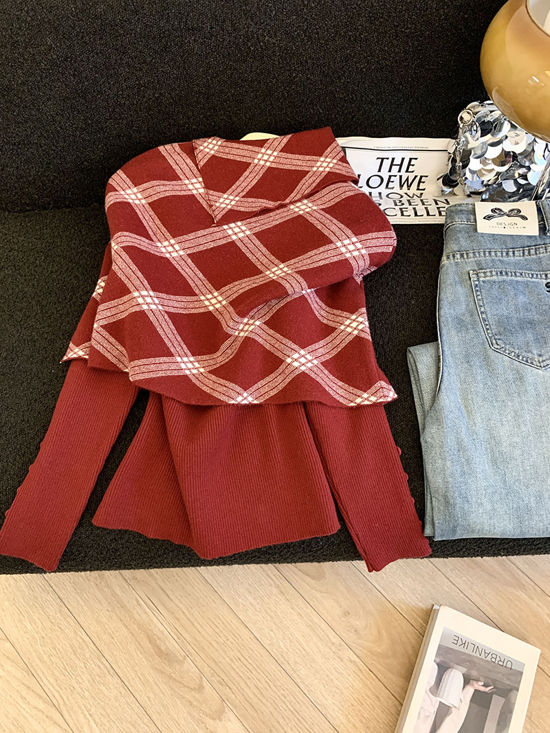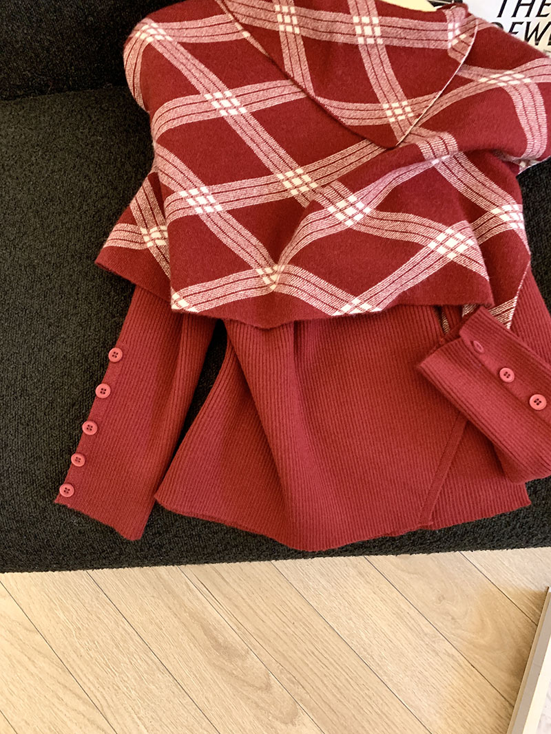 MY14875# 新款韩版修身两件套格子斗篷披肩加简约套头毛衣女裝貨源服裝批發