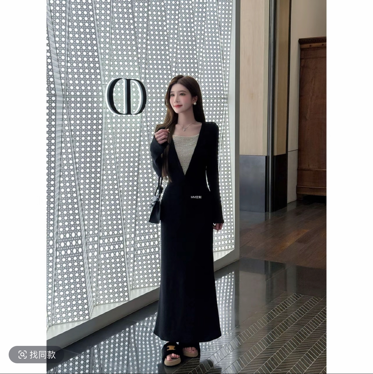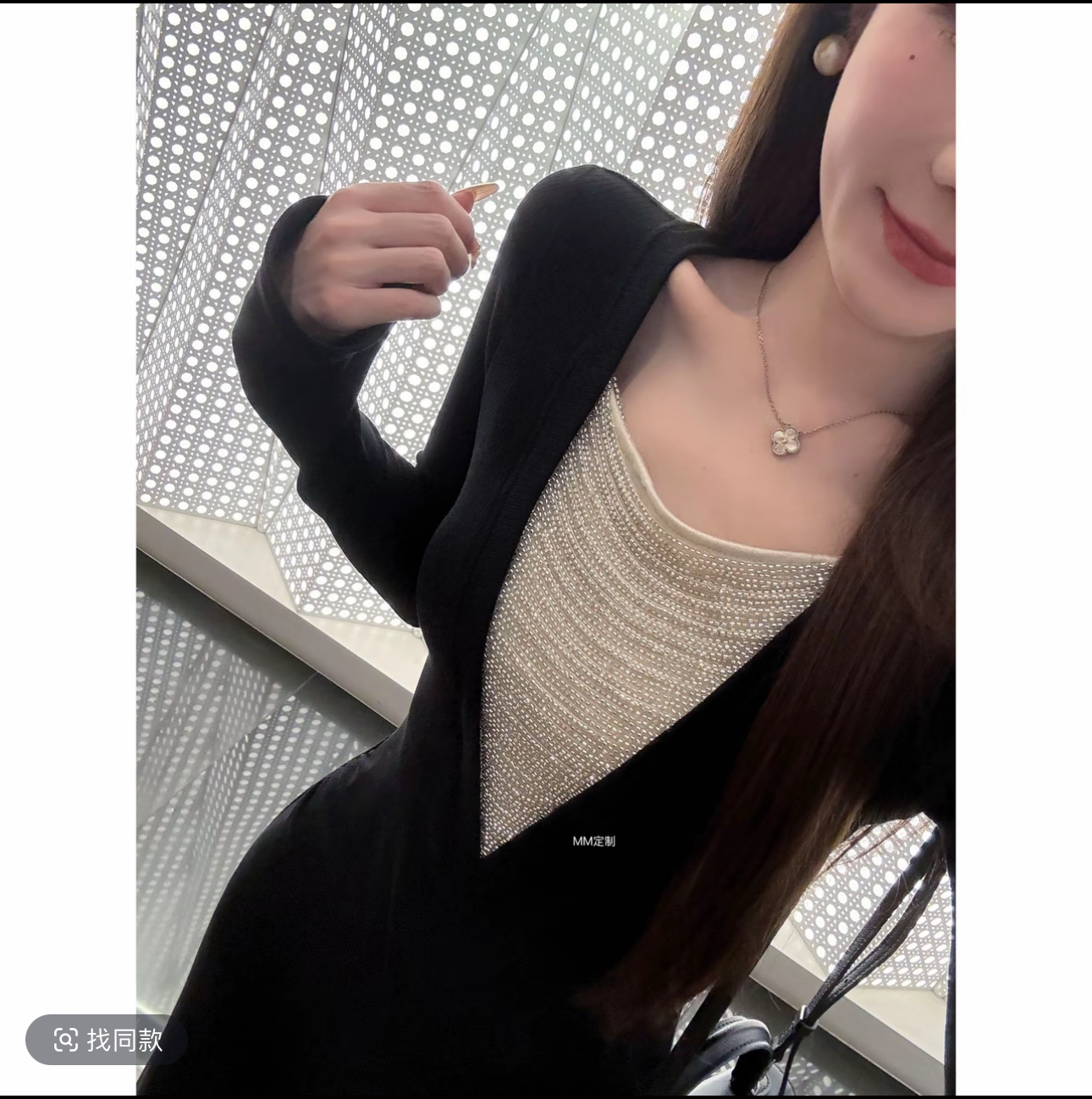 MY14881# 人生限定月夜巴黎设计感深V领重工珠链拼接打褶显瘦连衣裙女裝貨源服裝批發