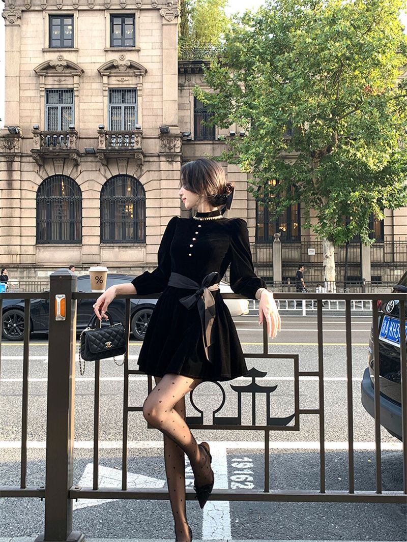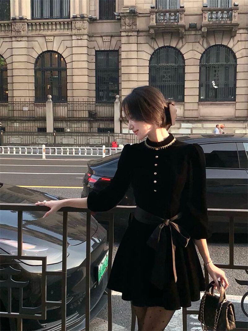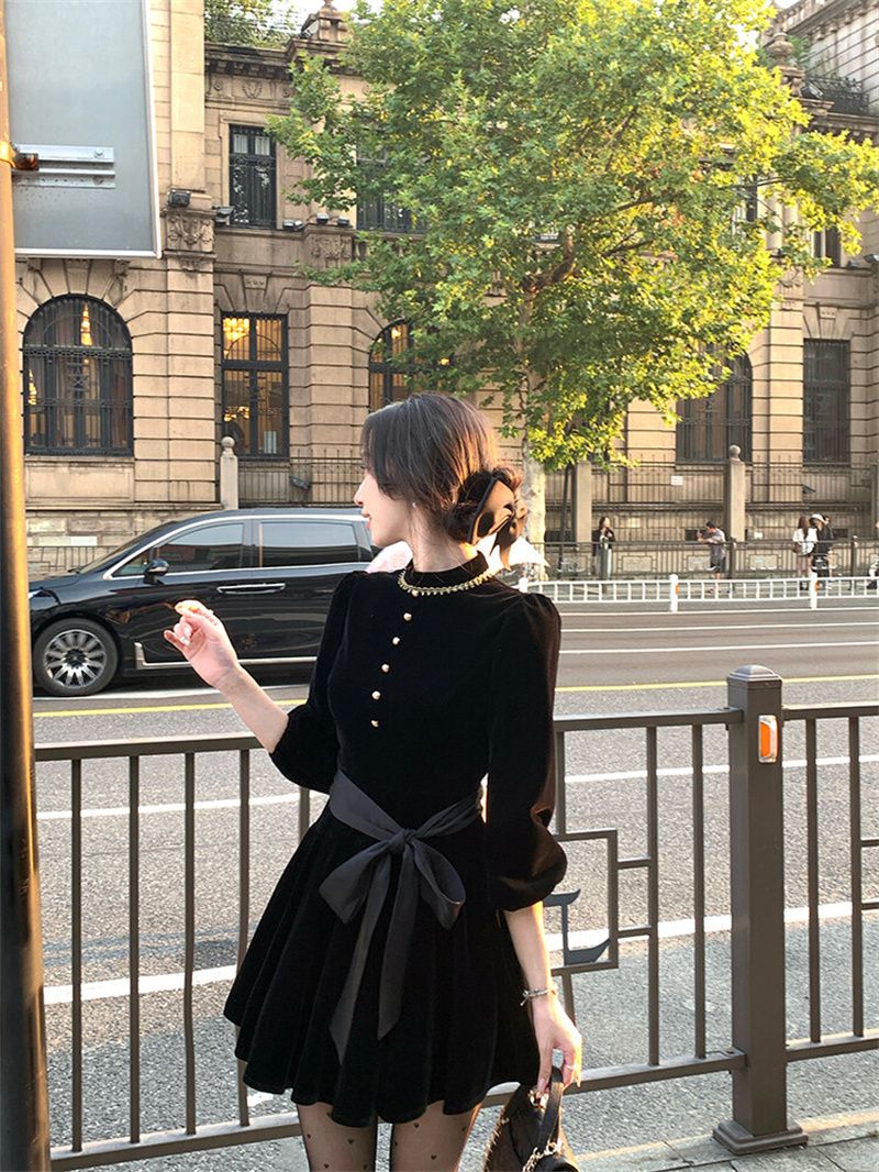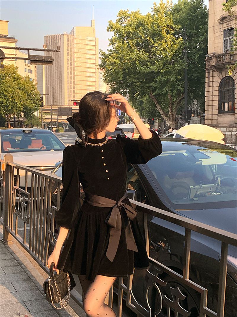 MY14912# 法式赫本风黑色丝绒长袖连衣裙高级感蝴蝶结收腰蓬蓬小黑裙女裝貨源服裝批發