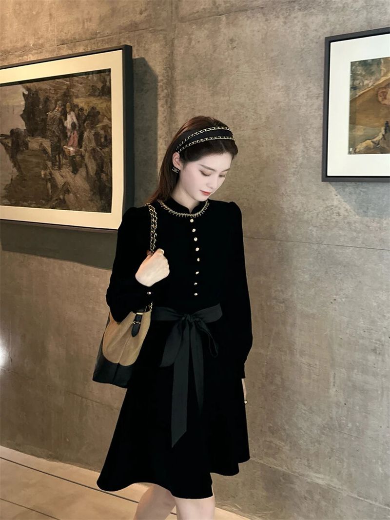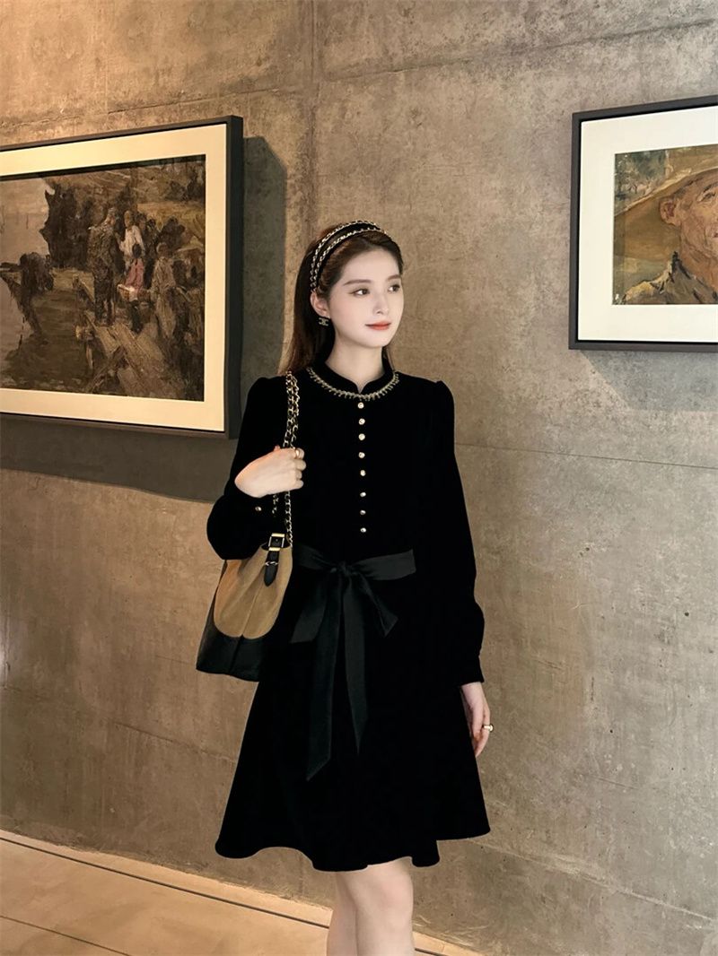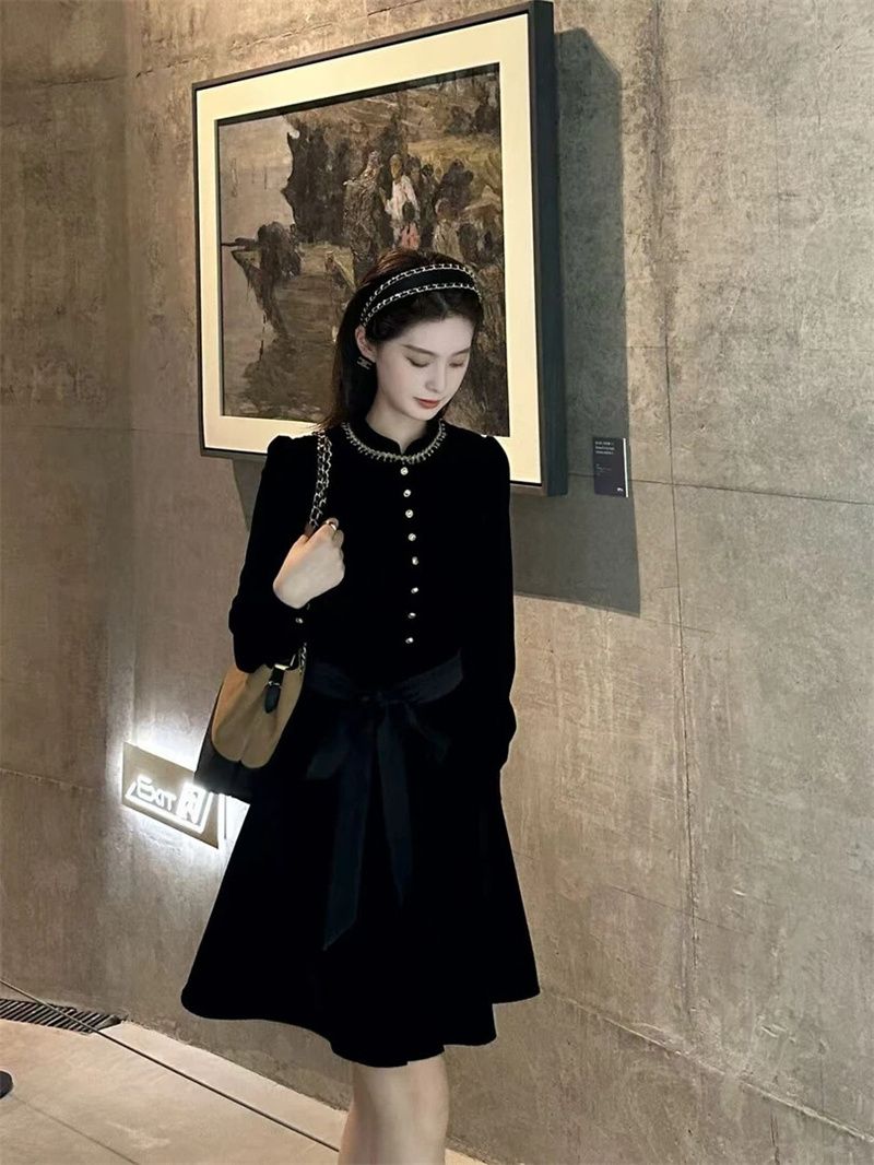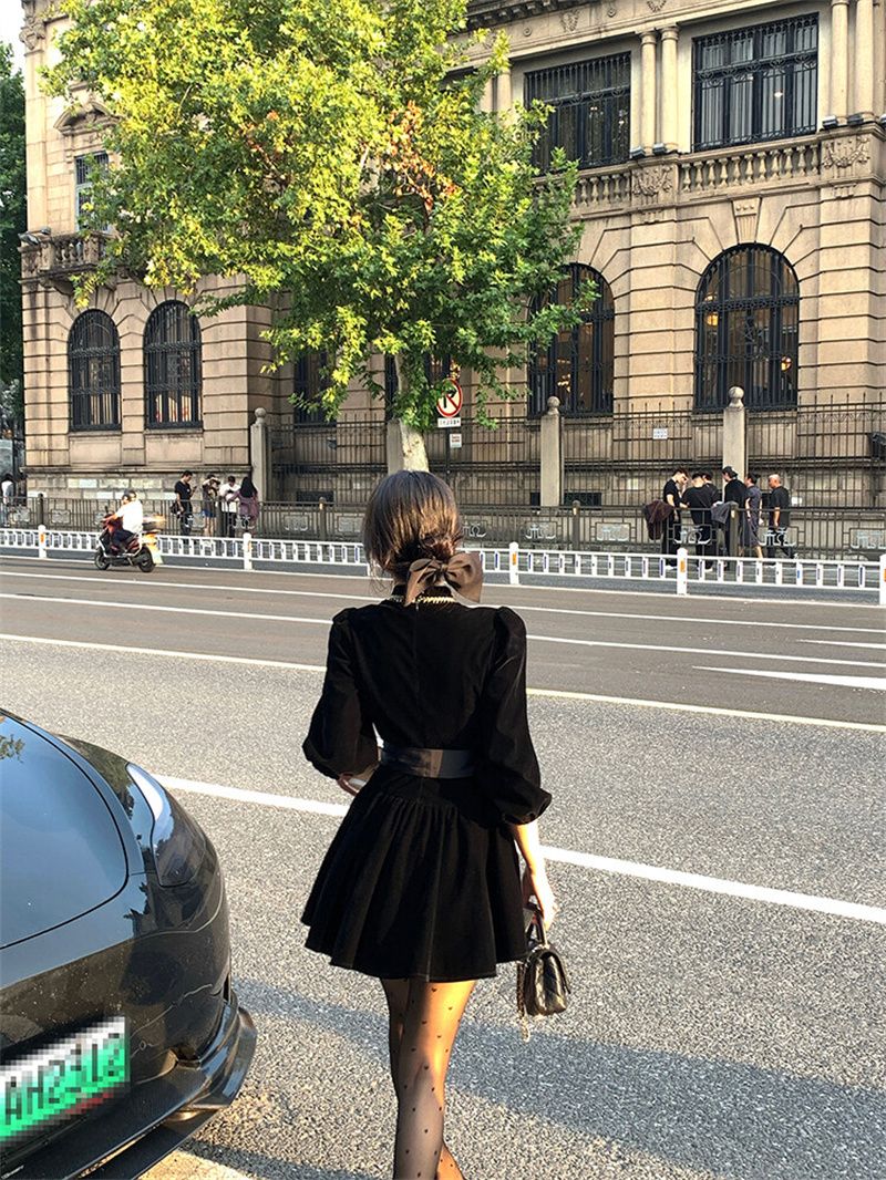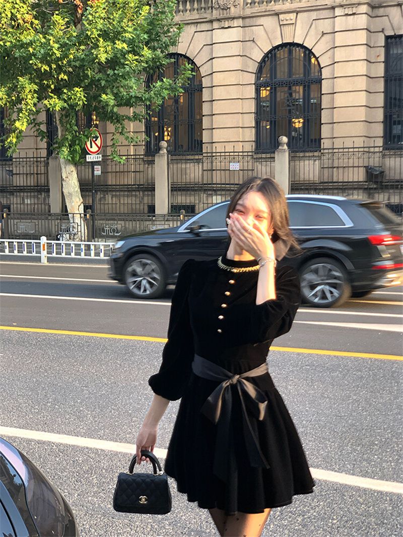 MY14912# 法式赫本风黑色丝绒长袖连衣裙高级感蝴蝶结收腰蓬蓬小黑裙女裝貨源服裝批發