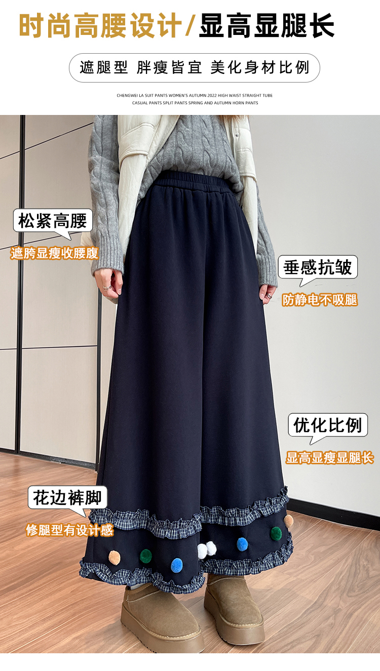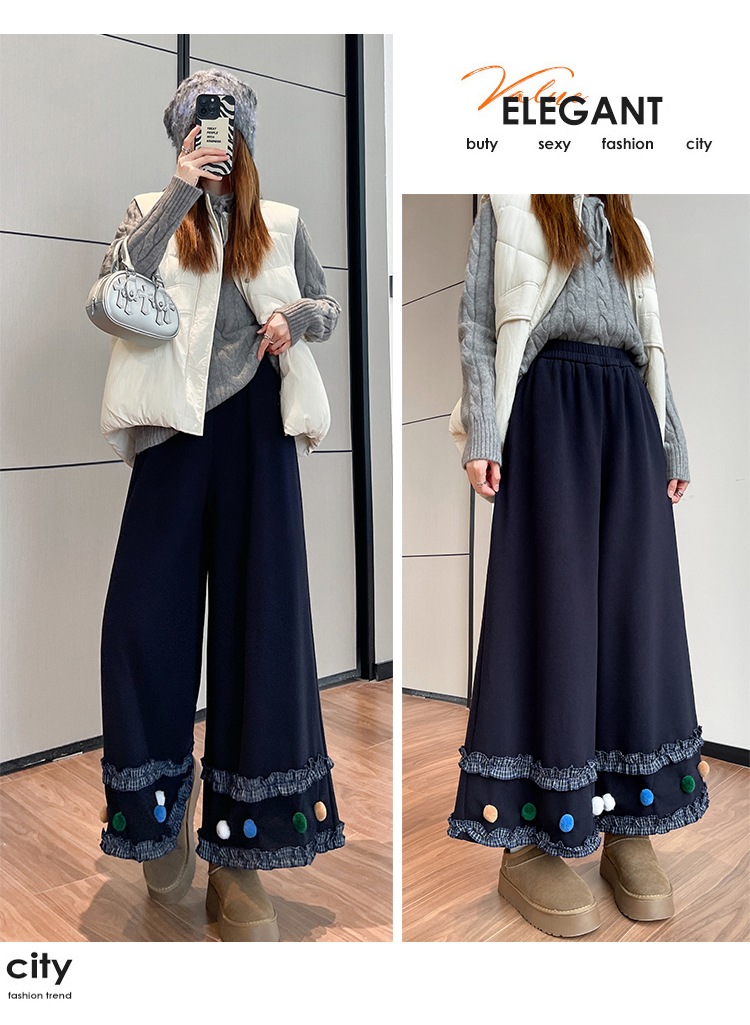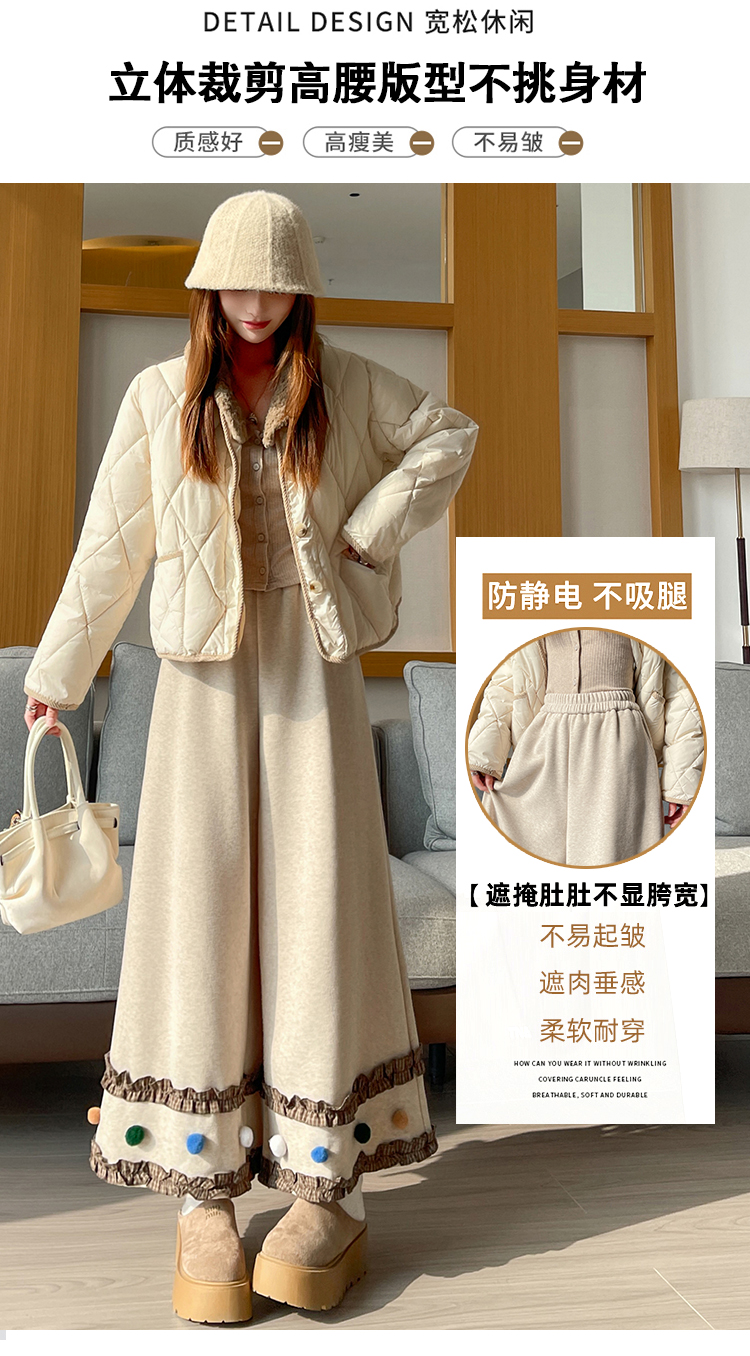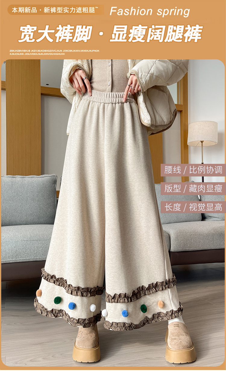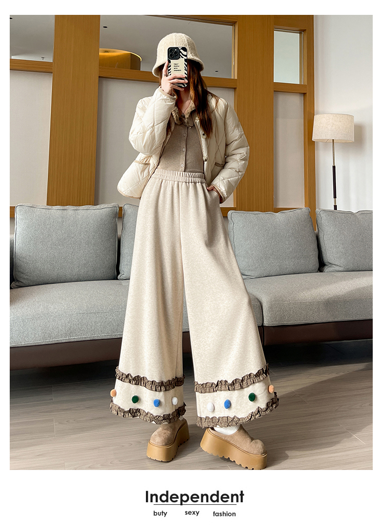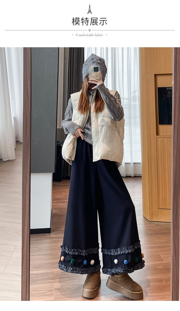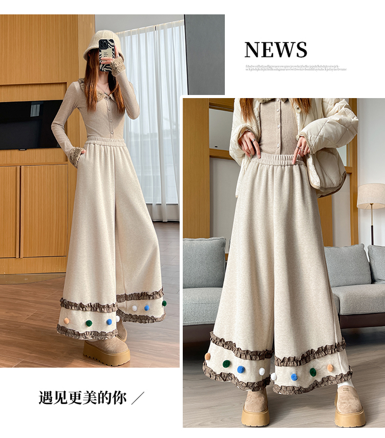 MY14932# 新款花边毛球加绒羊绒阔腿裤女高腰直筒小个子休闲裤女裝貨源服裝批發