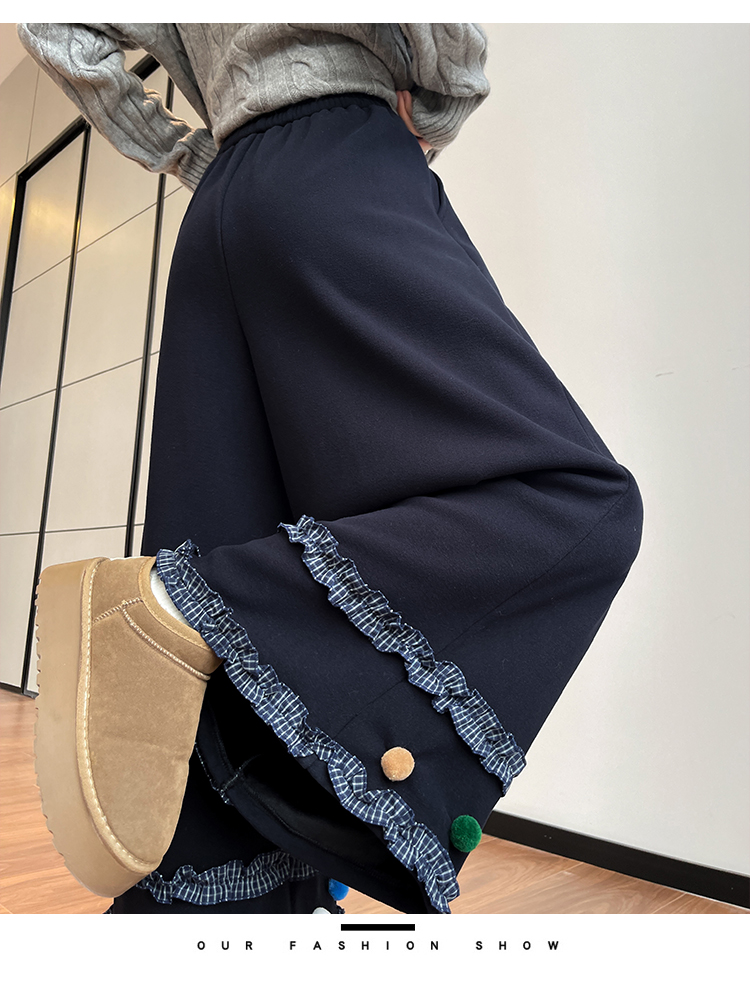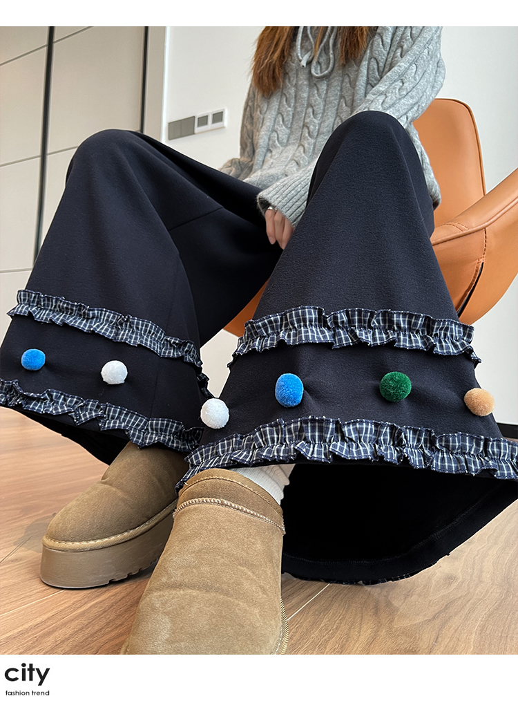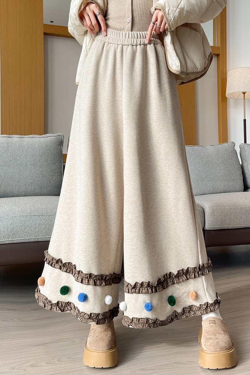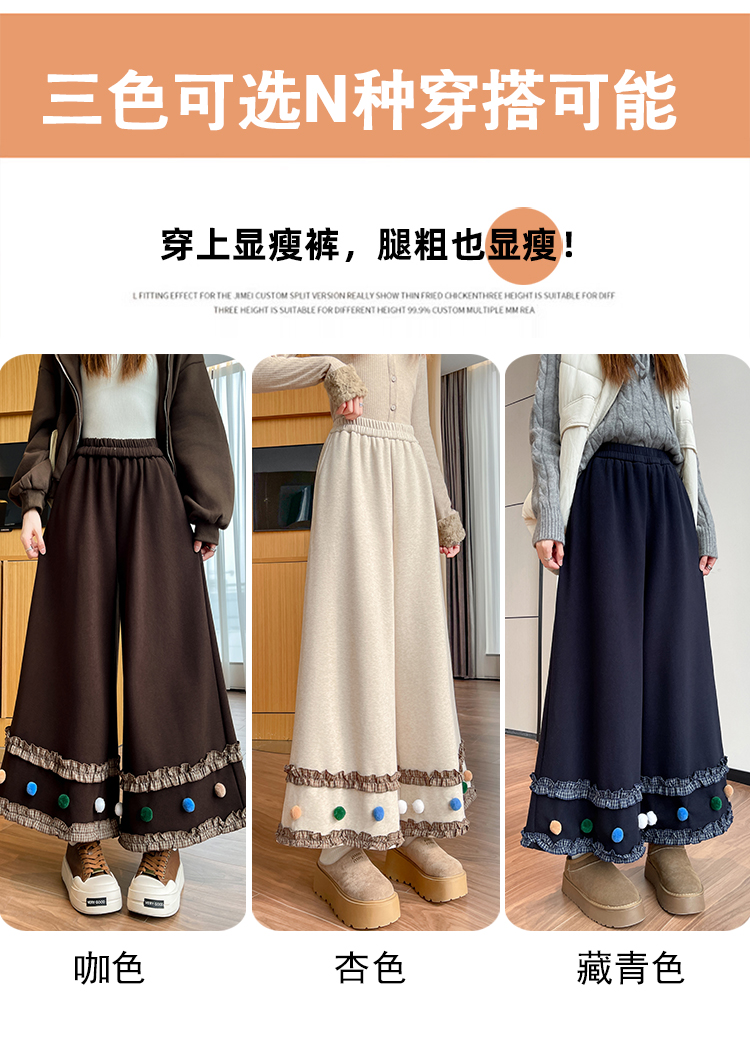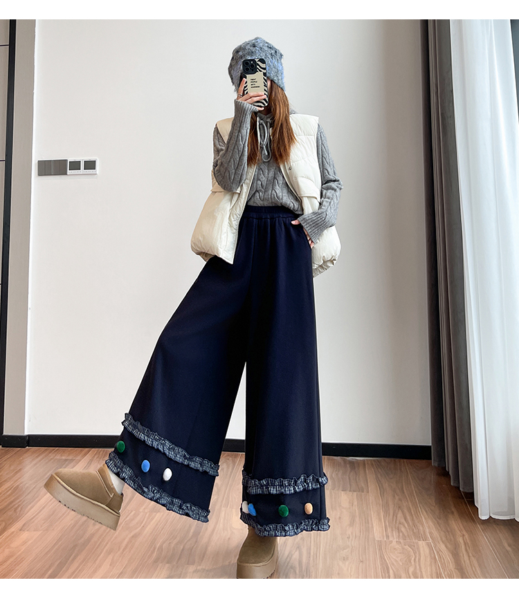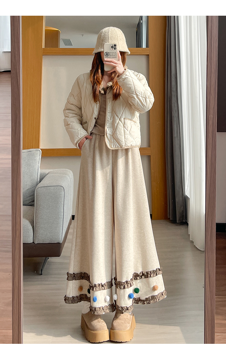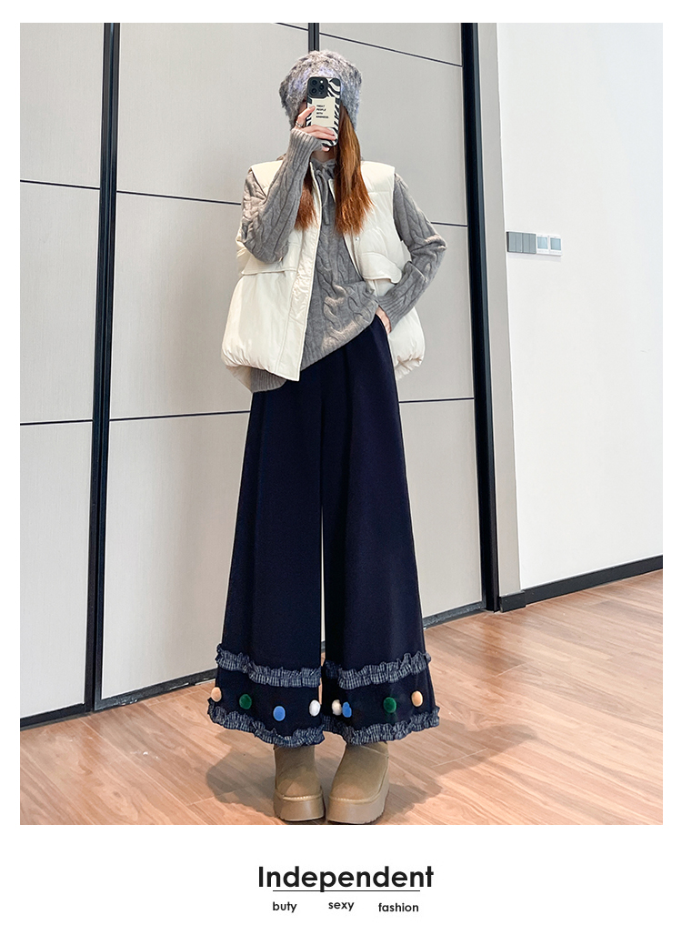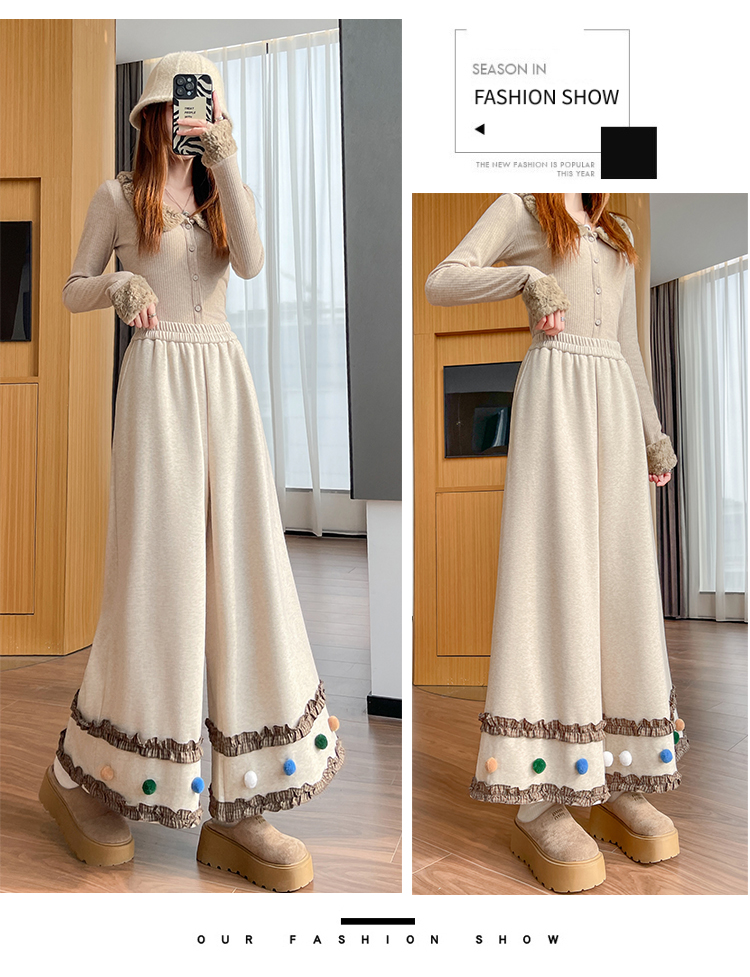MY14932# 新款花边毛球加绒羊绒阔腿裤女高腰直筒小个子休闲裤女裝貨源服裝批發