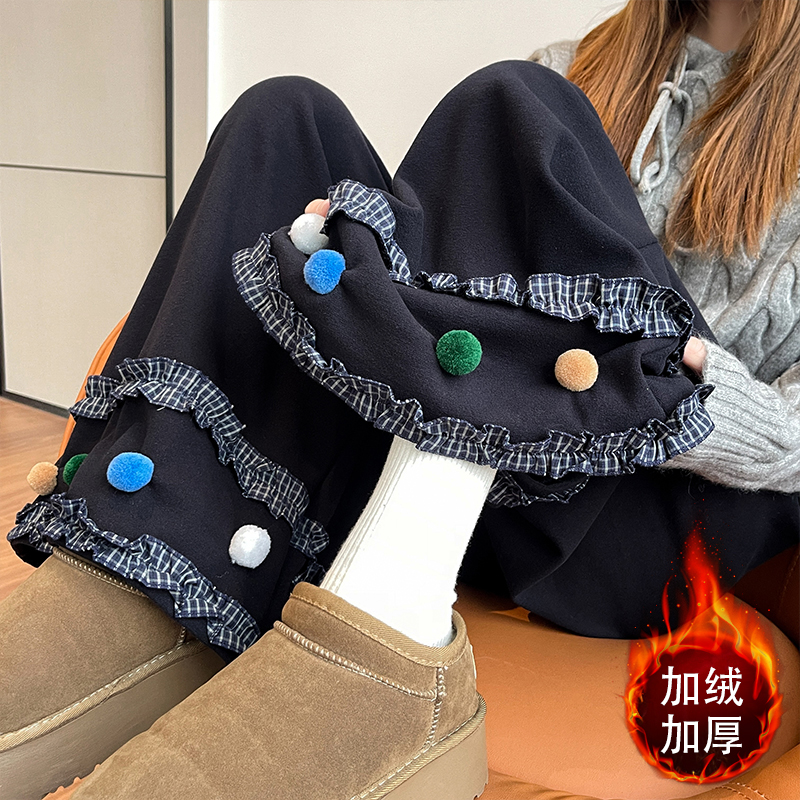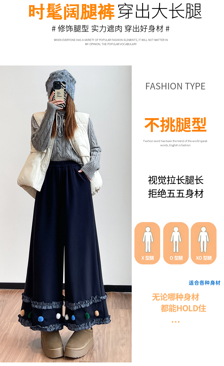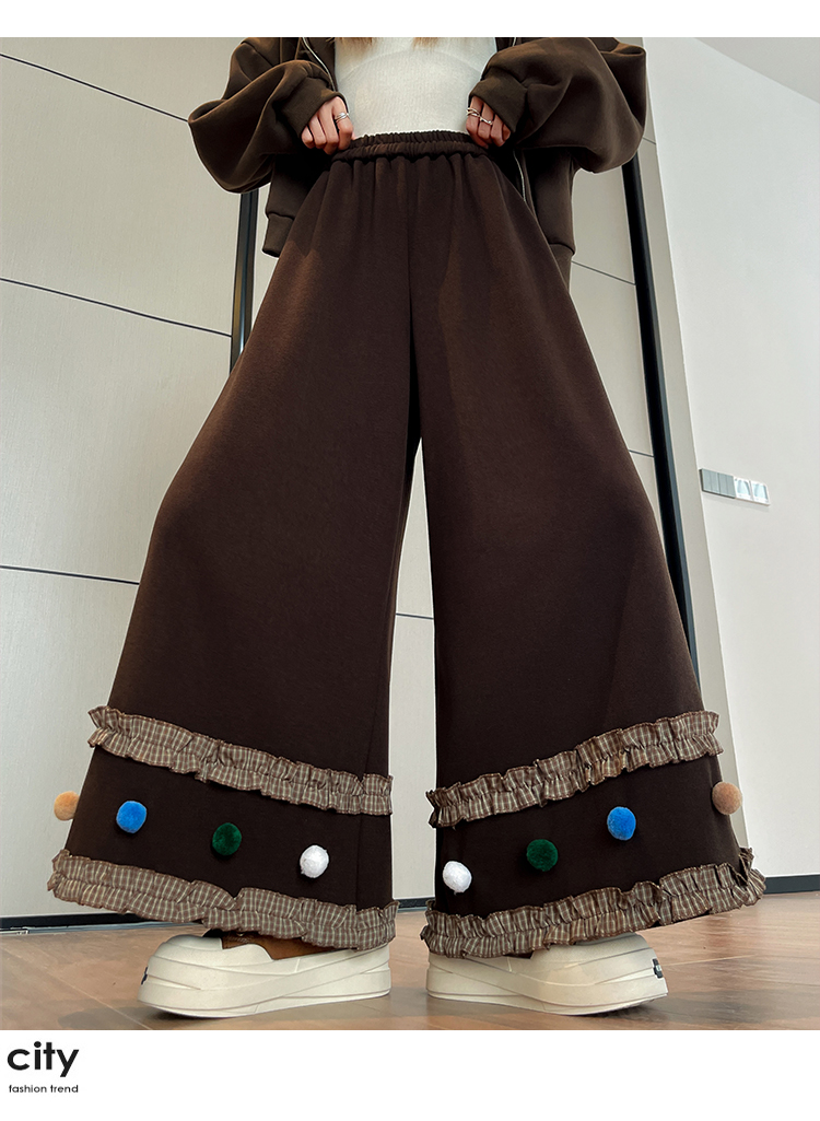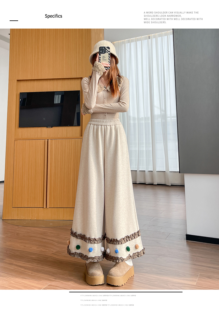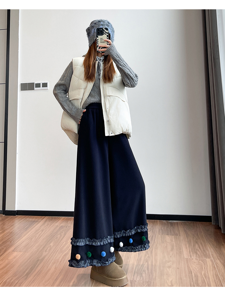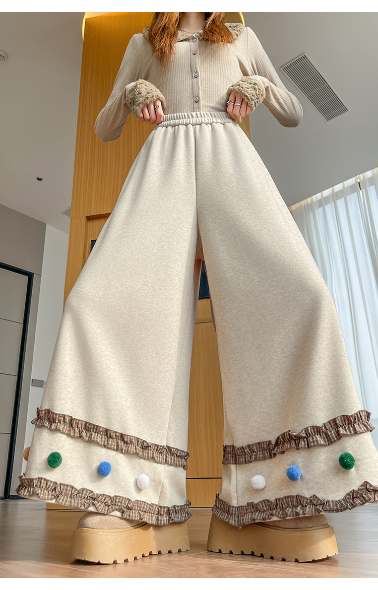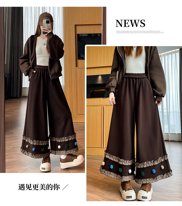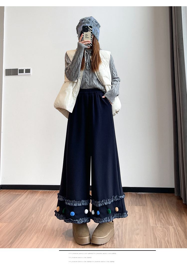 MY14932# 新款花边毛球加绒羊绒阔腿裤女高腰直筒小个子休闲裤女裝貨源服裝批發