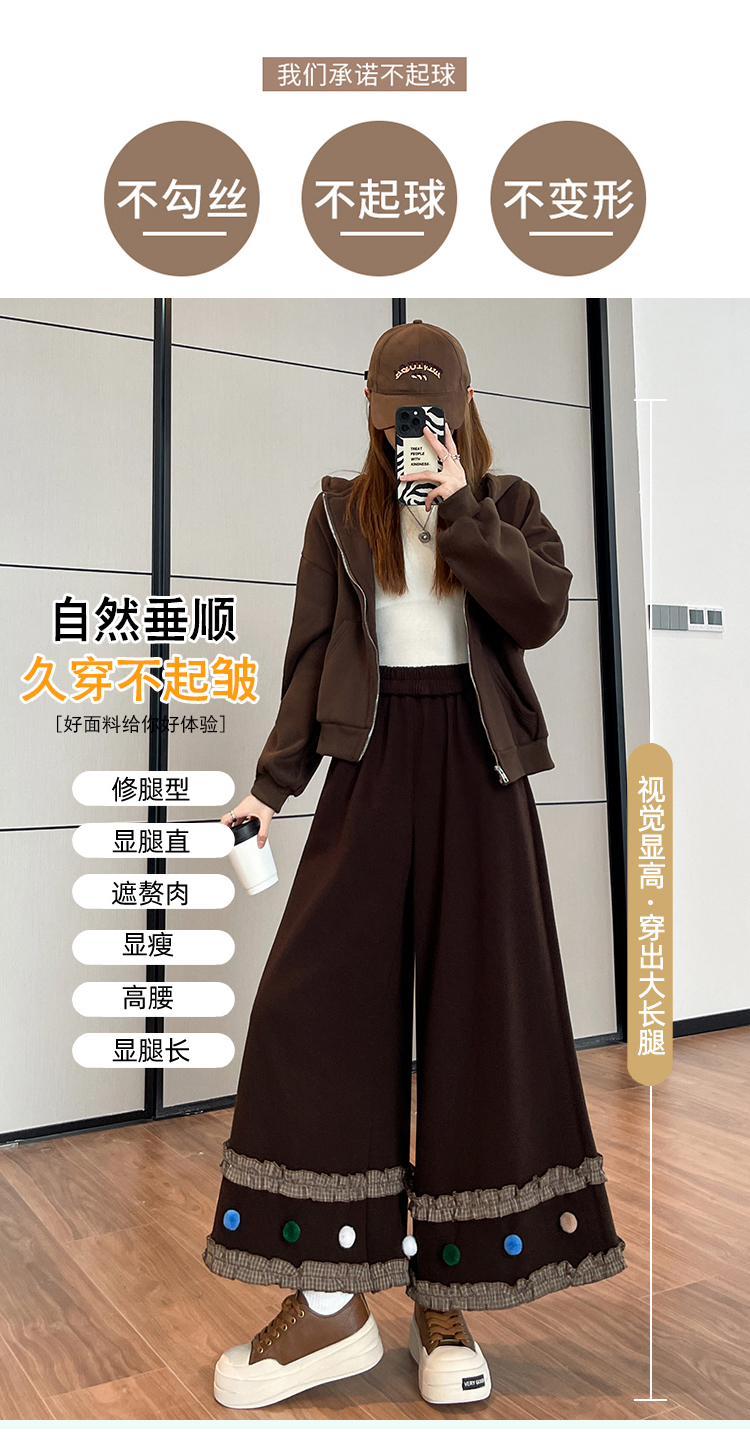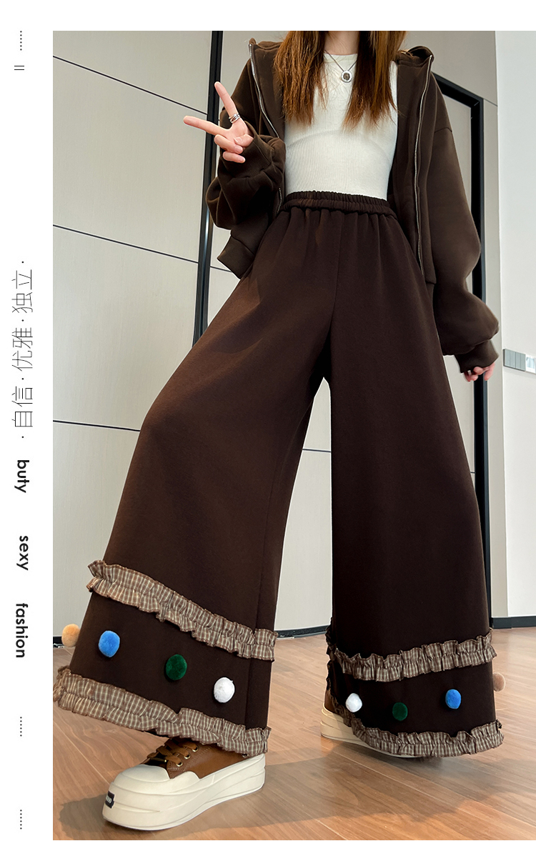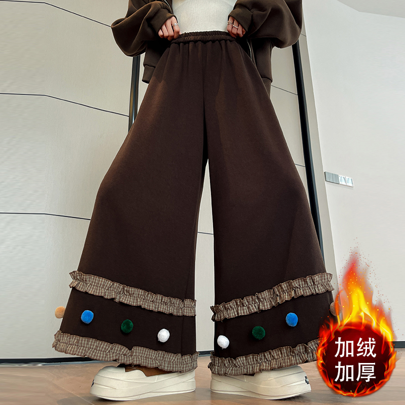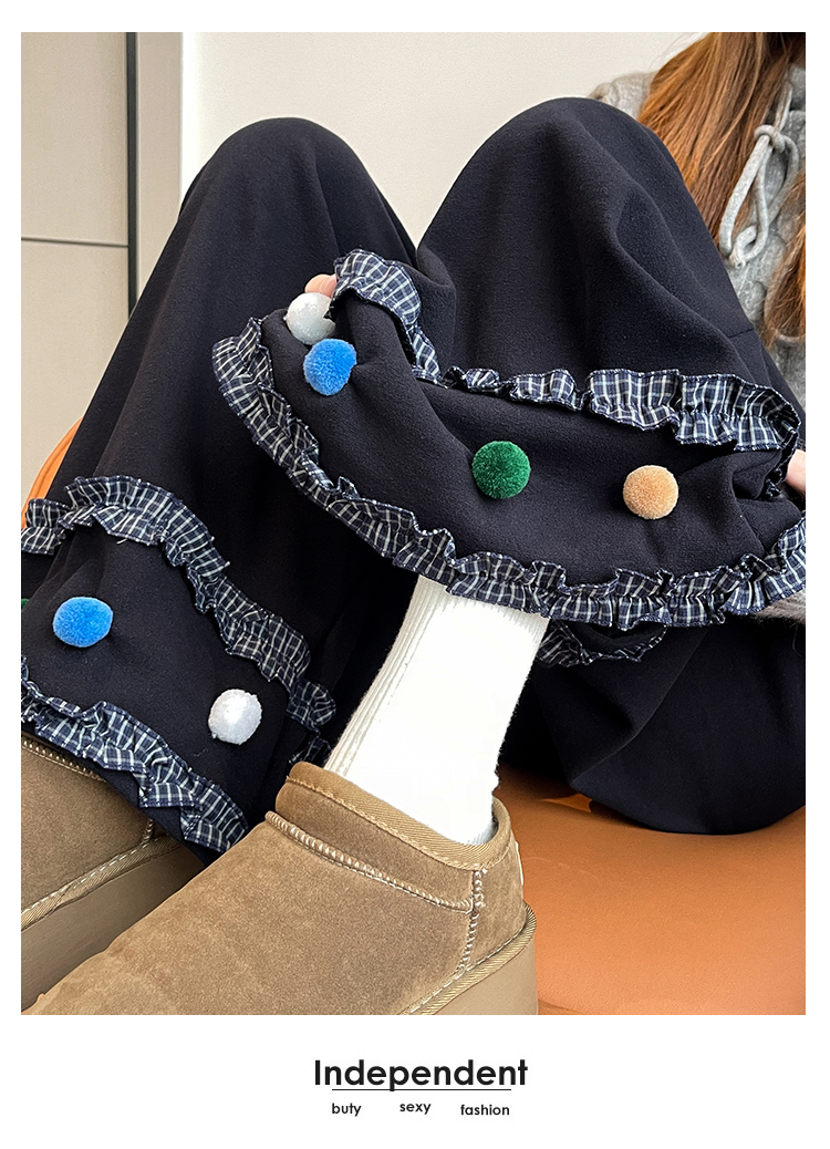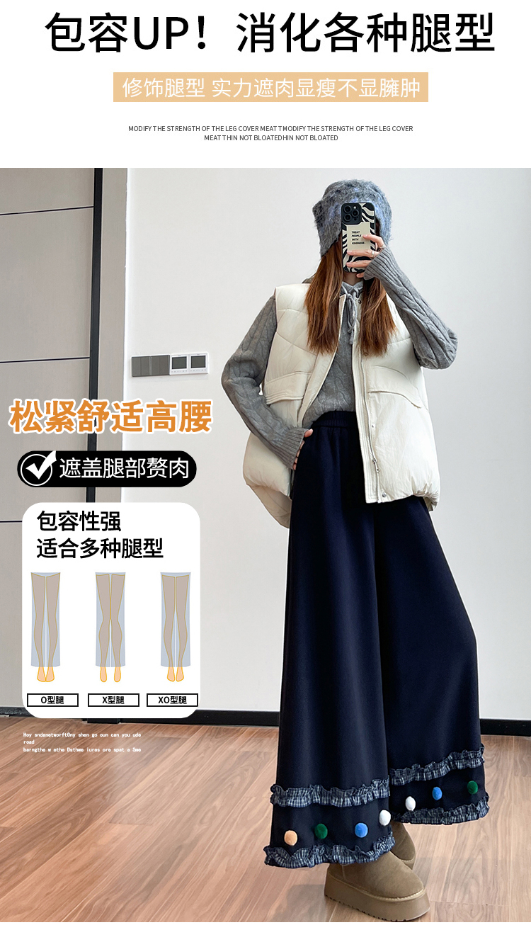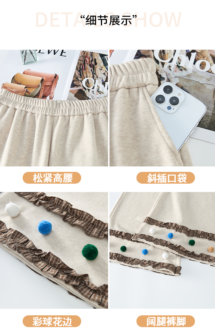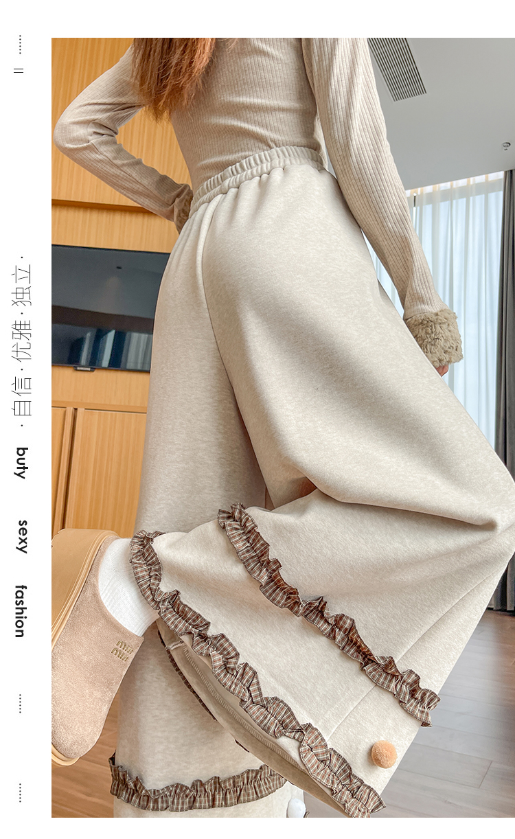 MY14932# 新款花边毛球加绒羊绒阔腿裤女高腰直筒小个子休闲裤女裝貨源服裝批發