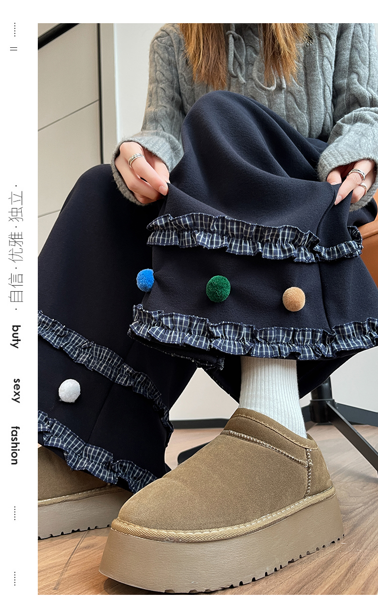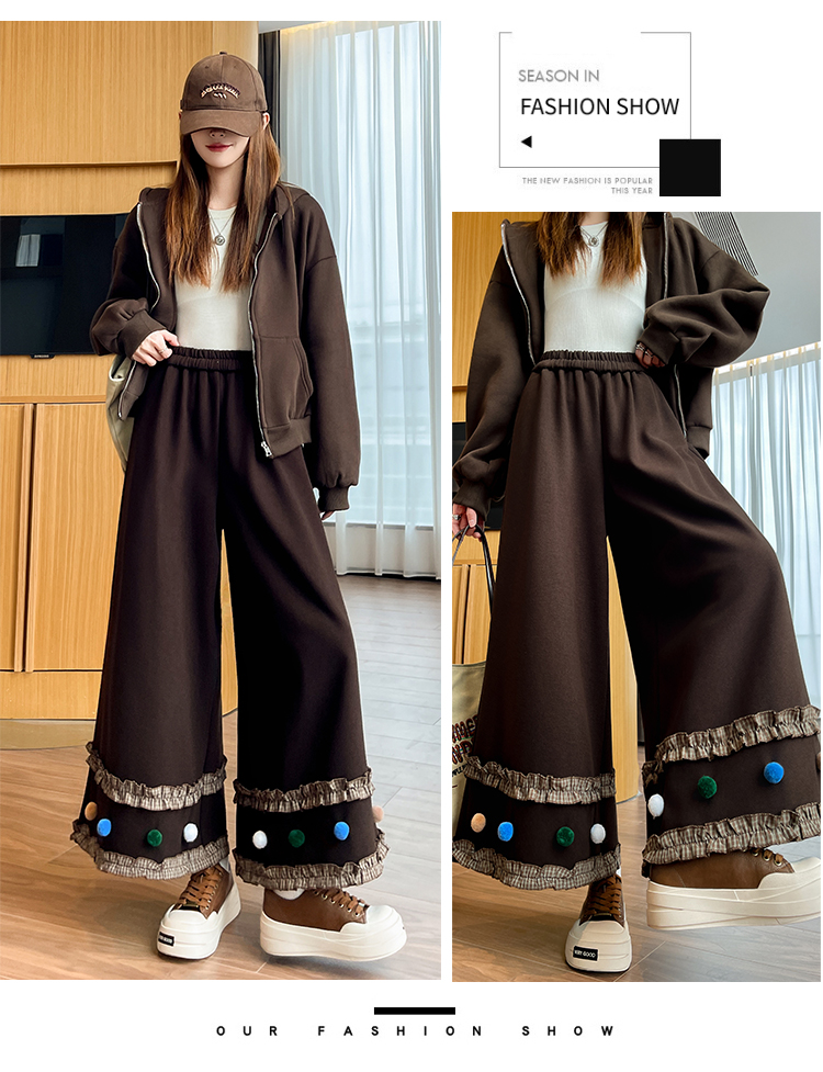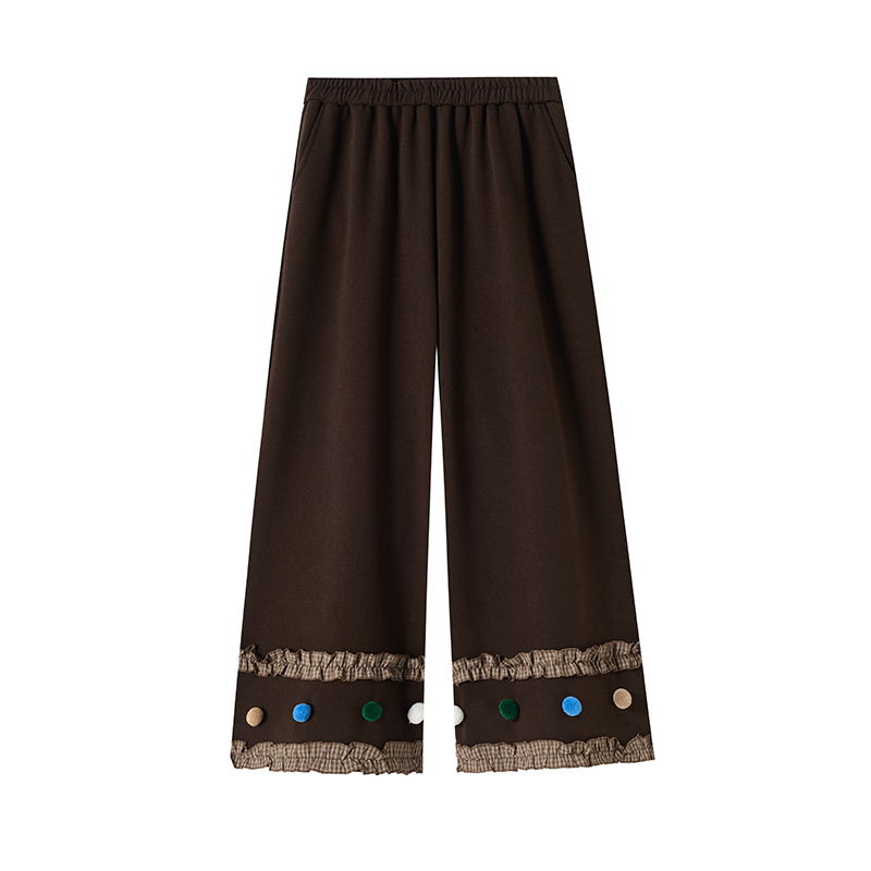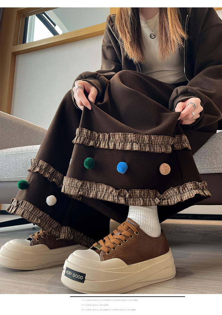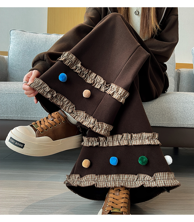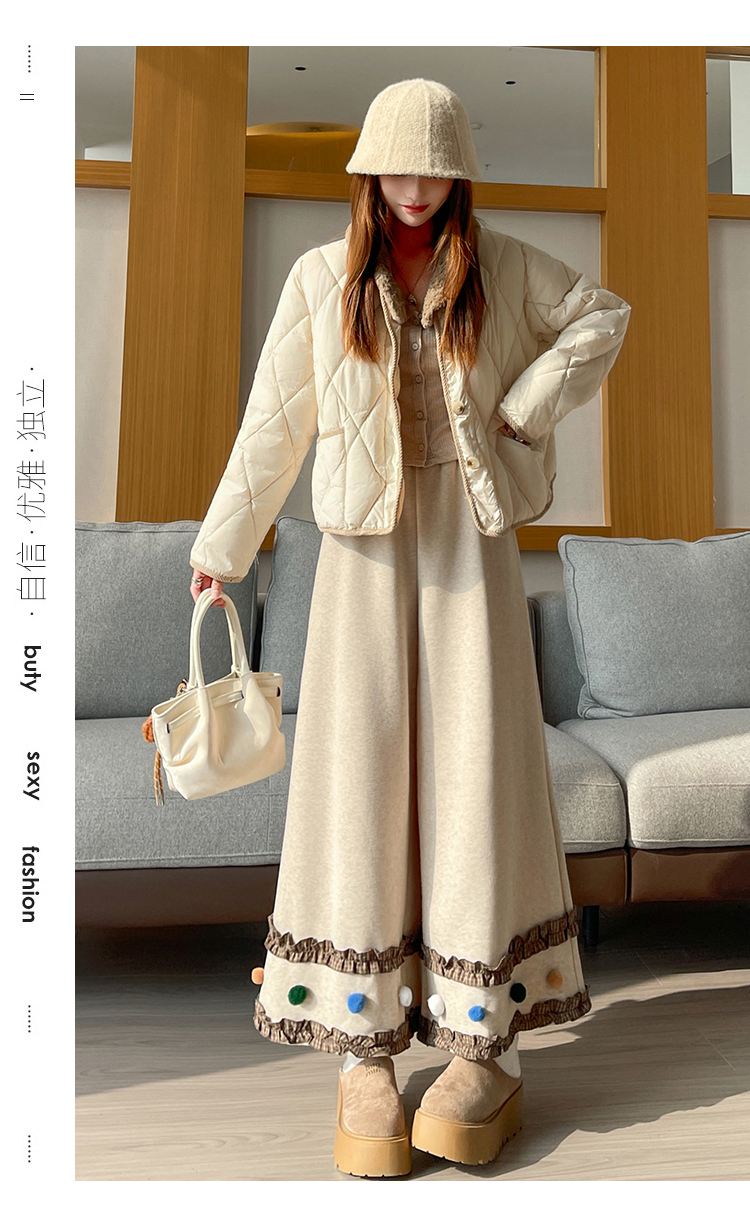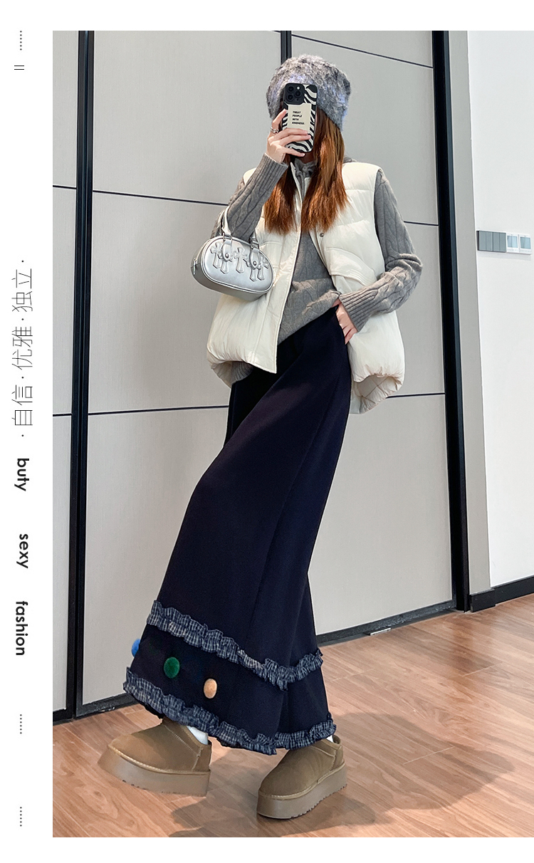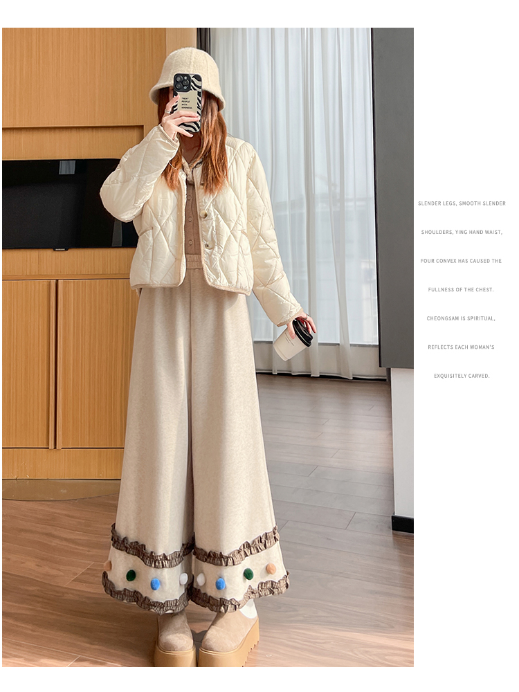 MY14932# 新款花边毛球加绒羊绒阔腿裤女高腰直筒小个子休闲裤女裝貨源服裝批發