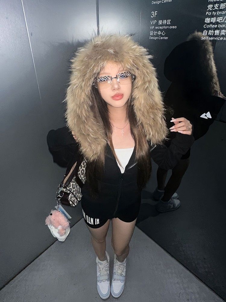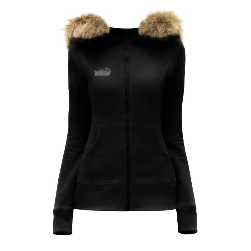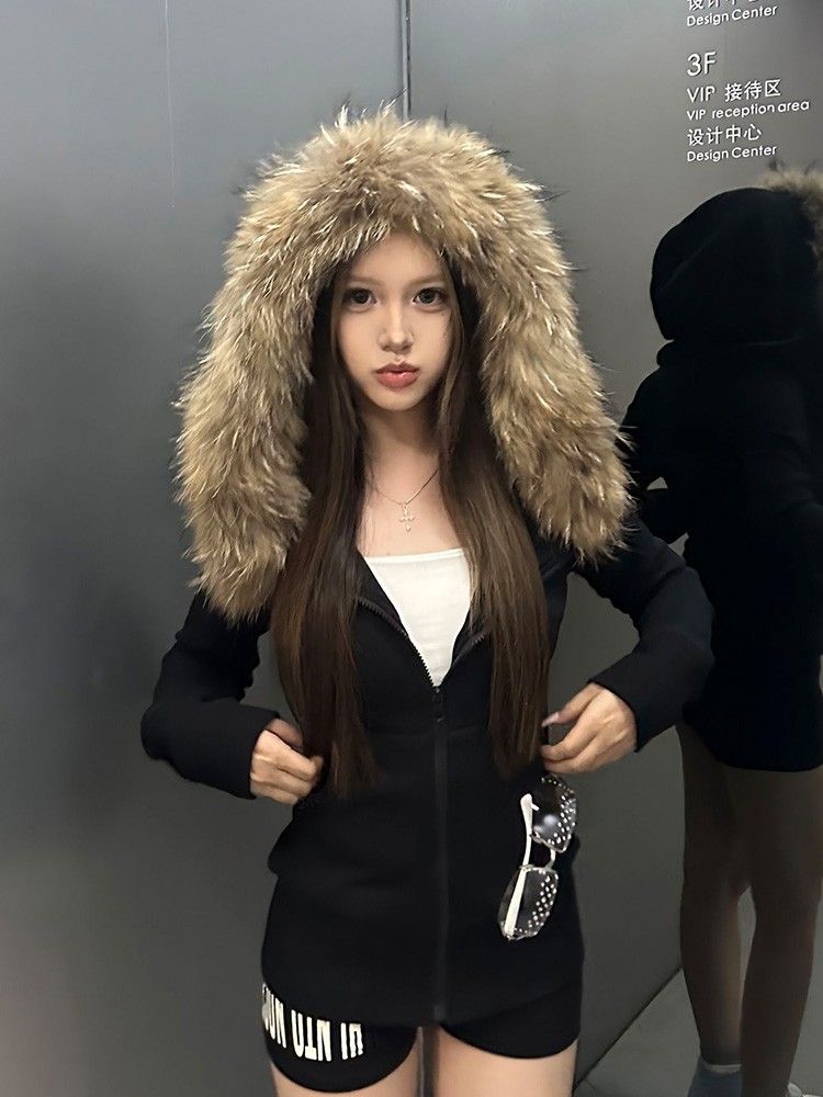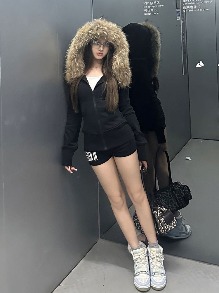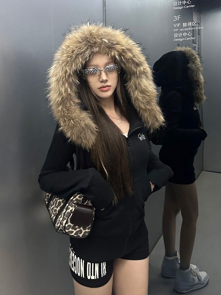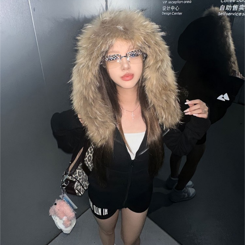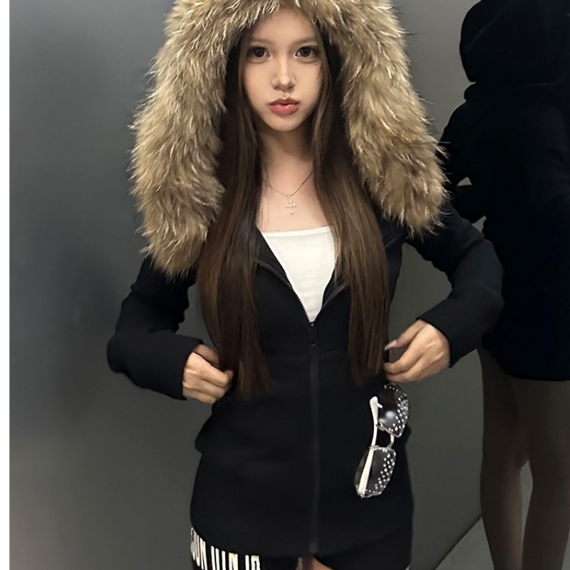 MY14937# 固定毛领连帽收腰加绒卫衣新款开衫拉链外套修身上衣女裝貨源服裝批發