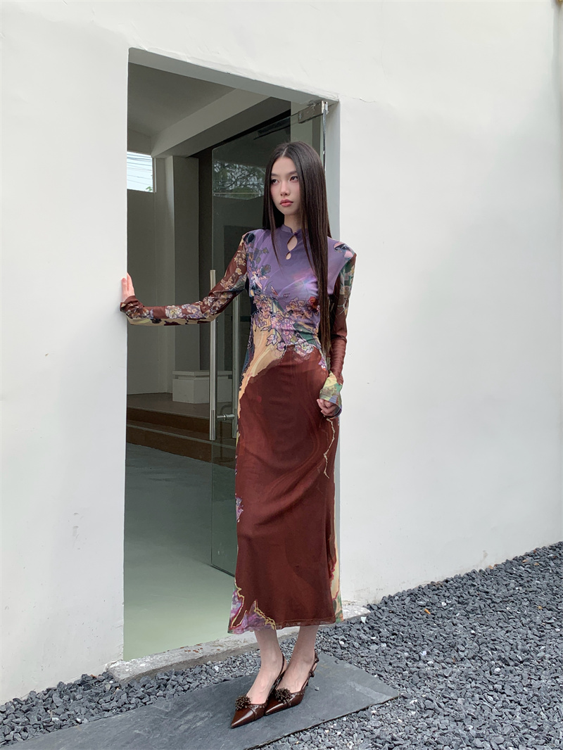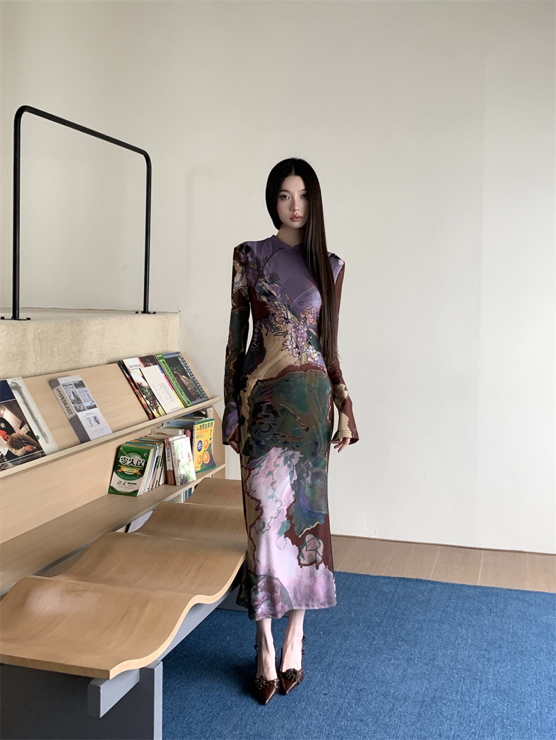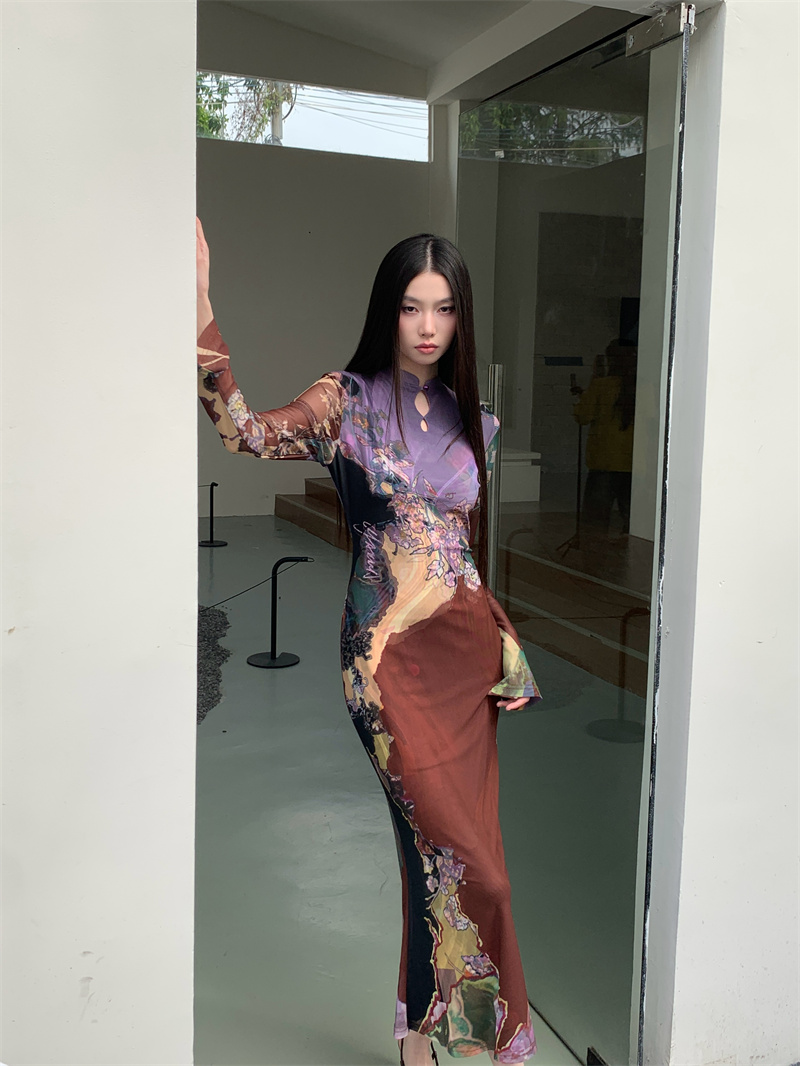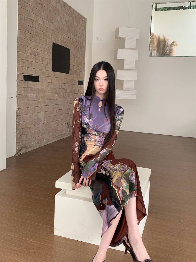 MY14940# 新中式撞色印花旗袍连衣裙女裝貨源服裝批發