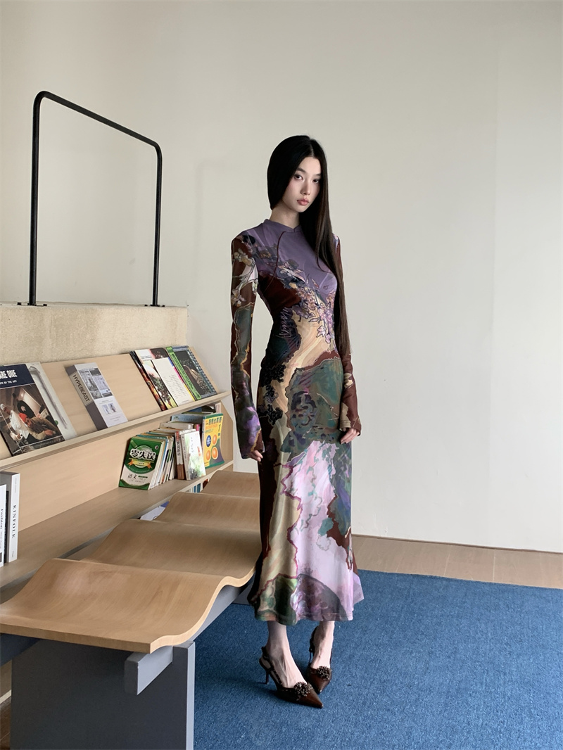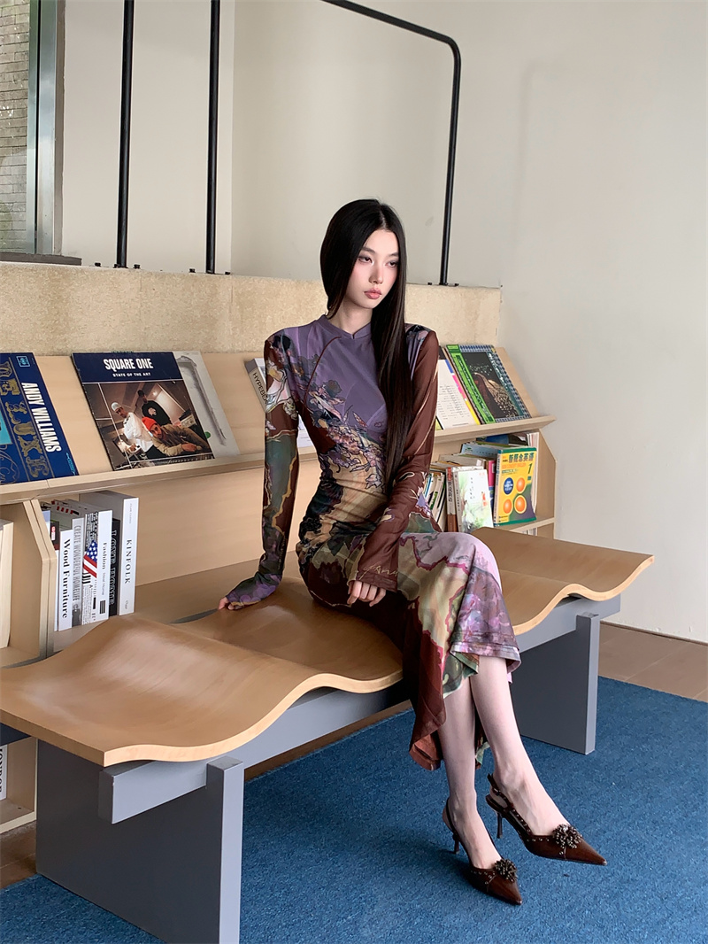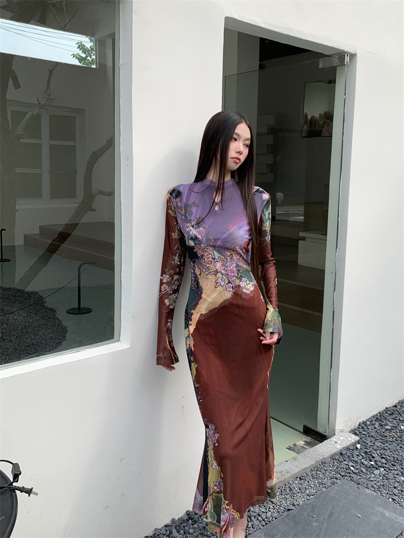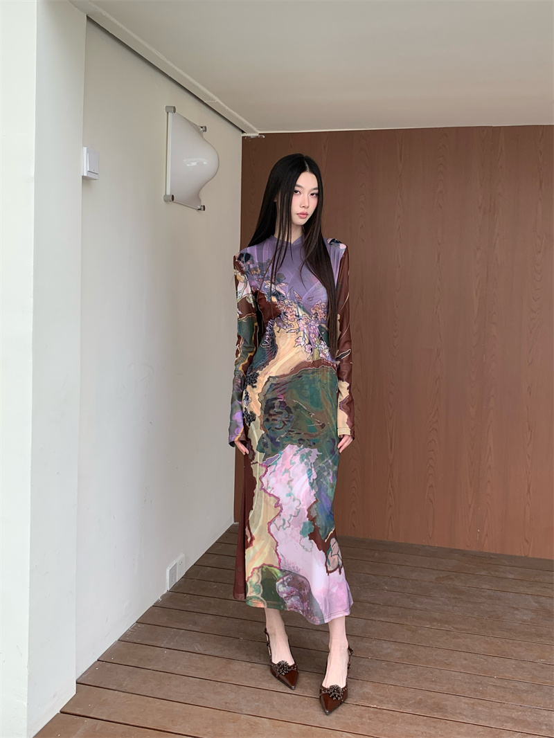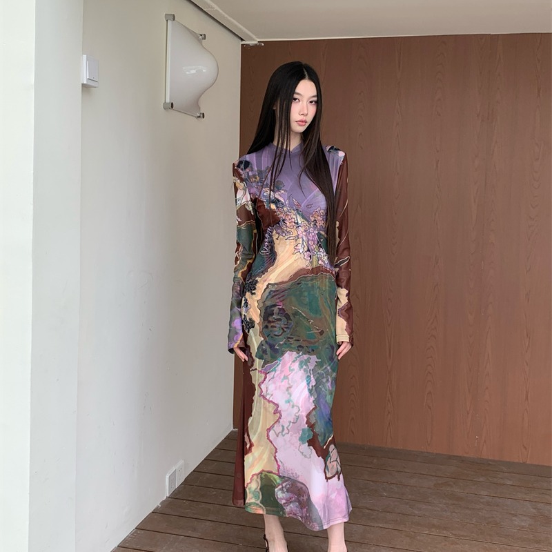MY14940# 新中式撞色印花旗袍连衣裙女裝貨源服裝批發