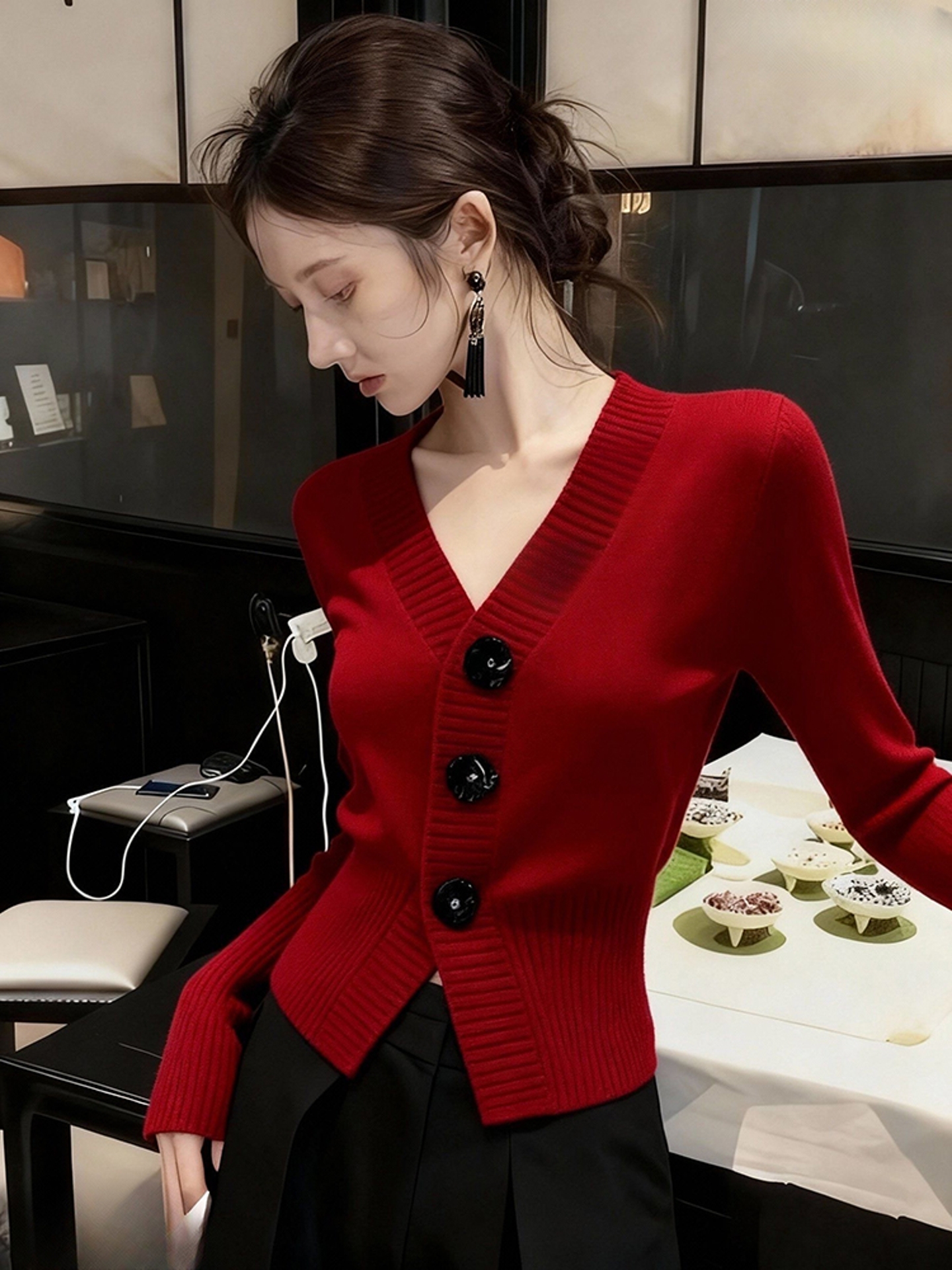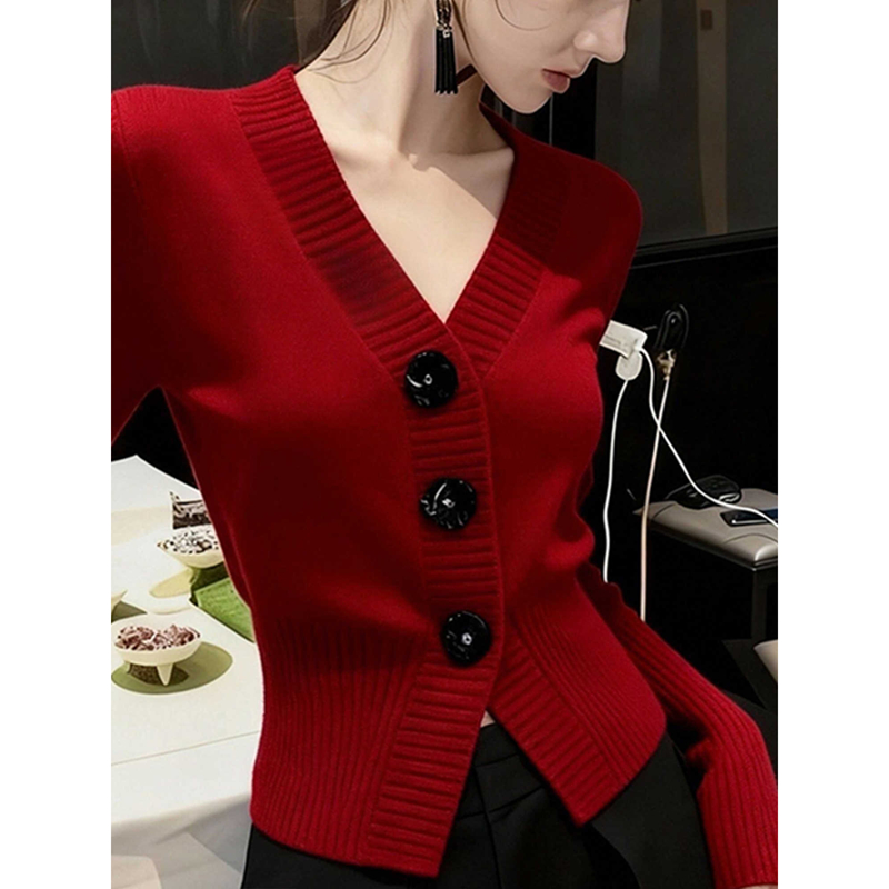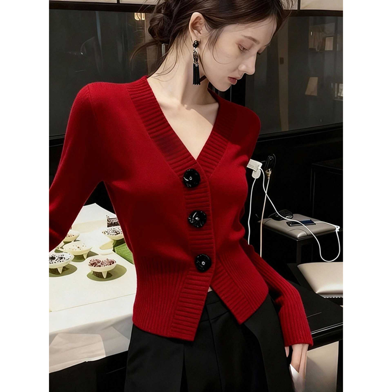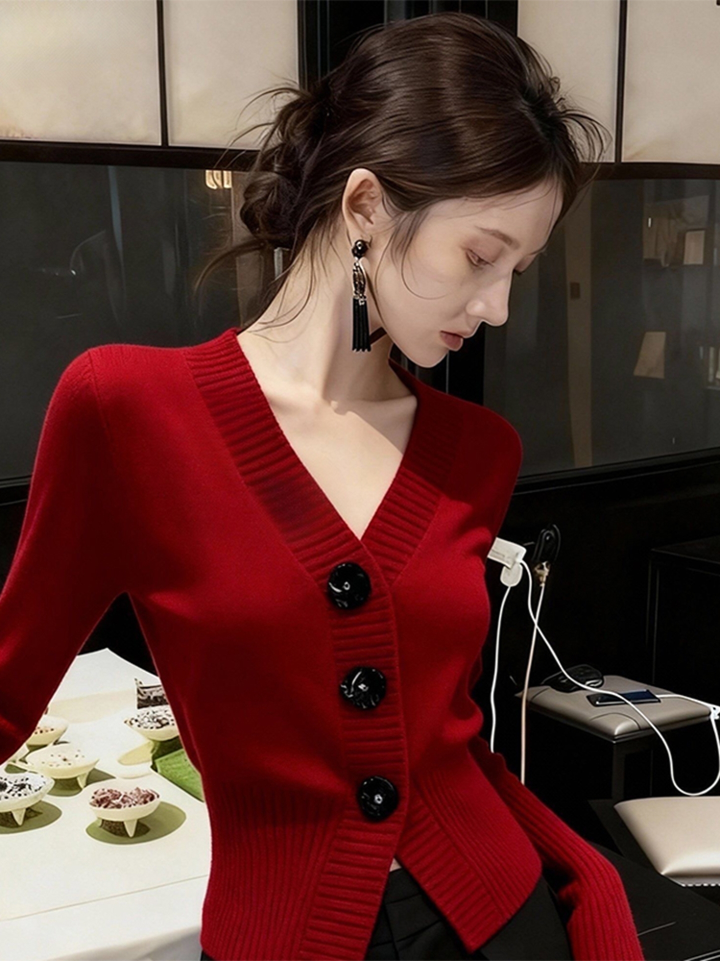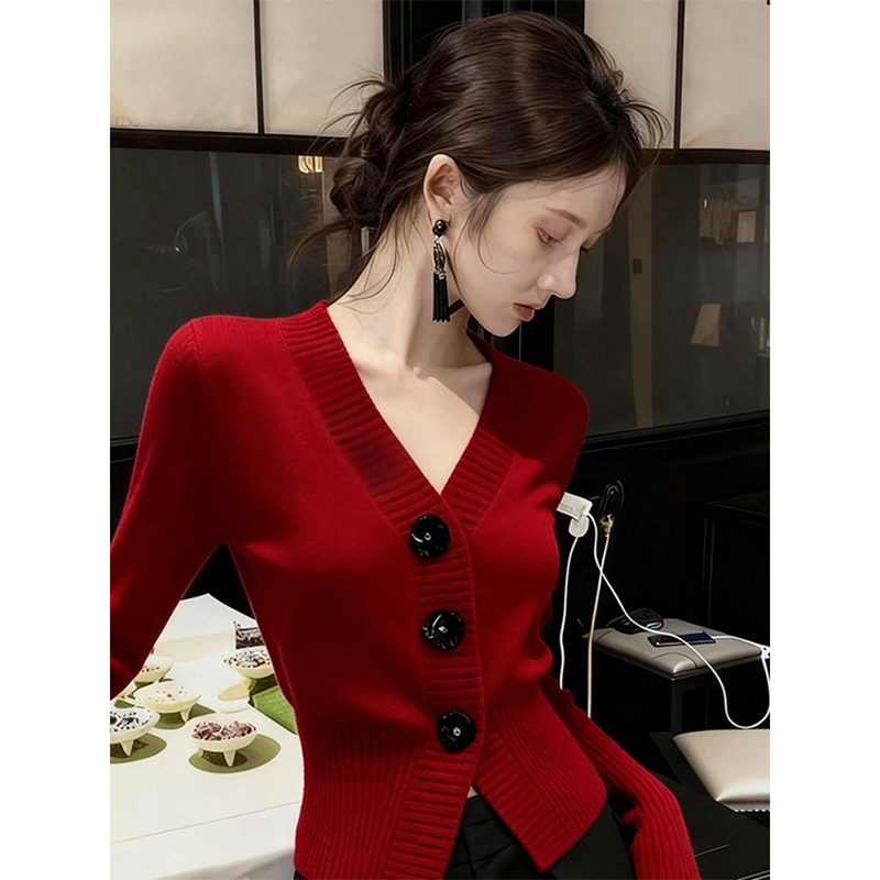 MY14952# 红色V领短款收腰针织上衣新款早秋法式高级感外穿长袖开衫女裝貨源服裝批發