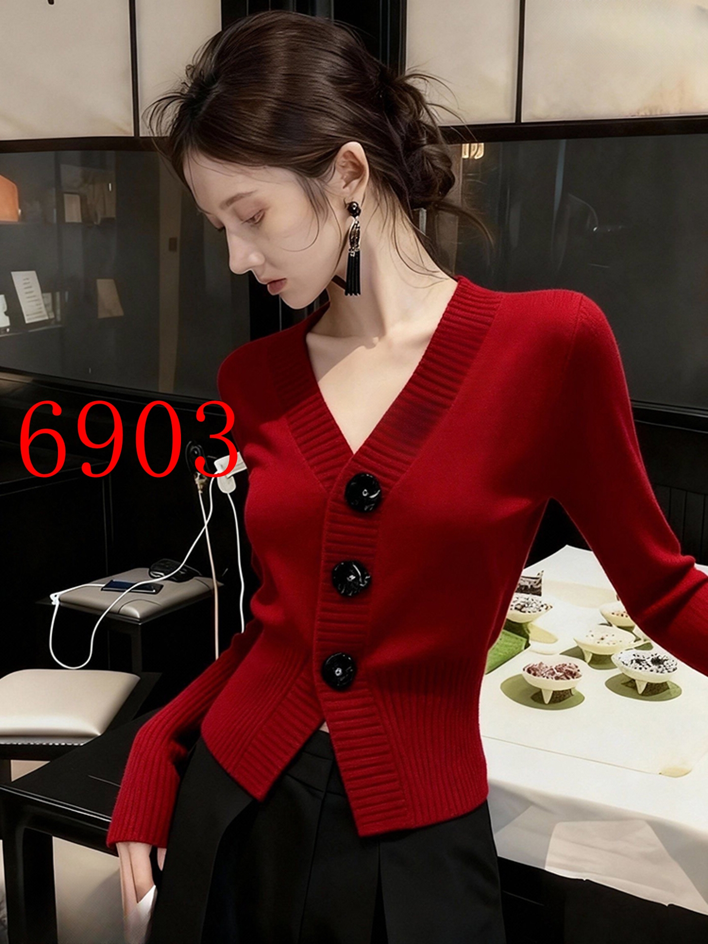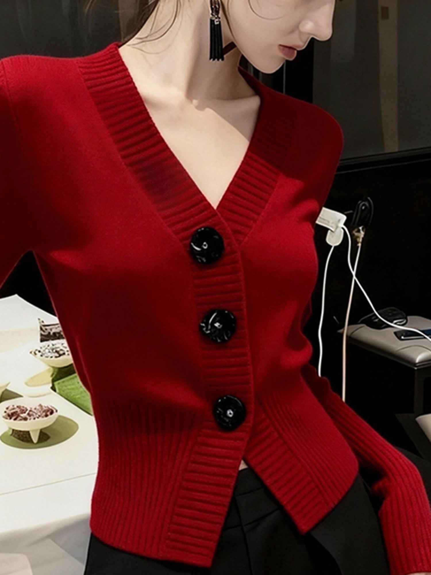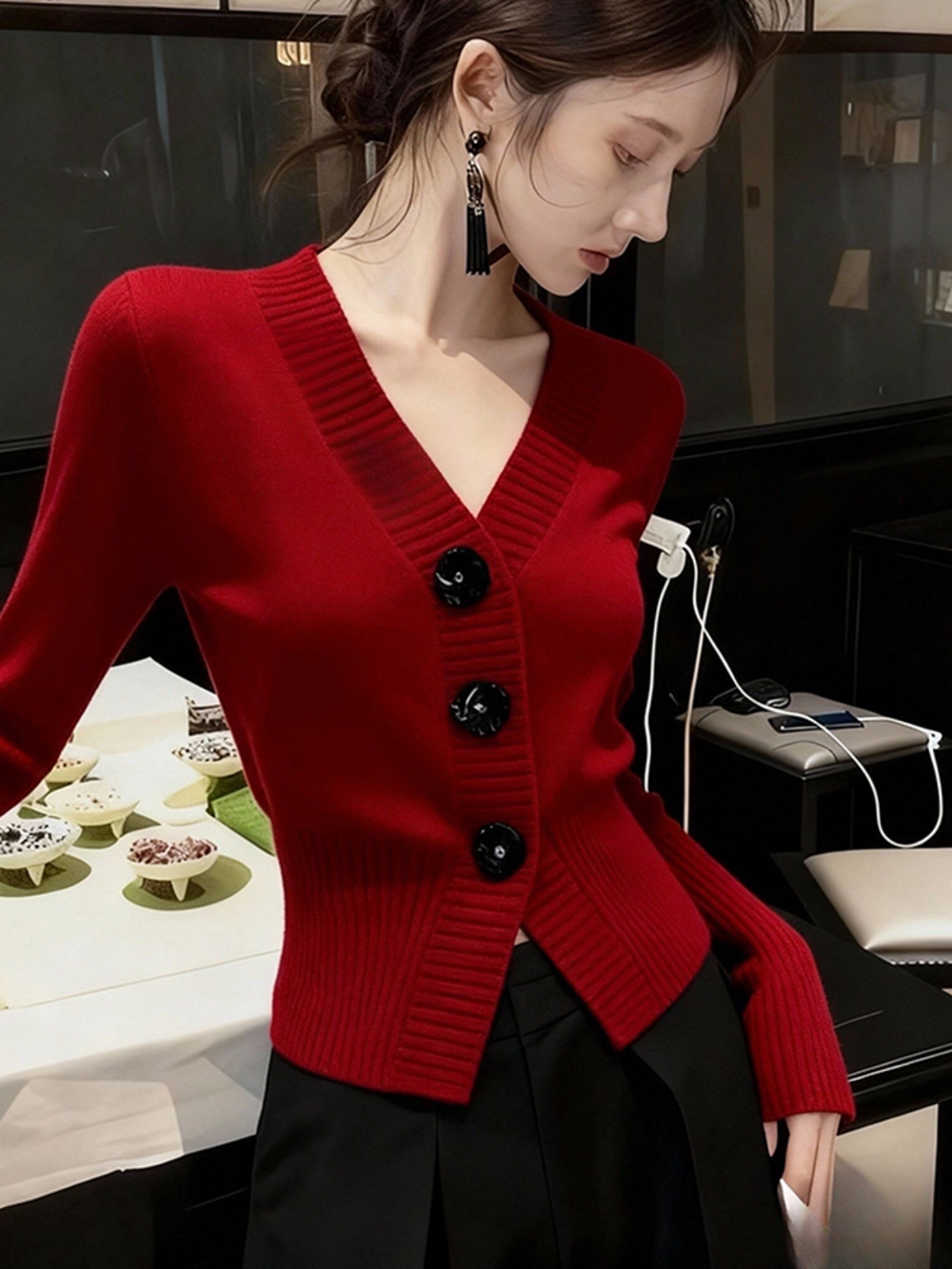 MY14952# 红色V领短款收腰针织上衣新款早秋法式高级感外穿长袖开衫女裝貨源服裝批發
