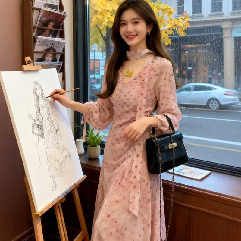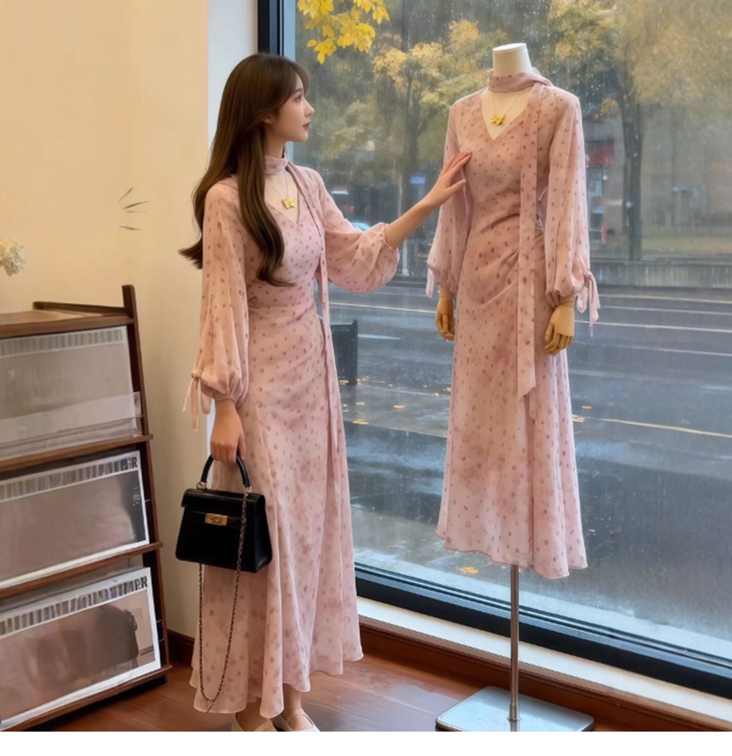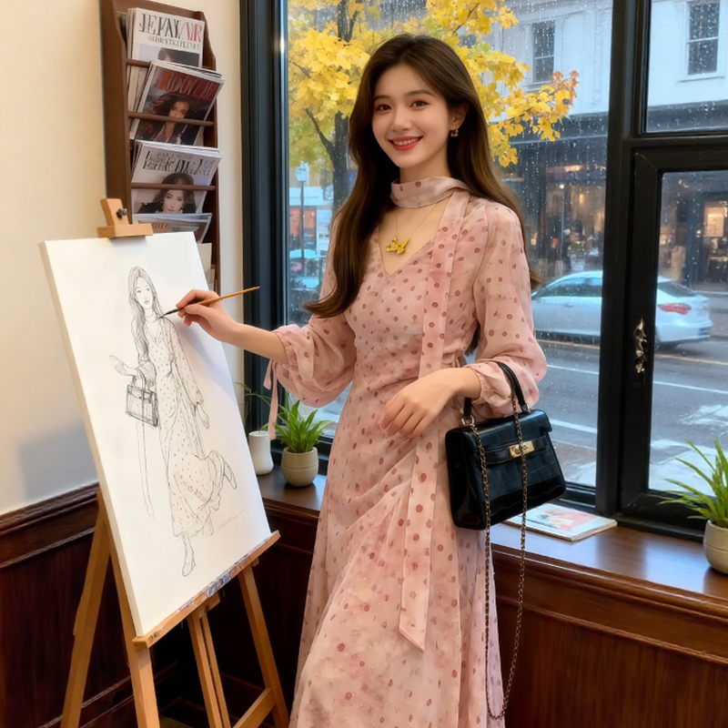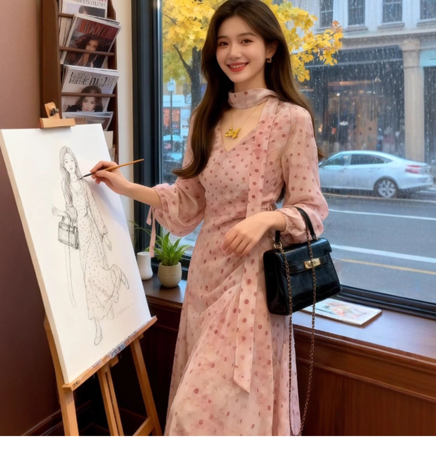 MY14953# 法式温柔粉色波点V领长袖连衣裙高级感收腰显瘦打底长裙子女裝貨源服裝批發