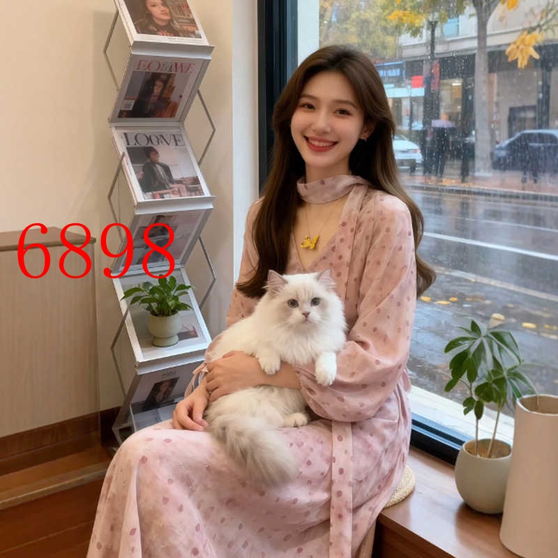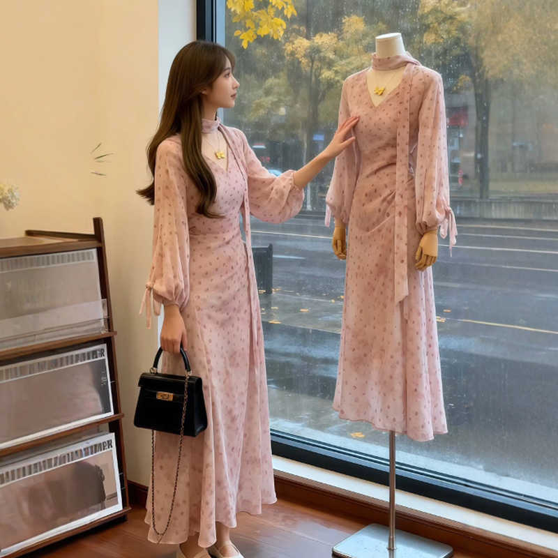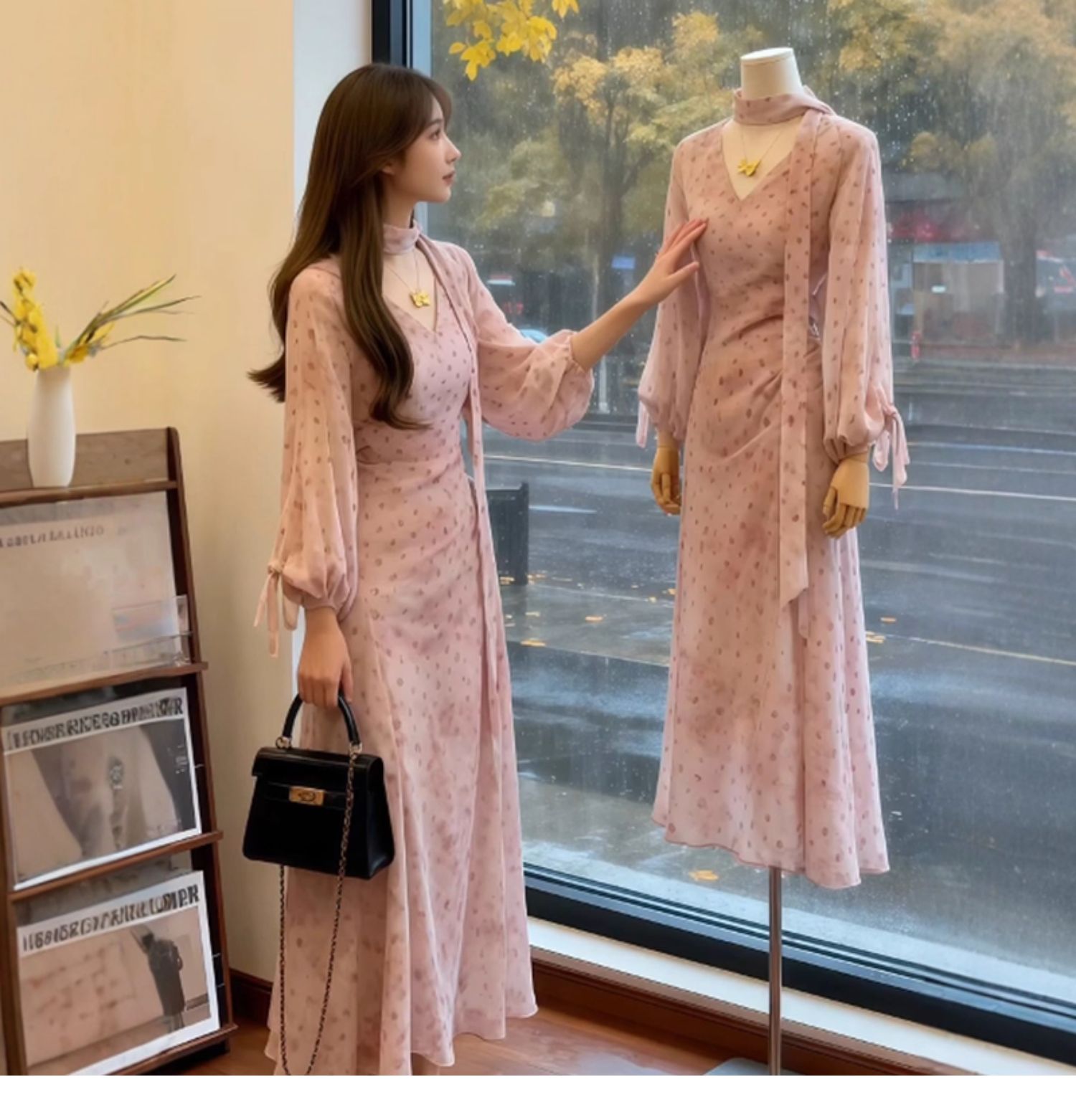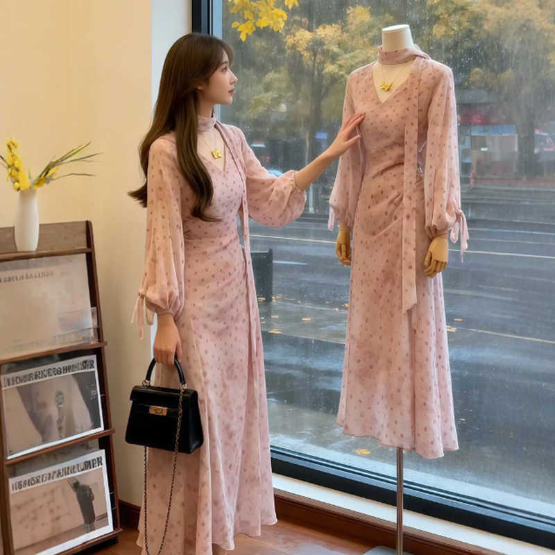 MY14953# 法式温柔粉色波点V领长袖连衣裙高级感收腰显瘦打底长裙子女裝貨源服裝批發