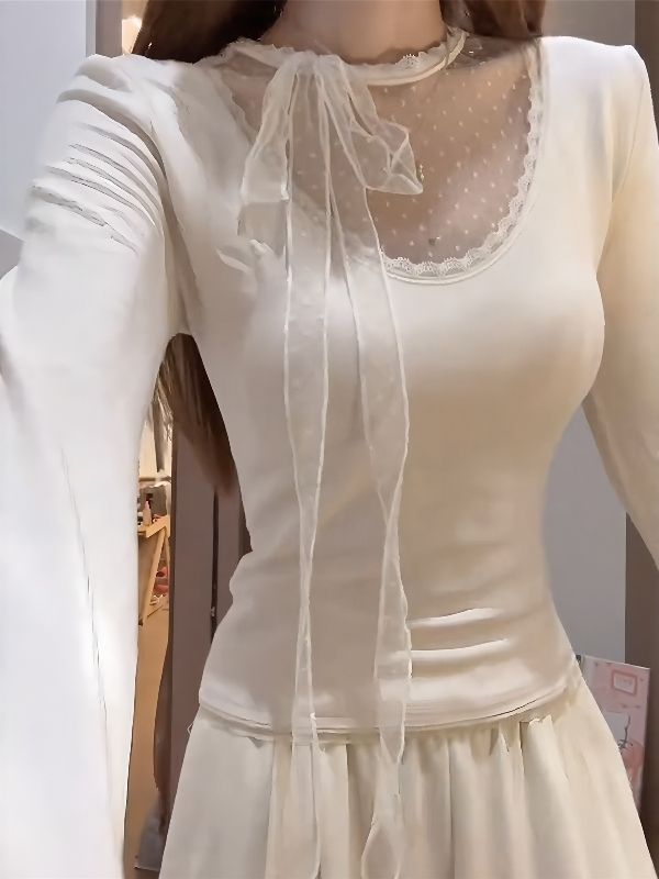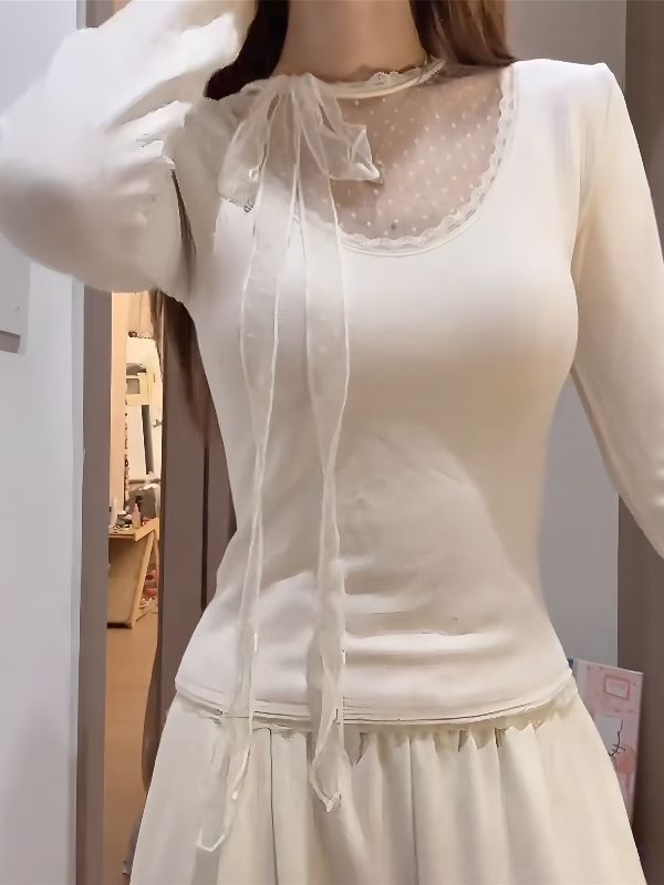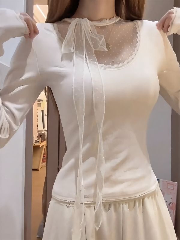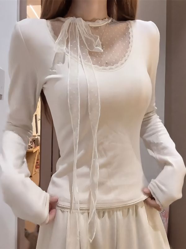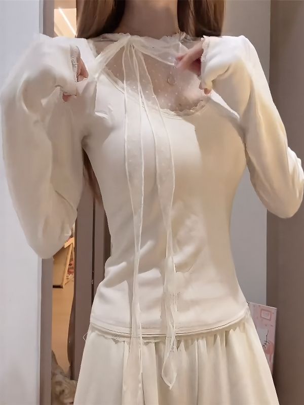MY14963# 纯欲风蕾丝拼接系带长袖冬季新款修身显瘦内搭打底衫上衣女裝貨源服裝批發