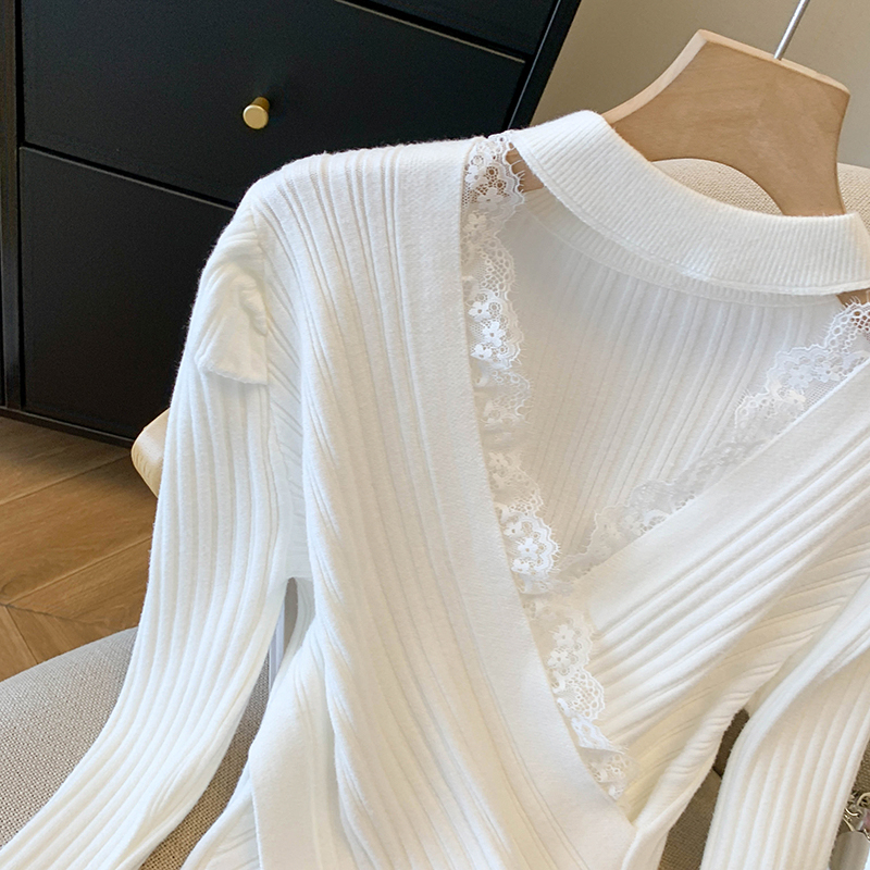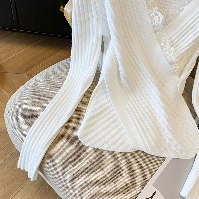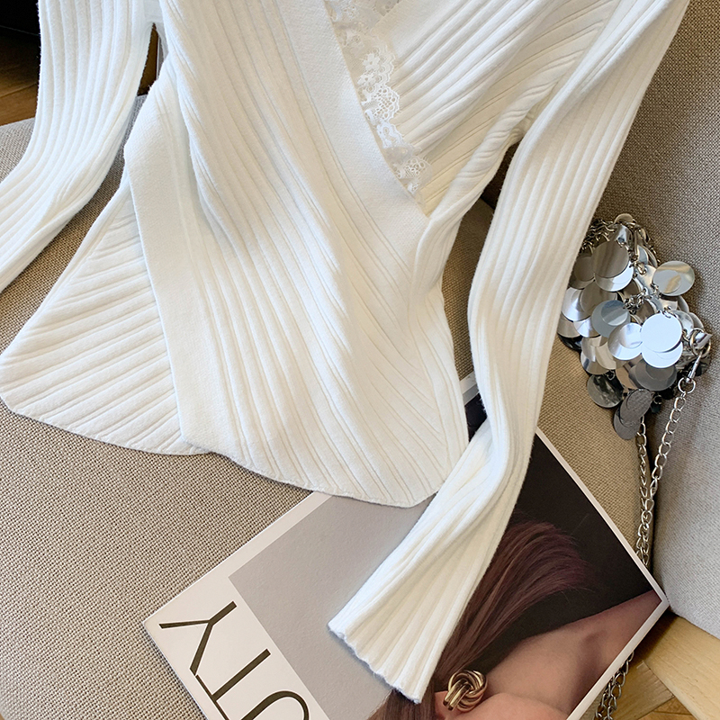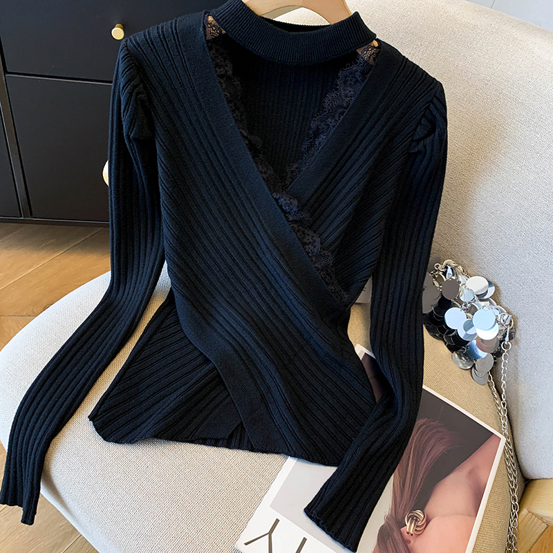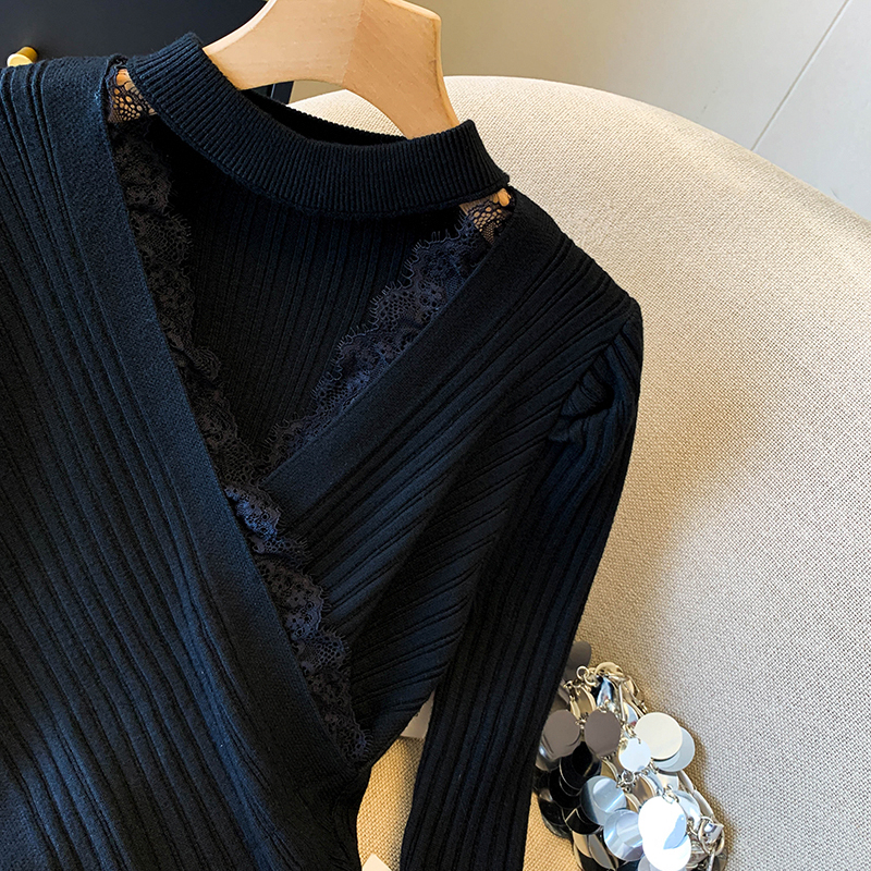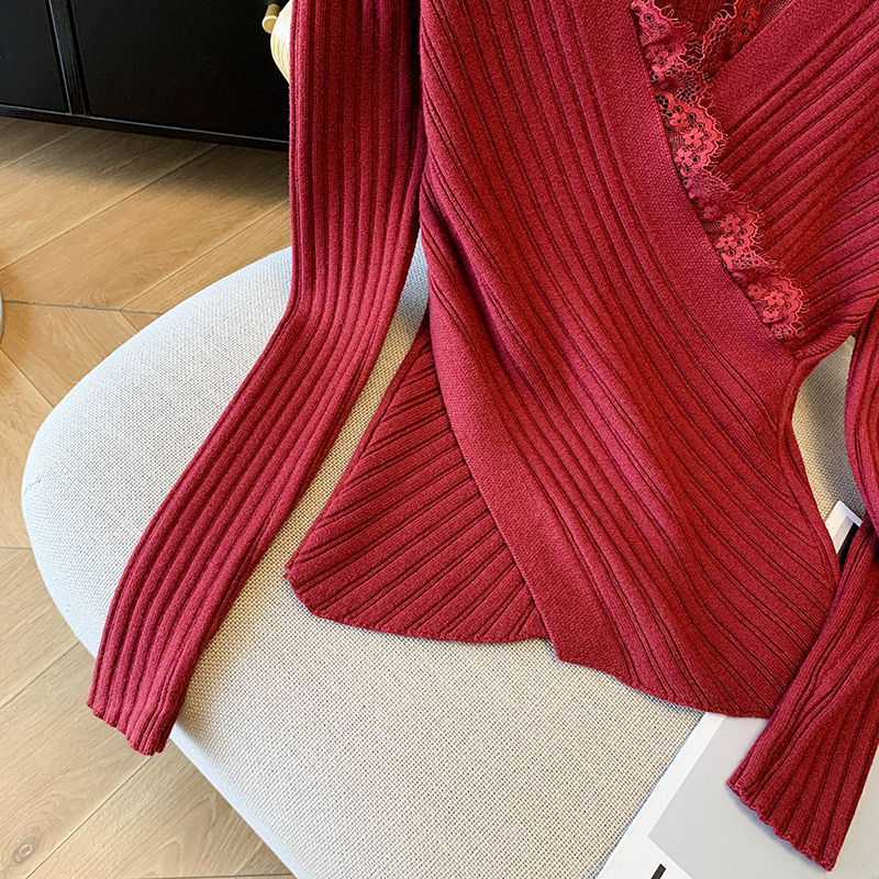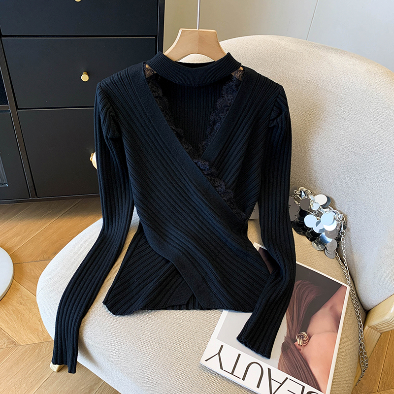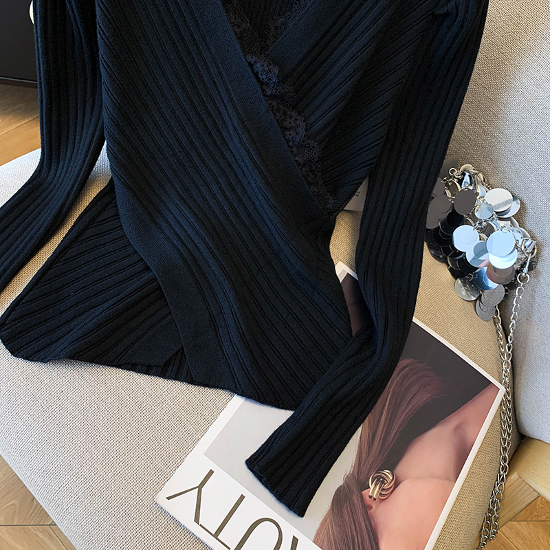 MY15097# 新款蕾丝拼接针织上衣女内搭不规则交叉收腰打底衫女女裝貨源服裝批發