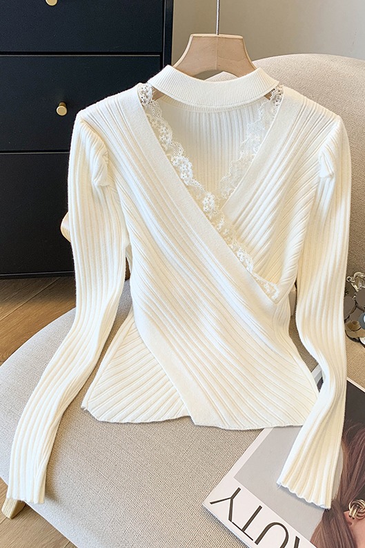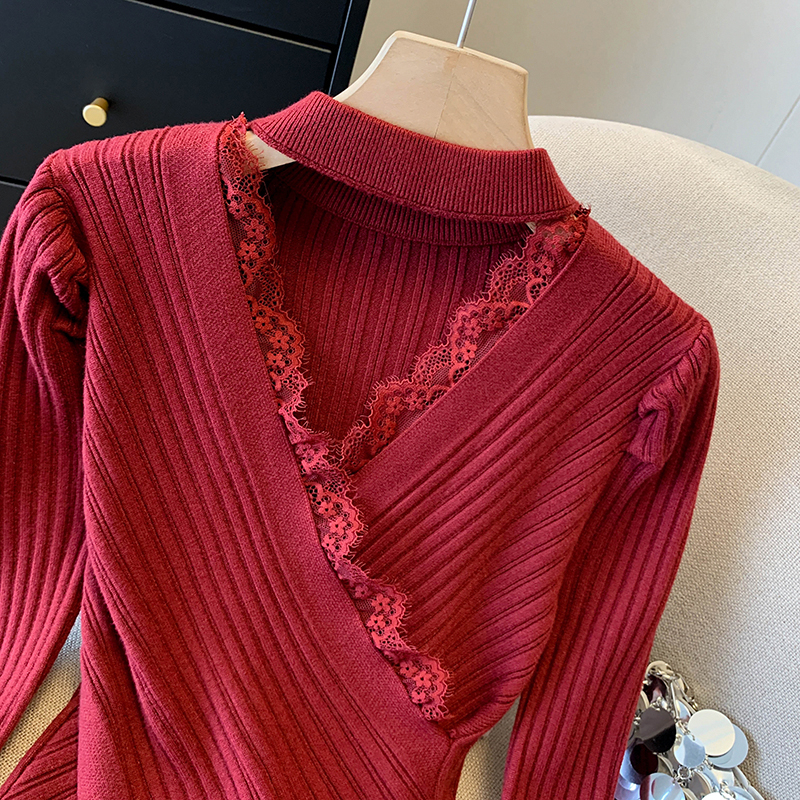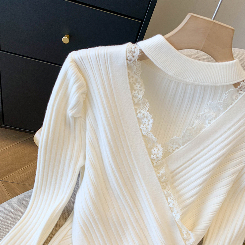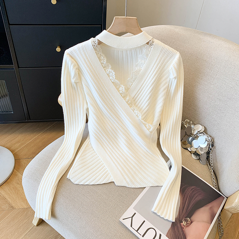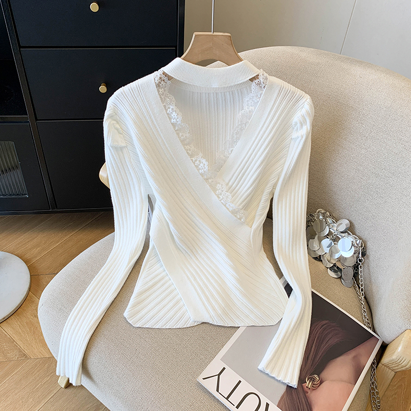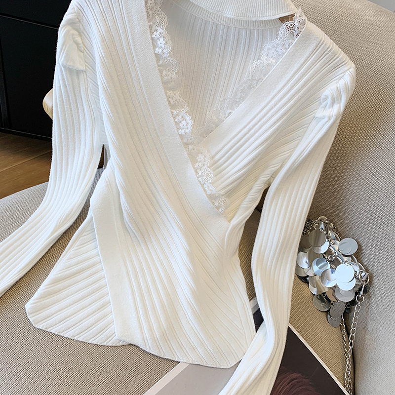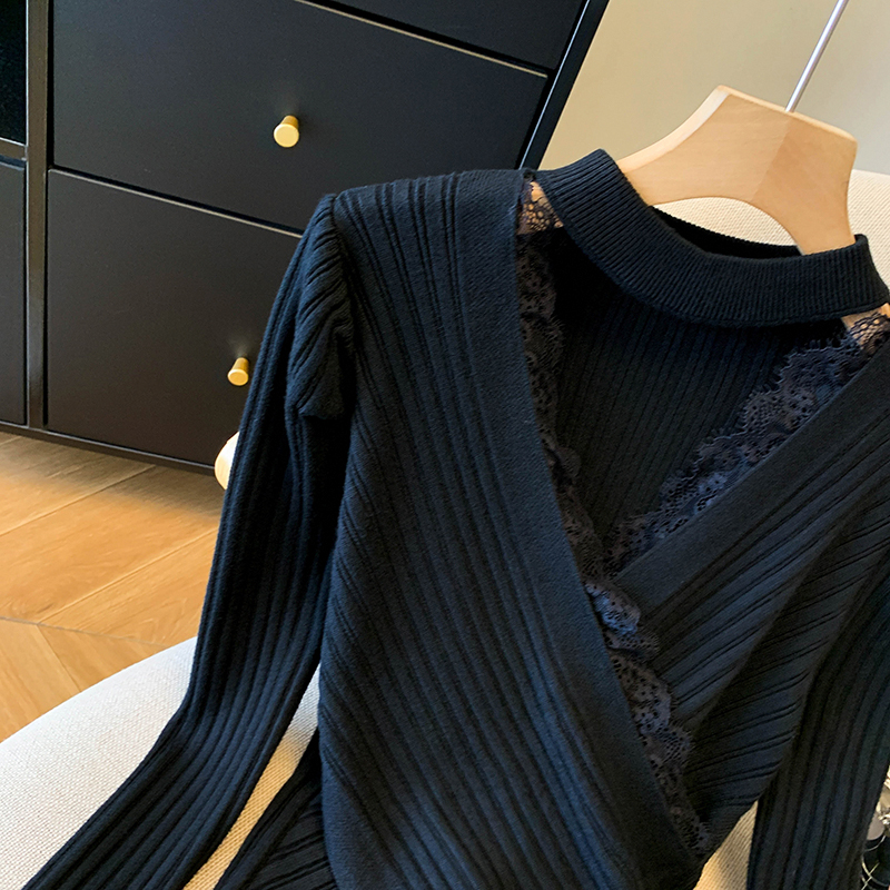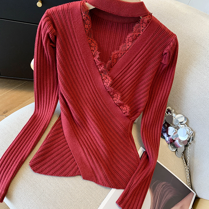 MY15097# 新款蕾丝拼接针织上衣女内搭不规则交叉收腰打底衫女女裝貨源服裝批發
