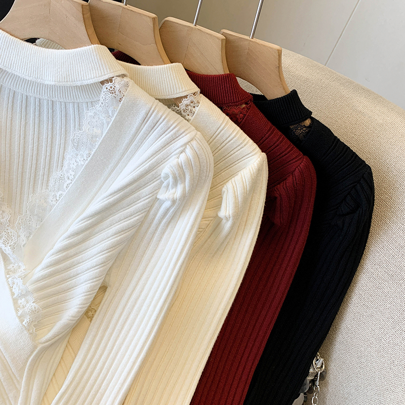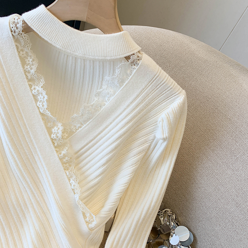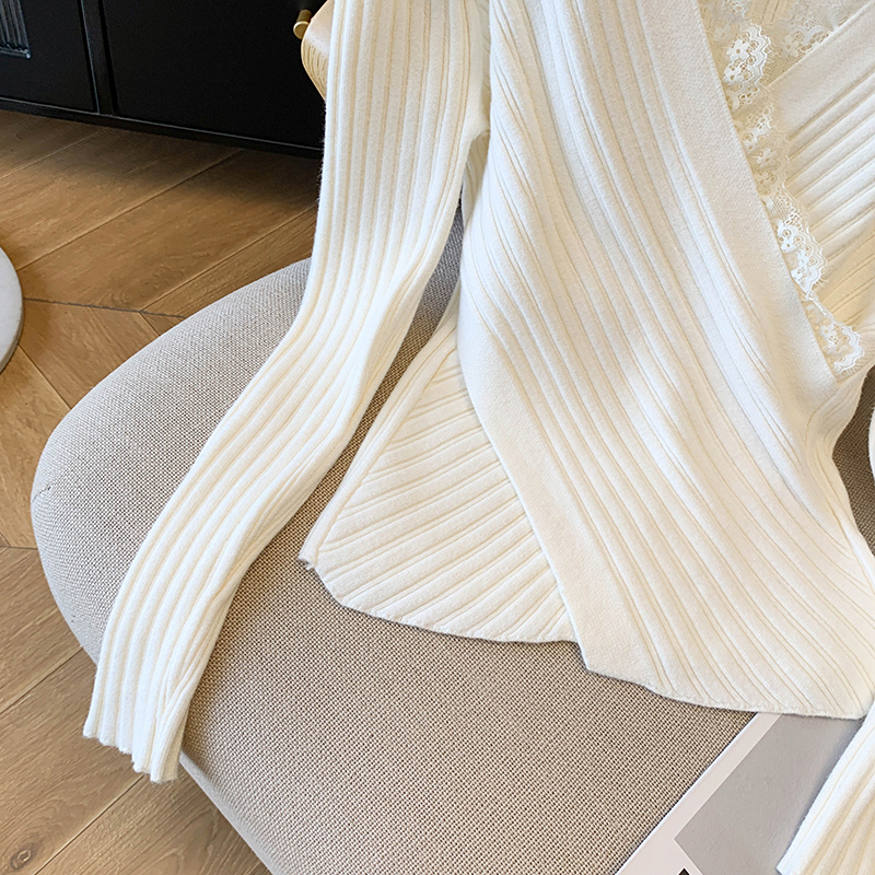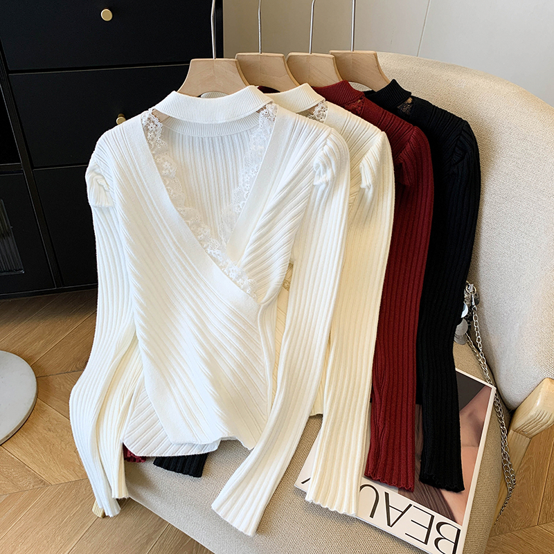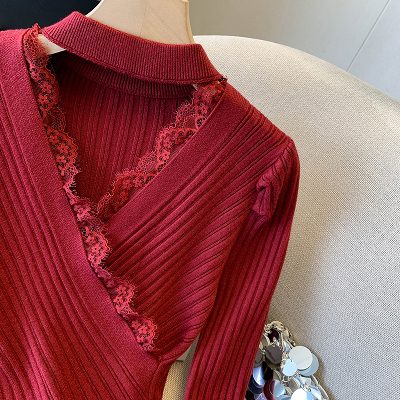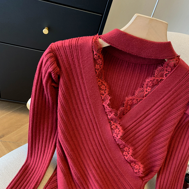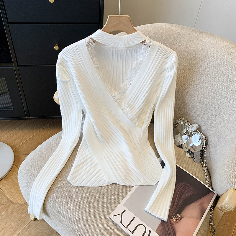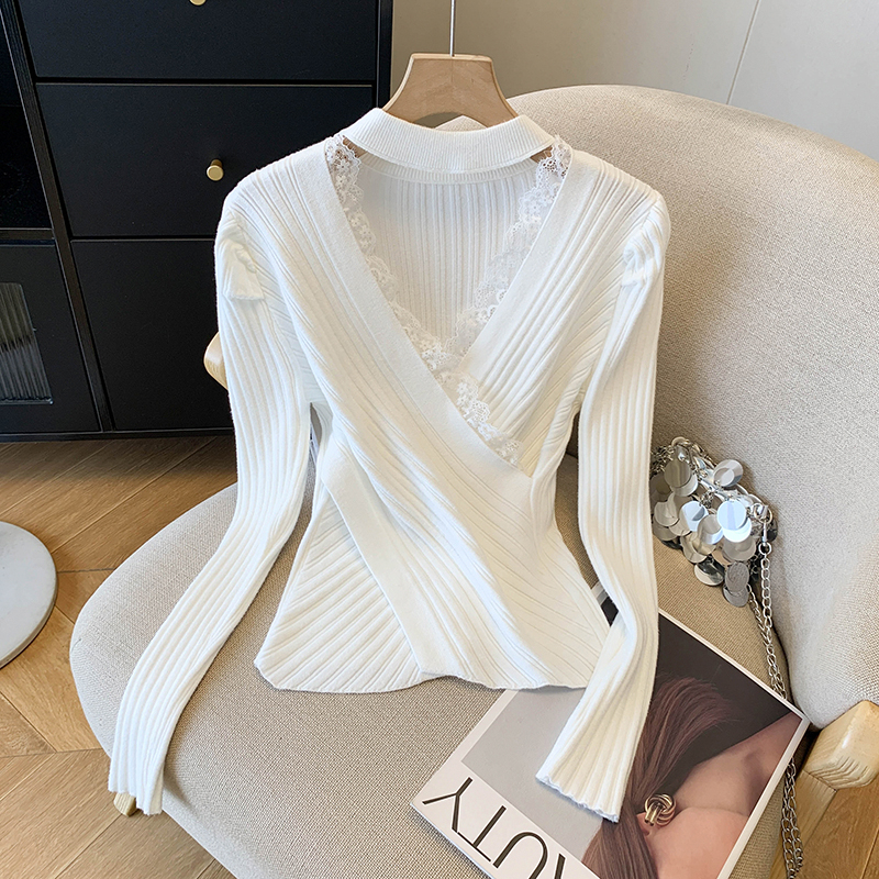 MY15097# 新款蕾丝拼接针织上衣女内搭不规则交叉收腰打底衫女女裝貨源服裝批發