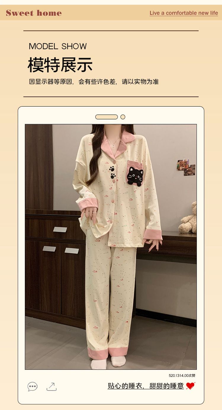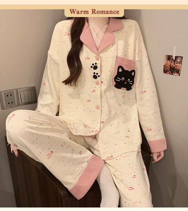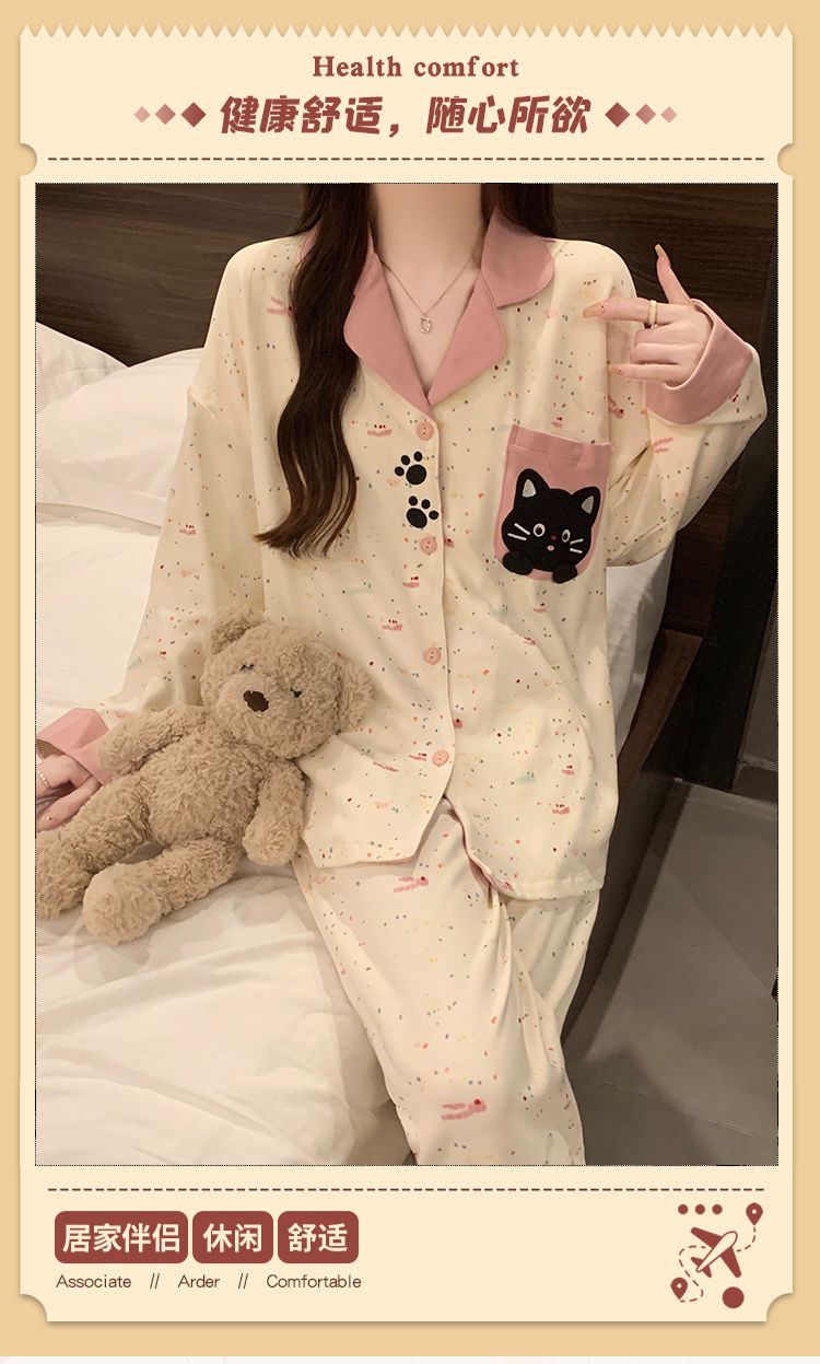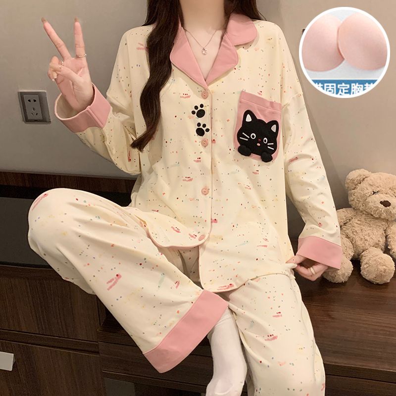 MY15106# 新款带胸垫仿棉睡衣女长袖开衫翻领甜美家居服套装女裝貨源服裝批發