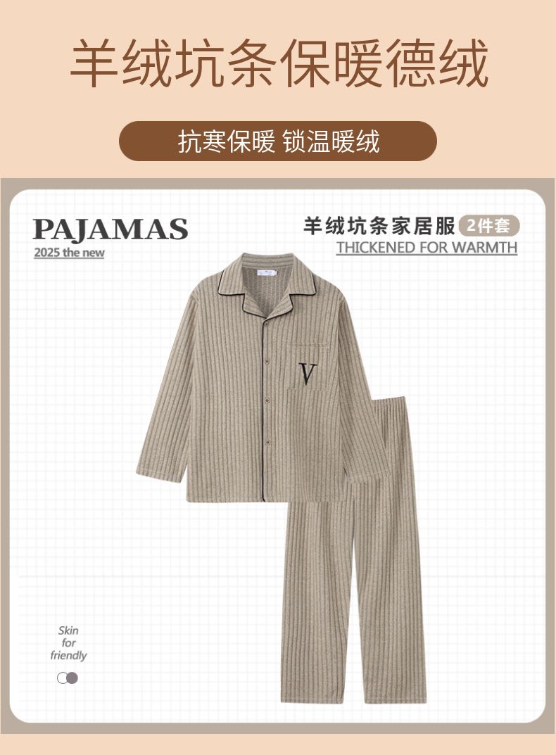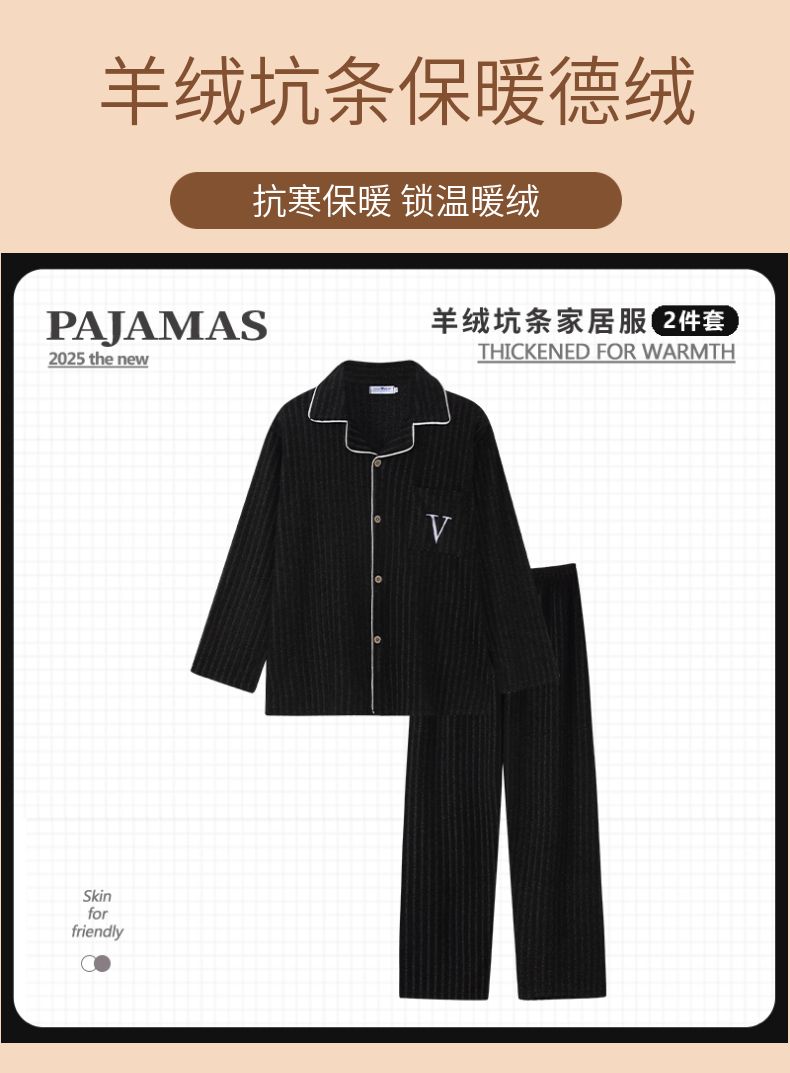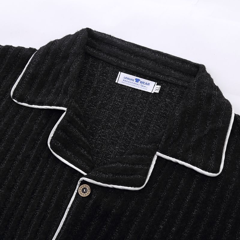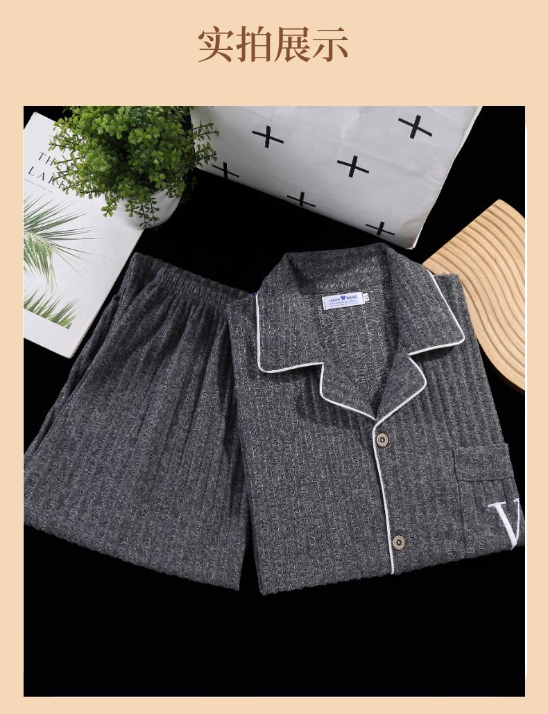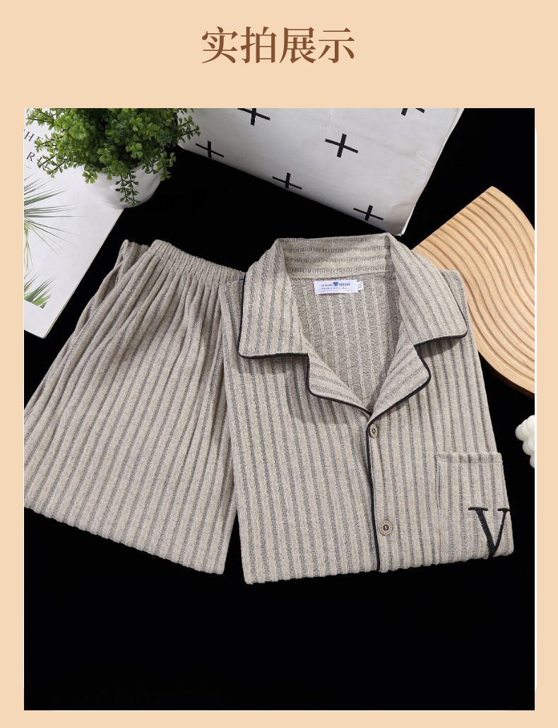 MY15109# 羊绒坑条男士翻领开衫长袖长裤睡衣套装家居服女裝貨源服裝批發