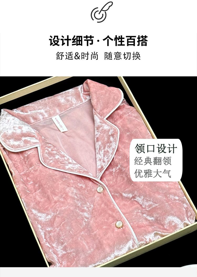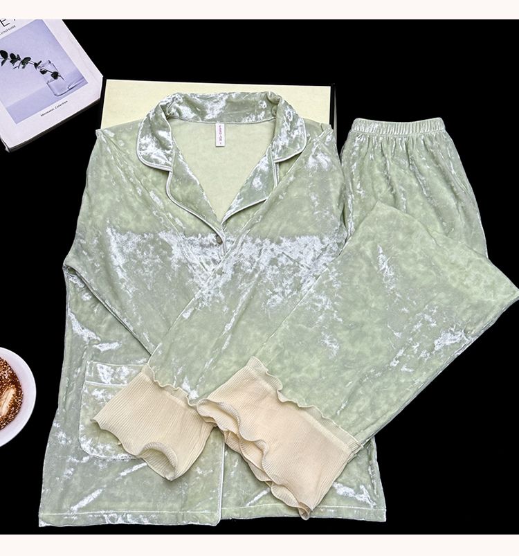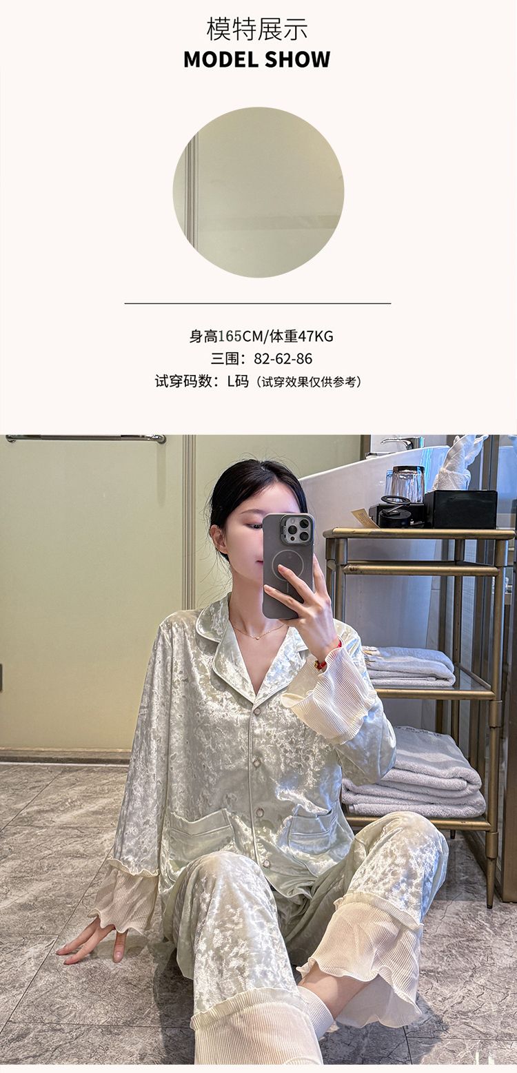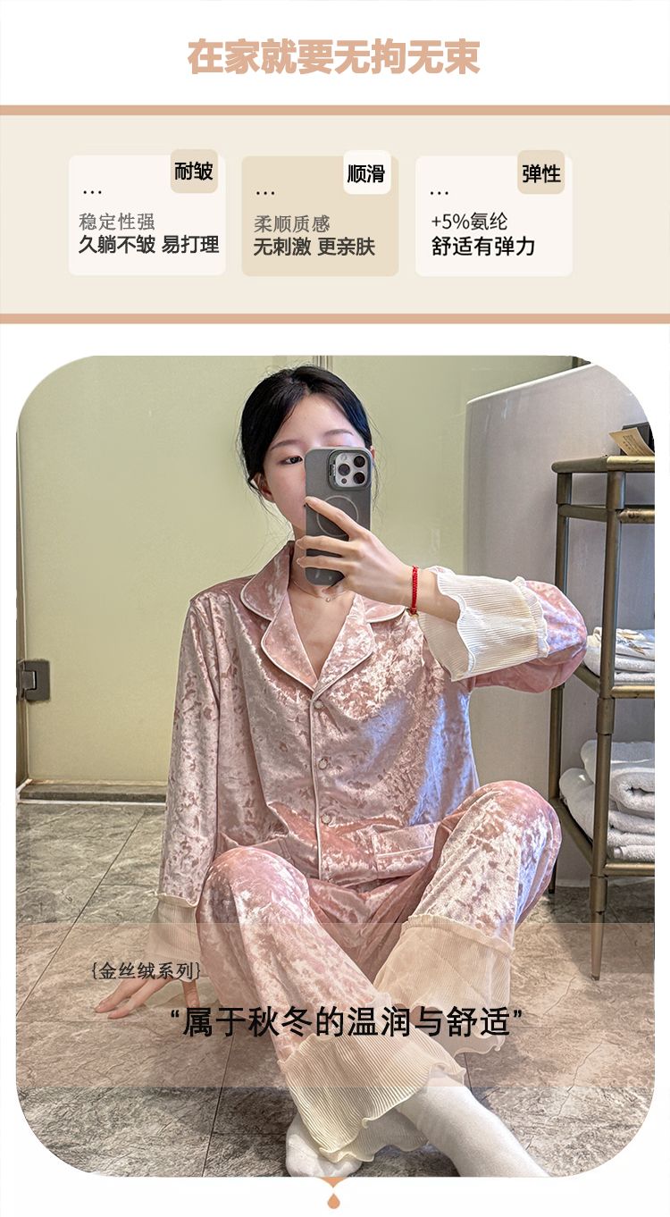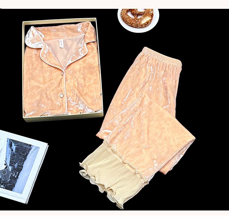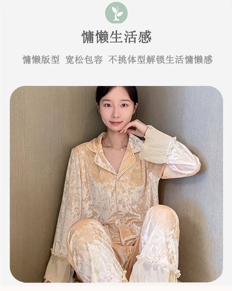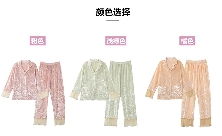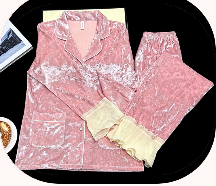 MY15115# 金钻绒蕾丝花边翻领开衫长袖睡衣女套装家居服女裝貨源服裝批發