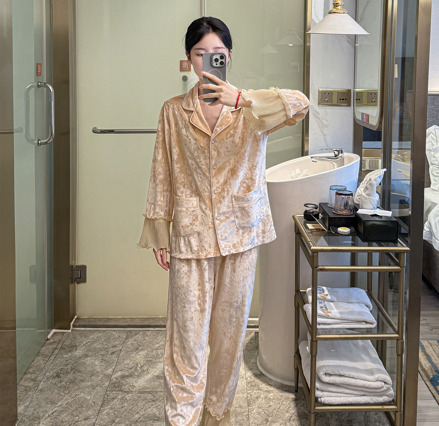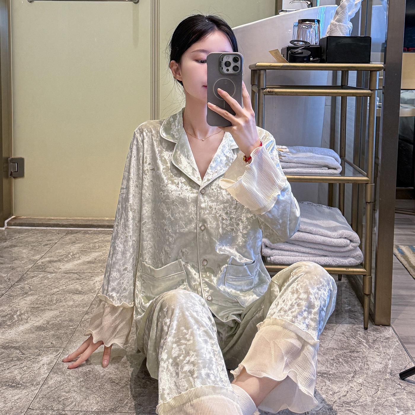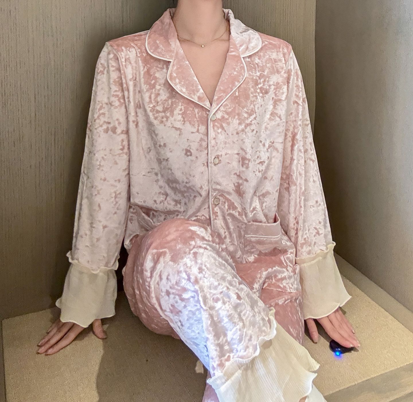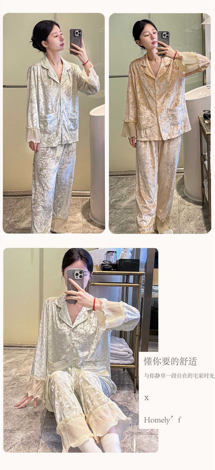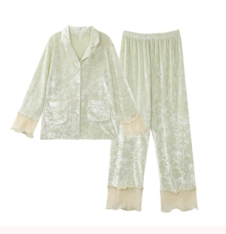 MY15115# 金钻绒蕾丝花边翻领开衫长袖睡衣女套装家居服女裝貨源服裝批發