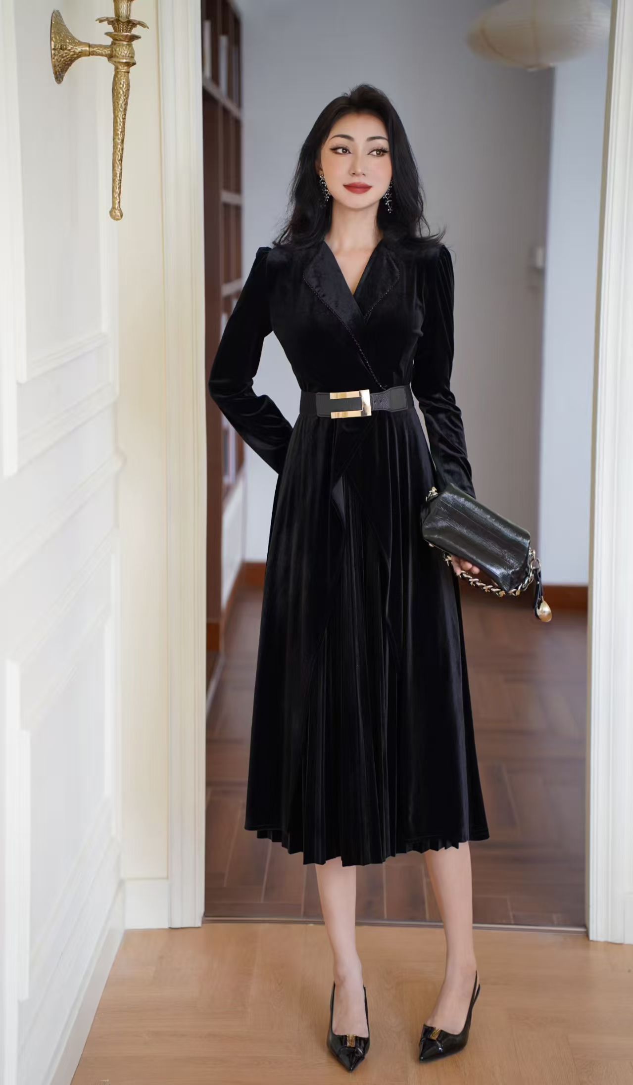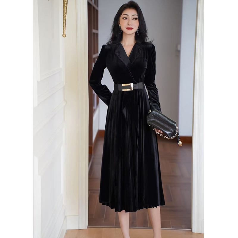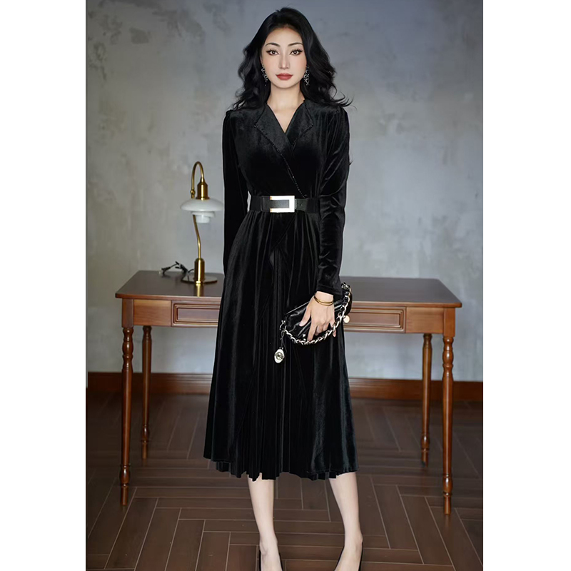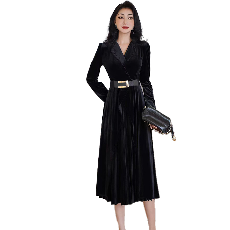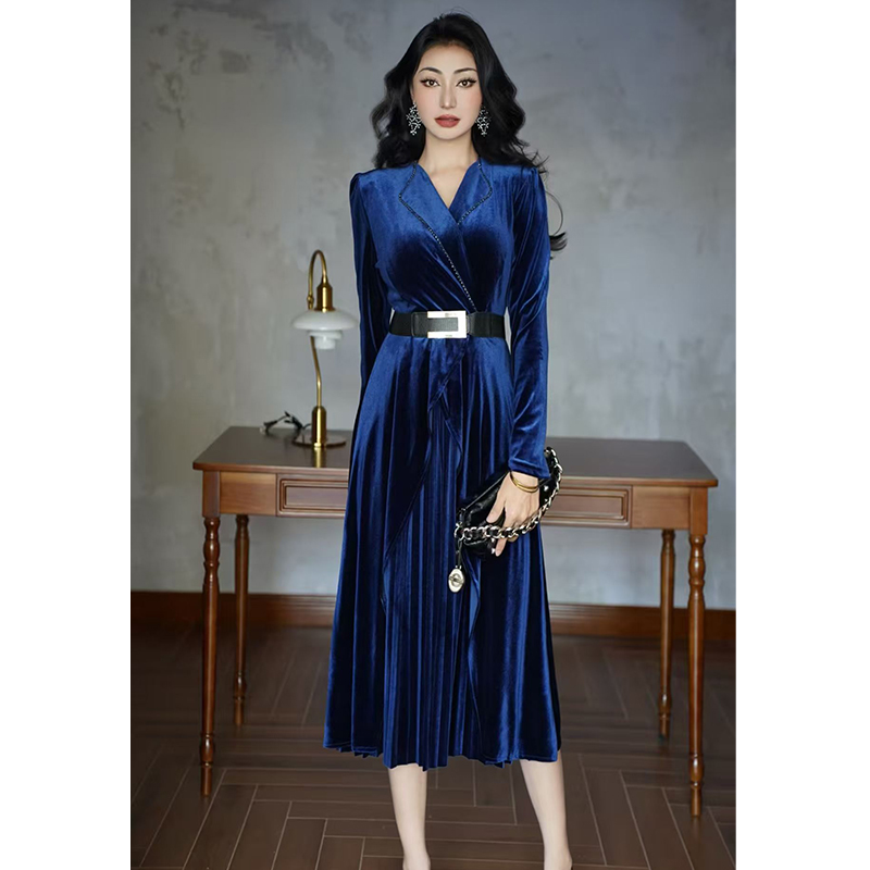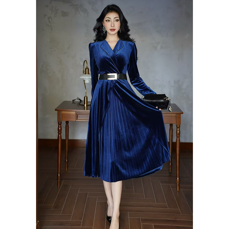 MY15119# 金丝绒连衣裙新款法式高级感气质V领长袖收腰显瘦百褶长裙女裝貨源服裝批發