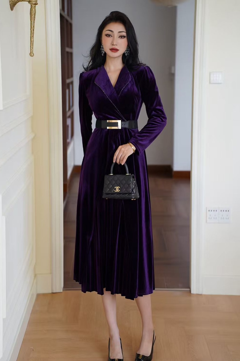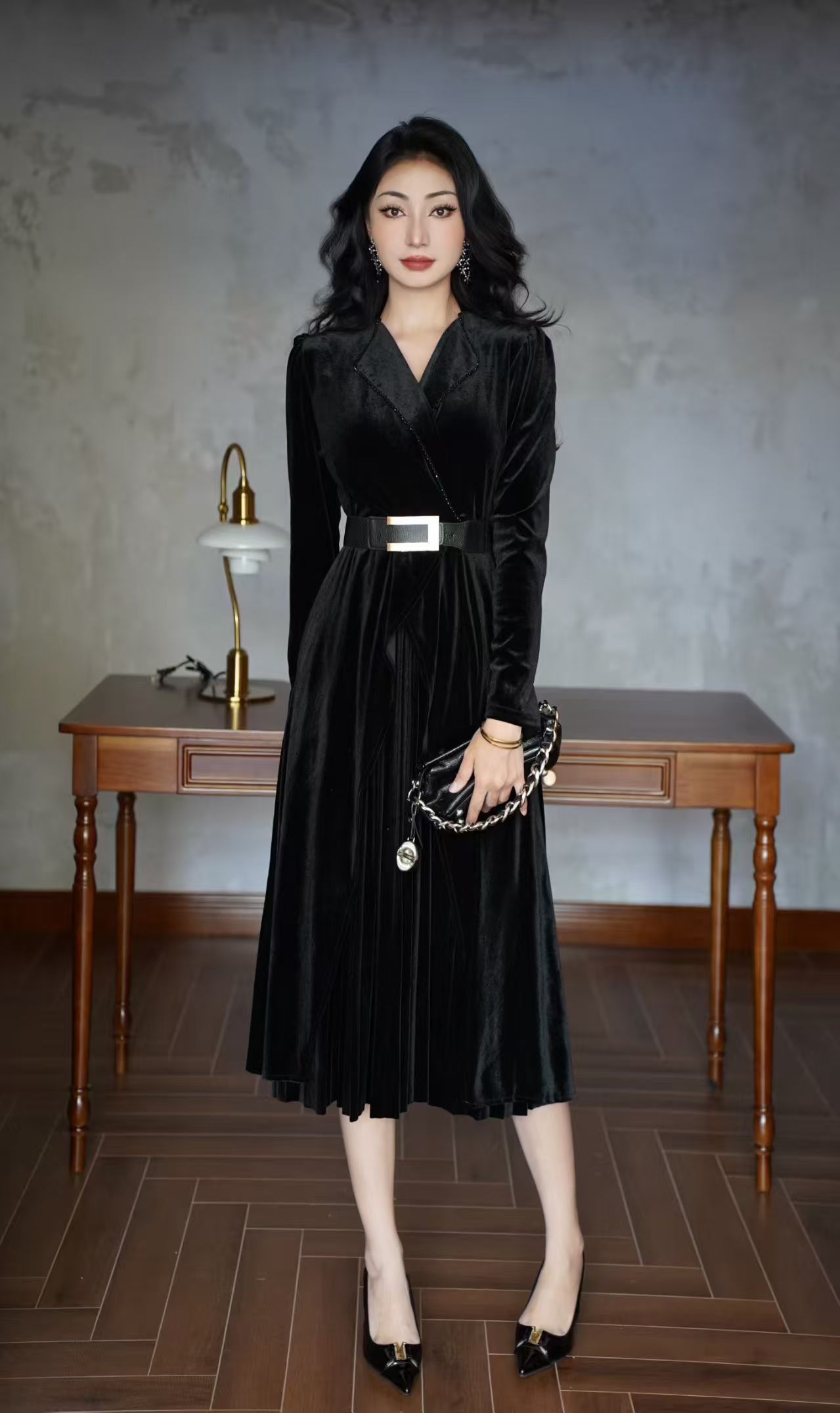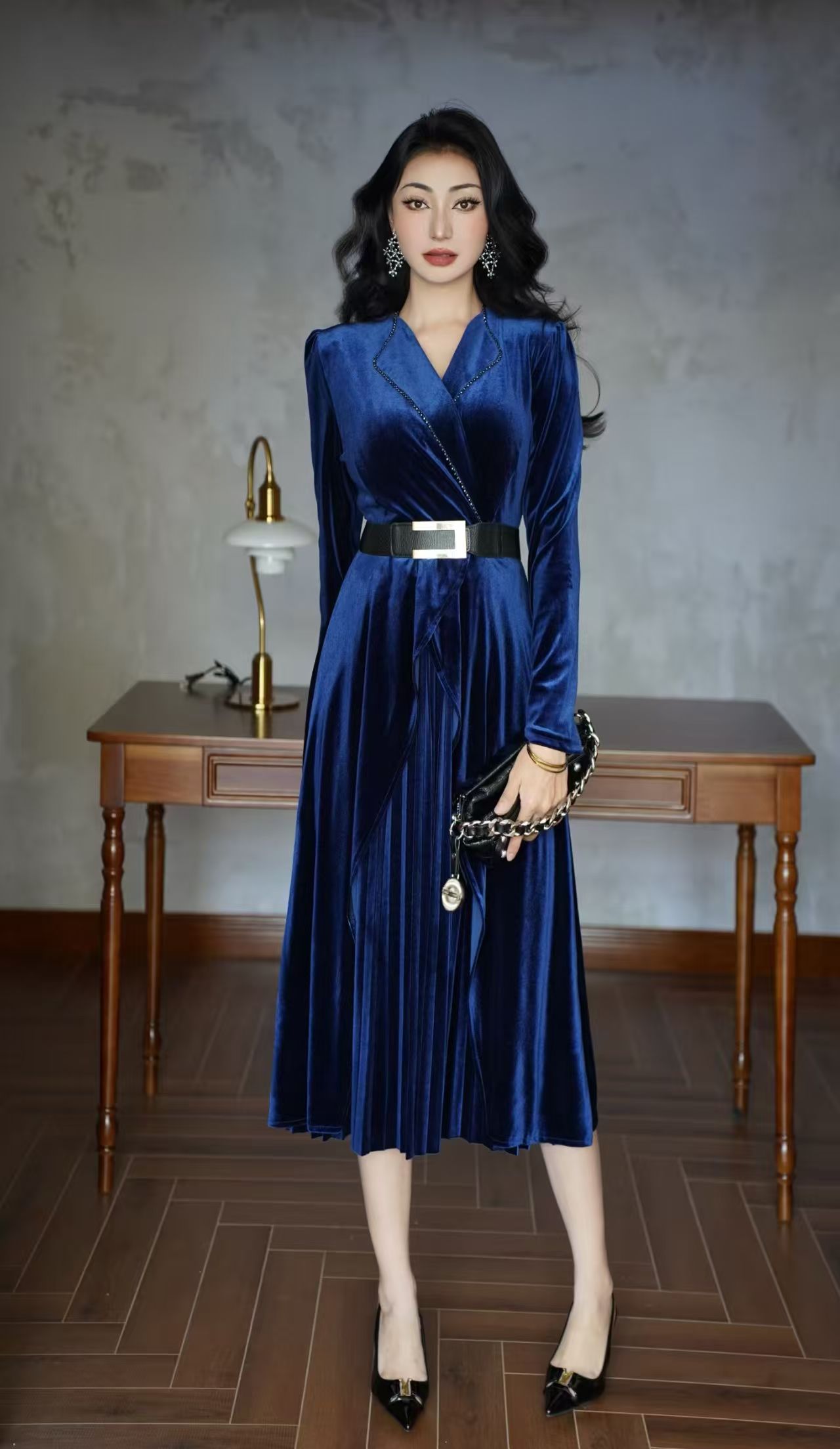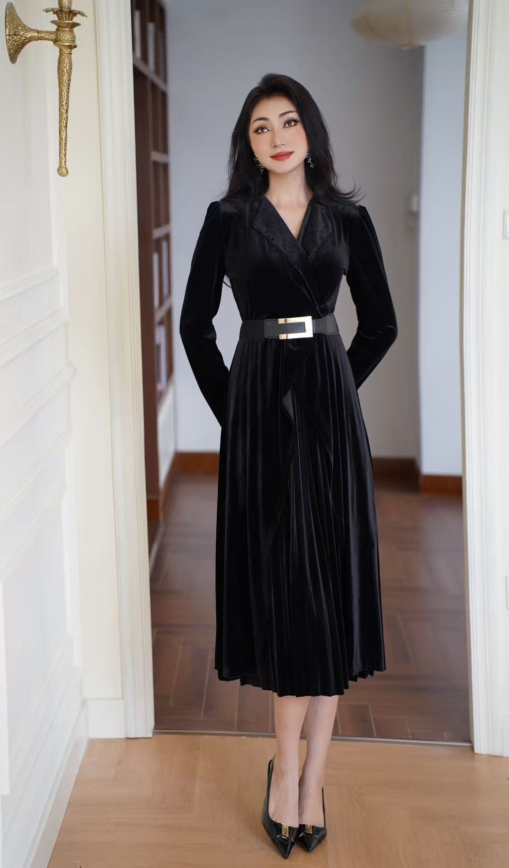 MY15119# 金丝绒连衣裙新款法式高级感气质V领长袖收腰显瘦百褶长裙女裝貨源服裝批發