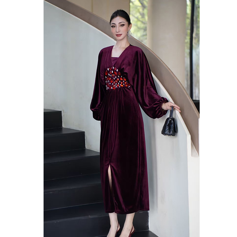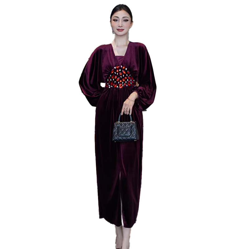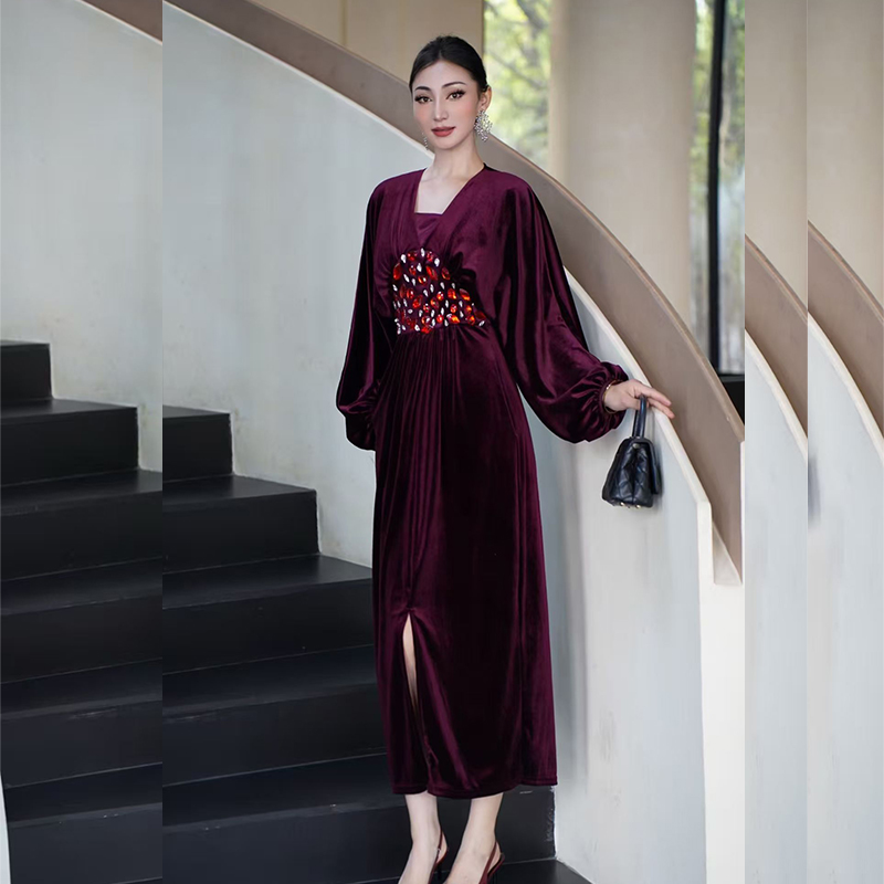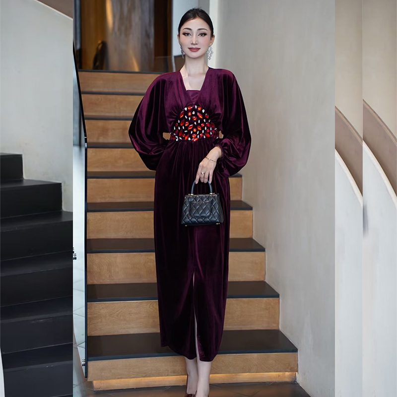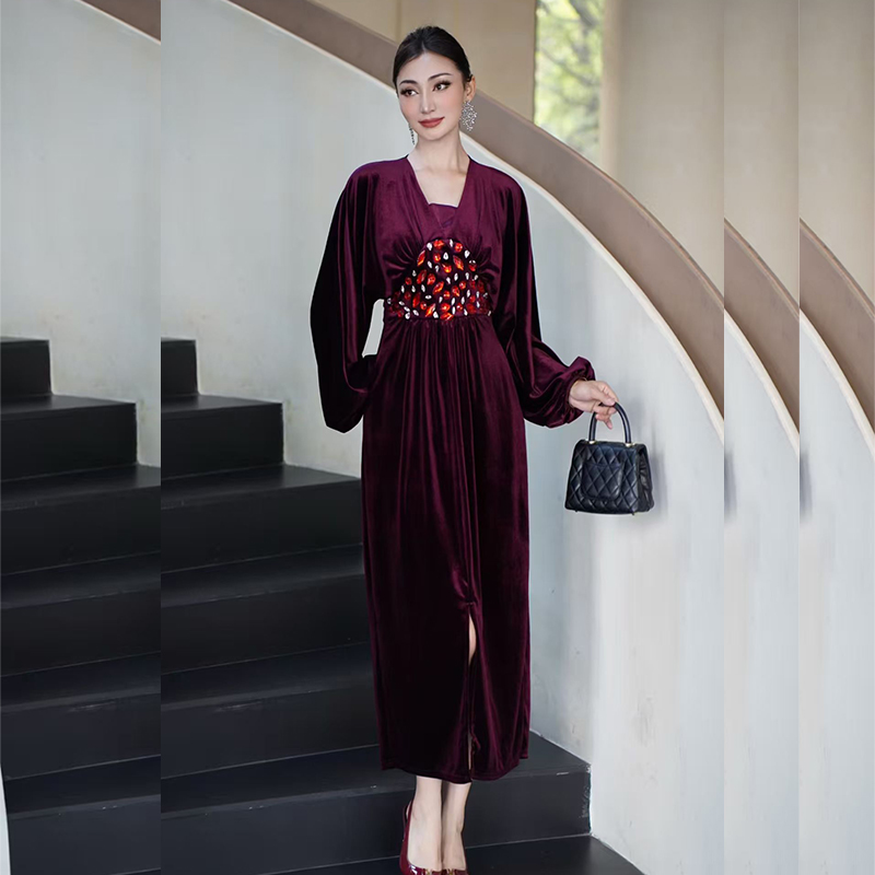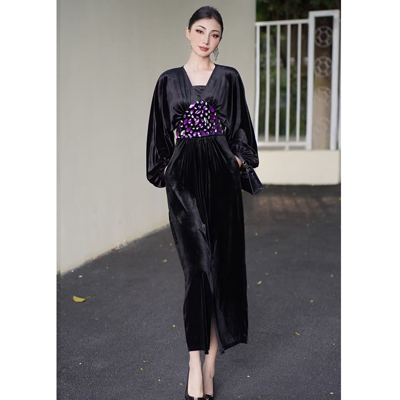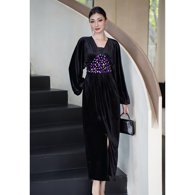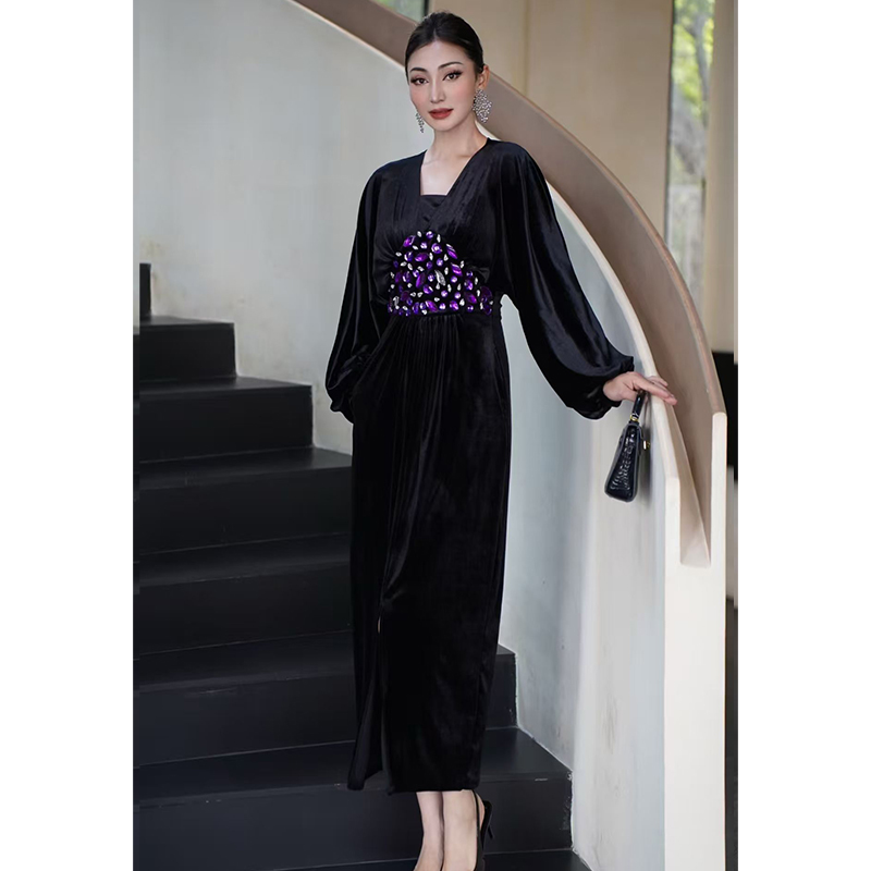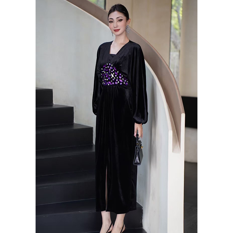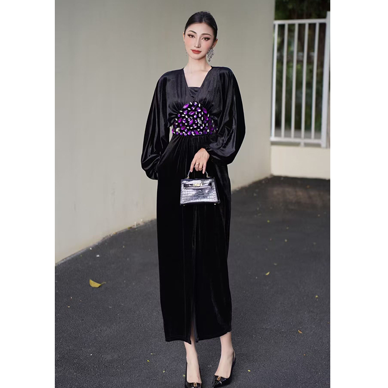 MY15120# 法式轻奢风重工彩钻V领收腰连衣裙高级感气质名媛开叉长裙女裝貨源服裝批發